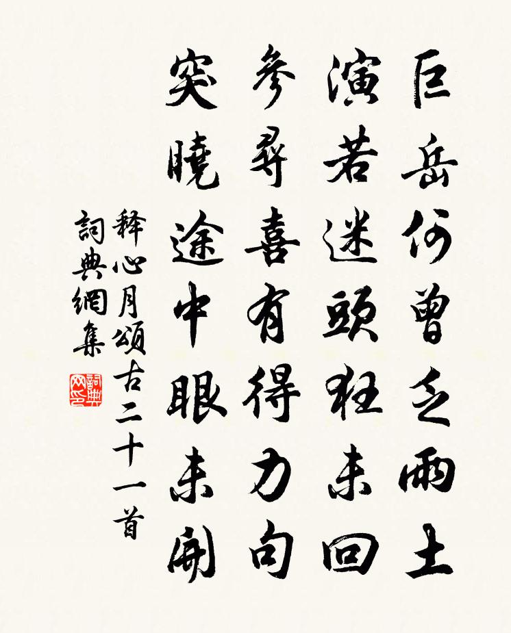 詩詞名句歷史字典書法欣賞書法字典國語詞典說文解字康熙字典古漢語字典標 題 作 者 詩 句 頌古二十一首作者:釋心月 朝代:宋代頌古二十一首原文巨岳何曾乏雨土,演若迷頭狂未回。參尋喜有得力句,突曉途中眼未開。詩詞問答問:頌古二十一首的作者是誰?答:釋心月問:頌古二十一首寫於哪個朝代?答:宋代釋心月頌古二十一首書法欣賞頌古二十一首書法作品詩詞推薦聲聲慢周密〔宋代〕燕泥沾粉,魚浪吹香,芳堤十里新晴。靜惹遊絲,花邊裊裊扶春。多情最憐飄泊,記章台、曾綰青青。堪愛處,是夜宿山庵陳必復〔宋代〕扣宿精廬旋啟扉,佛香未冷坐多時。分僧一半雲歸榻,借竹几些風入詩。隔夢聽鍾疑寺遠,避寒移枕覺宵遲。起看已亥雜詩 49龔自珍〔清代〕東華飛辯少年時,伐鼓撞鐘海內知。牘尾但書臣向校,頭銜不稱閷其詞。代馮元禮次韻送畫山水扇與張次應晁說之〔宋代〕五日十日豈為工,萬壑千岩自絕蹤。在握已能霄漢上,更須群玉占前峰。食蛤蜊呈子駿明叔孔武仲〔宋代〕兩君霜夜兩相過,有酒無希爭奈何。蛤蜊買得雖不多,百枚包以一枯荷。呼奴再濯清泠波,玉石磊落聲相磨。乾薪偈頌一百二十三首釋普度〔宋代〕八十翁翁輥繡球,誰知輥得意休休。如今逗到凌霄上,雲自高飛水自流。句杜偉〔唐代〕忽睹邢武辭,泠其金石備。送誠齋二首袁說友〔宋代〕長裾端欲曳賓墀,人事何乖遽別離。未盡胸中懷舊意,又吟江上送行詩。公名此去如山重,我老誰憐似足踦。憑得夜枕張埴〔宋代〕春風陳榻下,夜月庾樓前。疊疊鳴檛落,翻翻警枕眠。祗能欹待旦,何有夢飛天。此意誰能解,如流二十年。書懷呈曾性之胡仲參〔宋代〕覽鏡嘆頭顱,梅花一樣臞。病因吟後有,愁到醉邊無。心事歸梁燕,年華過隙駒。世途難看腳,況復是江湖。醉中示梅山弟二首陳著〔宋代〕夜鐙曾醉藕花涼,{上竹下鋰}擔歸來雨亦香。閒里不妨長聚首,人生能得幾斜陽。偈頌八首釋宗印〔宋代〕多子塔前,風行草偃。育王門一,正令重行。掀翻舊日規模,從教佛祖乞命。不是第一句,亦非格外機。寸釘才入黃嬰兒侯善淵〔元代〕呆老呆老。幻夢惑迷,一生顛倒。甚每日皺著眉兒,把身心作惱。勸汝回頭歸大道。搜玄微幽奧。煉丹光混入中元【雙調】折桂令_上已游嘉禾喬吉〔元代〕上已游嘉禾南湖歌者為豪奪扣舷自歌鄰舟皆笑三月三天霽吹晴,見麟鳳滄州,鴛鷺沙汀。華鼓清簫,紅雲蘭棹,青鏡龍輔〔宋代〕徐淑古銅鏡,背多青綠花。收藏敢輕慢,曾得照秦嘉。江上逢晁適道崔子方〔宋代〕渺渺連江雨,微微到面風。主人留一餉,佳士得相逢。會面嗟何晚,論詩許有功。君家好兄弟,更覺此心同。贈李安撫徐伉〔宋代〕尚書八座貴,大使十州雄。欲得瘡痍痤,先憐杼軸空。仁民兼愛物,時雨及春風。歸耕陸游〔宋代〕隨牒人間鬢欲疏,歸耕且復補東隅。甑炊地碓新舂米,衣拆天吳舊繡圖。有圃免煩官送菜,叩門翻喜吏徵租。不愁夏侯彥濟武陟主簿梅堯臣〔宋代〕懷縣曾余往,風謠為爾知。寒先太行近,潤接大河卑。賓酒栽公秫,晨羹翦露葵。簿書行正委,何似布衣時。由真隱至枕峰寺喻良能〔宋代〕野外初涼冷,征衫亦未重。檀欒溪上竹,勃窣道邊榕。秋意撩人切,嵐光潑眼濃。更尋天竺寺,卻憶此高峰。名句推薦錦里開芳宴,蘭缸艷早年。盧照鄰《十五夜觀燈》 莫道君行早,更有早行人。佚名《增廣賢文·上集》 秋風生渭水,落葉滿長安。賈島《憶江上吳處士》 扣舷獨嘯,不知今夕何夕。張孝祥《念奴嬌·過洞庭》 古今多少事,都付笑談中。楊慎《臨江仙·滾滾長江東逝水》 折花逢驛使,寄與隴頭人。陸凱《贈范曄詩》 君子惜名,小人愛身。來俊臣《羅織經·保身卷第七》 智用於眾人之所不能知,而能用於眾人之所不能見。王詡《鬼谷子·謀篇》 智欲圓而行欲方,膽欲大而心欲小。程登吉《幼學瓊林·卷三·人事》 草木有本心,何求美人折!張九齡《感遇十二首·其一》