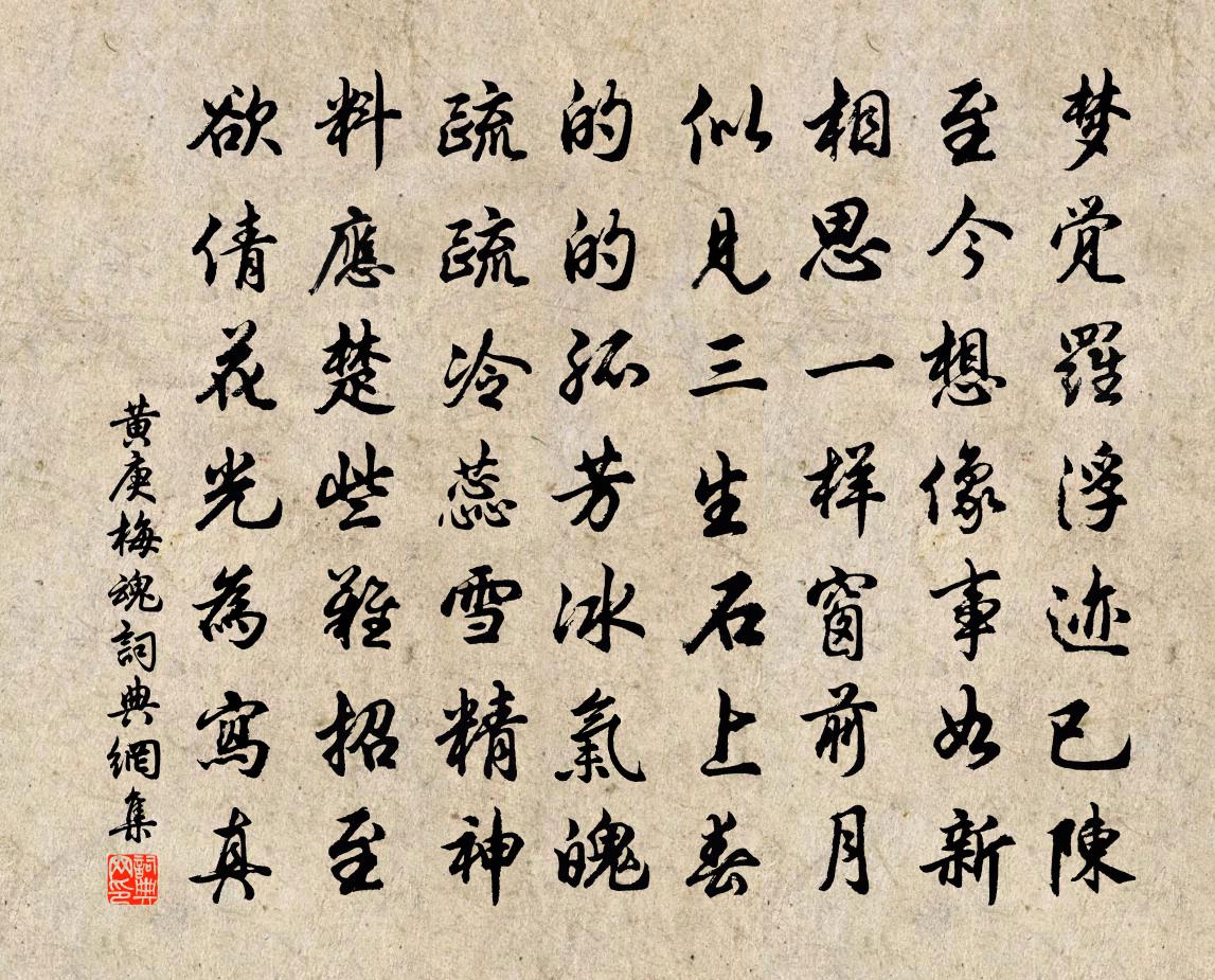 詩詞名句歷史字典書法欣賞書法字典國語詞典說文解字康熙字典古漢語字典標 題 作 者 詩 句 梅魂作者:黃庚 朝代:宋代梅魂原文夢覺羅浮跡已陳,至今想像事如新。相思一樣窗前月,似見三生石上春。的的孤芳冰氣魄,疏疏冷蕊雪精神。料應楚些難招至,欲倩花光為寫真。詩詞問答問:梅魂的作者是誰?答:黃庚問:梅魂寫於哪個朝代?答:宋代黃庚梅魂書法欣賞梅魂書法作品詩詞推薦賈客蘇拯〔唐代〕長帆掛短舟,所願疾如箭。得喪一驚飄,生死無良賤。不謂天不祐,自是人苟患。嘗言海利深,利深不如淺。天香(熏衣香)吳文英〔宋代〕珠絡玲瓏,羅囊閒斗,酥懷暖麝相倚。百和花須,十分風韻,半襲鳳箱重綺。茜垂四角,慵未揭、流蘇春睡。熏度古意六首·其二艾性夫〔宋代〕採蓮莫採花,採花損空房。留房結青子,種作明年香。代季亨二首黃榦〔宋代〕枌榆接影一牛鳴,淑德相傳到後生。三世隻身長婉娩,兩兒雙淚遽縱橫。蘋蘩春澗情何切,機杼秋堂眼明。細讀古次韻舒岳祥〔宋代〕兒時人道是奇童,末路翻成毦{澡氵換耳}翁。燕去燕來催歲月,花開花落共春風。有金斑鬢難重綠,無酒衰顏肯踏莎行·元夕毛滂〔宋代〕撥雪尋春,燒燈續晝。暗香院落梅開後。無端夜 * 遮春,天教月上官橋柳。花市無塵,朱門如繡。嬌雲瑞霧籠星四用韻十首楊公遠〔宋代〕朔風號萬竅,冷色倍三分。榾柮爐偏暖,茅柴酒易醺。烘梅慳愛日,釀雪布彤雲。今是豐年瑞,吾儂政樂聞。象之席上賦得寒字韓維〔宋代〕愛子林亭勝,高秋駐馬鞍。梨紅先著露,竹碧自生寒。慘戚傷多事,淹留強一歡。所嗟怯杯酌,不得倒吾冠。金剛隨機無盡頌莊嚴淨土分第十釋印肅〔宋代〕曾無一法侵,心外更無心。月冷空當午,松寒露滿襟。菩薩蠻晁端禮〔宋代〕遠山眉映橫波臉。臉波橫映眉山遠。雲鬢插花新。新花插鬢雲。斷魂離思遠。遠思離魂斷。門掩未黃昏。昏黃未掩秋晚雲陽驛西亭蓮池許渾〔唐代〕心憶蓮池秉燭游,葉殘花敗尚維舟。煙開翠扇清風曉,水泥紅衣白露秋。神女暫來雲易散,仙娥初去月難留。空懷觀徐復州家書畫七首趙蕃〔宋代〕曠懷誰不作山游,誰似柳州談永州。何能乞我一片石,刻此數紙具傳流。和虞部韋郎中尋楊駙馬不遇獨孤及〔唐代〕金屋瓊台蕭史家,暮春三月渭州花。到君仙洞不相見,謂已 * 乘早霞。寄衣曲羅與之〔宋代〕此身倘長在,敢恨歸無日。但願郎防邊,似妾縫衣密。晚歸藍田,酬王維給事(一作中書常舍人)贈別錢起〔唐代〕卑棲卻得性,每與白雲歸。徇祿仍懷橘,看山免採薇。暮禽先去馬,新月待開扉。霄漢時回首,知音青瑣闈。感遇之廿三陳子昂〔唐代〕翡翠巢南海。雄雌珠樹林。何知美人意。驕愛比黃金。殺身炎州里。委羽玉堂陰。旖旎光首飾。葳蕤爛錦衾。豈不上致用院李同知論海舶熊禾〔宋代〕易經致民用,肇自羲農先。耒耜既生聚,市易還懋遷。公私不交病,本末無倒懸。古人致主術,稱物靡有偏。厥初暇日感懷因寄同院吳蛻拾遺羅隱〔唐代〕璧池清秩訪燕台,曾捧瀛洲札翰來。今日二難俱大夜,當時三幅謾高才。戲悲槐市便便笥,狂憶樟亭滿滿杯。猶幸雜詠十首酬汪鎮卿林景熙〔宋代〕百感湊孤夜,江樓起呼月。秋蟲聲轉悲,念此眾芳歇。人生非金石,青鬢忽已雪。逾淮橘心移。出山泉性汩。猗蘭一剪梅·紅藕香殘玉簟秋李清照〔宋代〕紅藕香殘玉蕈秋,輕解羅裳,獨上蘭舟。雲中誰寄錦書來?雁字回時,月滿西樓。花自飄零水自流。一種相思,兩名句推薦歸雲一去無蹤跡,何處是前期?柳永《少年游·長安古道馬遲遲》 食必常飽,然後求美;衣必常暖,然後求麗劉向《說苑·反質》 一叢萱草,幾竿修竹,數葉芭蕉。石孝友《眼兒媚·愁雲淡淡雨瀟瀟》 天勢圍平野,河流入斷山。暢當《登鸛雀樓》 君子以成德為行,日可見之行也。佚名《易傳·文言傳·乾文言》 千磨萬擊還堅勁,任爾東西南北風。鄭燮《竹石》 浮雲遊子意,落日故人情。李白《送友人》 古剎疏鍾度,遙嵐破月懸。李賀《南園十三首》 雲物不殊鄉國異,教兒且覆掌中杯。杜甫《小至》 北客翩然,壯心偏感,年華將暮。朱敦儒《水龍吟·放船千里凌波去》