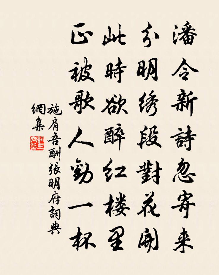 詩詞名句歷史字典書法欣賞書法字典國語詞典說文解字康熙字典古漢語字典標 題 作 者 詩 句 酬張明府作者:施肩吾 朝代:唐代酬張明府原文潘令新詩忽寄來,分明繡段對花開。此時欲醉紅樓里,正被歌人勸一杯。詩詞問答問:酬張明府的作者是誰?答:施肩吾問:酬張明府寫於哪個朝代?答:唐代問:酬張明府是什麼體裁?答:七絕施肩吾酬張明府書法欣賞酬張明府書法作品注釋全唐詩:卷494-183詩詞推薦秋祀高禖二絕蘇轍〔宋代〕乾德年中初一新,頹坦破瓦委荊榛。興亡舉墜干戈際,閒暇方知國有人。春日書懷虞儔〔宋代〕吳興太守也堪憐,十日齋廚九不煙。索漠清懷寒食夜,顛狂風雨落花天。流鶯百囀還求友,化鶴重來不是仙。待得偈傾一百三十三首釋法薰〔宋代〕九夏安居,眉毛廝結。一人發真歸源,十方虛空迸裂。句蕭貫〔宋代〕十二嶢關隱空綠,獸猊呼焰椒壁馥。渴烏涓涓不相續,轆轤欲轉霏紅玉。百刻香殘隕蓮燭,九龍吐水漫寒漿。紅綃急樂世白居易〔唐代〕正抽碧線繡紅羅,忽聽黃鶯斂翠娥。秋思冬愁春恨望,大都不得意時多。酬二十八秀才見寄郎士元〔唐代〕昨夜山月好,故人果相思。清光到枕上,裊裊涼風時。永意能在我,惜無攜手期。野步許棠〔唐代〕閒賞步易遠,野吟聲自高。路無人到跡,林有鶴遺毛。物外趣都別,塵中心枉勞。沿溪收墮果,坐石喚飢猱。偈頌七十六首釋師範〔宋代〕蜻蜓許是好蜻蜓,飛來飛去不曾停。捉來摘除兩個翼,便是一枚大鐵釘。偈釋普融〔宋代〕二女合為一媳婦,機輪截斷雞回互。從來往返絕蹤由,行人莫問老時路。夢仙韓偓〔唐代〕紫霄宮闕五雲芝,九級壇前再拜時。鶴舞鹿眠春草遠,山高水闊夕陽遲。每嗟阮肇歸何速,深羨張騫去不疑。澡練至望喜矚目言懷貽劍外知己盧照鄰〔唐代〕聖圖夷九折,神化掩三分。緘愁赴局道,題拙奉虞黛。熄鱗度深谷,遙裊上高雲。碧流遞索注,青山互糾紛。澗松窮老陸游〔宋代〕窮老寧須嘆,吾生得已多。風埃棄朝幘,煙雨弄漁蓑。富屋烏爰止,閒門爵可羅。人生只此是,得酒且高歌。任賢良歸蜀高似孫〔宋代〕袞袞江來急建瓴,一西還有幾長亭。峨眉雪罷添巴水,玉壘雲空見蜀星。白浪不侵魚復陣,青苔猶護劍關銘。堂堂真娘墓林景熙〔宋代〕歌聲舞影散春霞,月殉香魂幾落花。休恨天家無分到,漢妃青冢落胡沙。方蒙仲秘書哀詩三首劉克莊〔宋代〕方喜燃藜向石渠,豈知僅擁兩輪朱。非為郡失好太守,便恐世無行秘書。酒漬雙雞慚薄薄,表論一鶚謾區區。即今歸隱嵩陽張詠〔宋代〕浮世事無限,何須要到頭。壯心為客盡,孤跡臥雲休。匣劍已全棄,林僧亦少酬。從來愁恨意,乞待外人愁。賢者之孝二百四十首狄仁傑林同〔宋代〕狄和使絕域,柳甘易播州。為憐劉母在,深恐鄭親憂。和杜樞密雪吳泳〔宋代〕紫宸朝動雞人唱,一片天光接絳河。花樣繡韉沖曉去,霙鋪毬路帶春多。邊無疋馬比寧地,土有遺蝗奈凍何。檠重山居寂寥與世如隔是非不到榮辱兩忘因憶秋崖吳錫疇〔宋代〕我愛山居好,乾坤自在身,林泉睎隱士,風月謚閒人。村釀添春困,庖蔬勝鼎珍。幾攜蓑笠去,保社在鷗津。六祖夜渡贊釋妙倫〔宋代〕樹煙漠漠水沈沈,父子相拋用賊心。授了衣盂連夜渡,釘椿搖櫓到於今。名句推薦治則衍及百姓,亂則不足及王公。荀子《荀子·君道》 灞涘望長安,河陽視京縣。謝朓《晚登三山還望京邑》 此情無計可消除,才下眉頭,卻上心頭。李清照《一剪梅·紅藕香殘玉簟秋》 一枝紅杏出牆頭,牆外行人正獨愁。吳融《途中見杏花》 懷春情不斷,猶帶相思舊子。吳文英《丁香結·夷則商秋日海棠》 戎馬關山北,憑軒涕泗流。杜甫《登岳陽樓》 廣陵城裡昔繁華,煬帝行宮接紫霞。曾棨《維揚懷古》 寄書長不達,況乃未休兵。杜甫《月夜憶舍弟》 離恨恰如春草,更行更遠還生。李煜《清平樂·別來春半》 今宵剩把銀釭照,猶恐相逢是夢中。晏幾道《鷓鴣天·彩袖殷勤捧玉鍾》