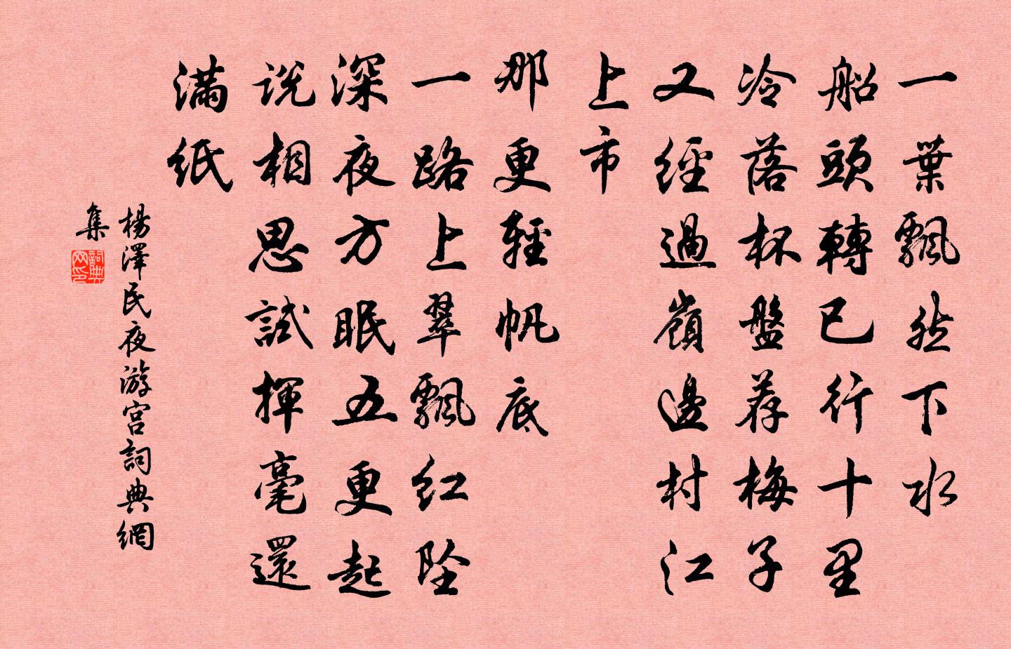詩詞名句歷史字典書法欣賞書法字典國語詞典說文解字康熙字典古漢語字典標 題 作 者 詩 句 夜遊宮作者:楊澤*民 朝代:宋代夜遊宮原文一葉飄然下水。船頭轉、已行十里。冷落杯盤薦梅子。又經過,嶺邊村,江上市。那更輕帆底。一路上、翠飄紅墜。深夜方眠五更起。說相思,試揮毫,還滿紙。詩詞問答問:夜遊宮的作者是誰?答:楊澤*民問:夜遊宮寫於哪個朝代?答:宋代問:夜遊宮是什麼體裁?答:詞楊澤*民夜遊宮書法欣賞夜遊宮書法作品詩詞推薦古意鮑溶〔唐代〕女蘿寄青松,綠蔓花綿綿。三五定君婚,結髮早移天。肅肅羔雁禮,泠泠琴瑟篇。恭承采蘩祀,敢效同車賢。皎日自勉李覯〔宋代〕月欲東生日又西,莫隨兒女醉明時。黃泉一向埋愚鬼,不與人間史筆知。人月圓 春日湖上 北曲聊樂府前集今張可久〔元代〕東風西子湖邊路,白髮強尋春。盡教年少,金鞭俊影,羅帕香塵。蹇驢破帽,荒池廢苑,流水閒雲。惱余歸思,花滿江紅楊 * 〔宋代〕裊娜身材,經行處、金蓮涉足。晨妝罷,黛眉新暈,素腰如束。丹臉勻紅香在臂,秀肌膩滑涼生肉。記那回、同賭白日偶無客青山長對門韓淲〔宋代〕身心既已閒,吟風興亦偶。山東打茶聲,睡思忽抖擻。問卜崔塗〔唐代〕承家望一名,幾欲問君平?自小非無志,何年即有成。豈能長失路,爭忍學歸耕?不擬逢昭代,悠悠過此生。留贈杜牧〔唐代〕舞靴應任閒人看,笑臉還須待我開。不用鏡前空有淚,薔薇花謝即歸來。太傅相公以梅聖俞寄和建茶詩垂示俾次前韻蘇頌〔宋代〕近來不貴蜀吳茶,為有東溪早露芽。二月製成輸御府,經時猶未到人家。太官供罷頒三吏,東合開時詠九華。從此送熊掌熊白葉寘〔宋代〕熊掌舍魚吾有取,自幼嘗聞子車語。飯香獵戶分熊白,妙語涪翁乃能吐。世間兩味果稱珍,故人念我肯珍分。數千真娘墓林景熙〔宋代〕歌聲舞影散春霞,月殉香魂幾落花。休恨天家無分到,漢妃青冢落胡沙。和宋永兄罷官還家途中見寄四絕黃公度〔宋代〕三年惠政留岩邑,千里歸舟犯惡灘。烏鵲信傳知漸近,白鷗盟在未應寒。述夢詩四十韻李德裕〔唐代〕賦命誠非薄,良時幸已遭。君當堯舜日,官接鳳凰曹。目睇煙霄闊,心驚羽翼高。椅梧連鶴禁,壀堄接龍韜。我後和查仲文雪中即席所賦張栻〔宋代〕方帽沖泥有客來,九衢俗眼莫驚猜。一樽相對十年外,兩腳新從萬里回。壯志未隨衰鬢改,孤懷良為故人開。雪中贈嚴童子(嚴司空孫字照郎十歲能賦詩往往有奇句)元稹〔唐代〕衛瓘諸孫衛玠珍,可憐雛鳳好青春。解拈玉葉排新句,認得金環識舊身。十歲佩觿嬌稚子,八行飛札老成人。楊公初見淮山梅堯臣〔宋代〕遊宦久去國,扁舟今始還。朝來汴口望,喜見淮上山。斷嶺碧峰出,平沙白鳥閒。南歸不厭遠,況在水雲間。呈陳深交二首趙蕃〔宋代〕役役到番國,悠悠誰故人。僧房半牢落,湖水失清淪。我豈倚樓趙,君真驚座陳。何為辱傾倒,相與盡情親。木犀四首趙蕃〔宋代〕細看秋露黃金蕊,不減春風白玉枝。人道江南富山水,江南山水富於斯。南歌子·懶拂鴛鴦枕溫庭筠〔唐代〕懶拂鴛鴦枕,休縫翡翠裙。羅帳罷爐熏。近來心更切,為思君。九日閒居寄登高數子錢起〔唐代〕初服棲窮巷,重陽憶舊遊。門閒謝病日,心醉授衣秋。酒盡寒花笑,庭空暝雀愁。今朝落帽客,幾處管弦留。西山寒溪張耒〔宋代〕茲行頗閒暇,聊此山水間。幸有所攜人,臭味同一源。山溪並修澗,嘉木間蒲蓮。杉松鳴古剎,始覺此溪寒。孤亭名句推薦草鋪橫野六七里,笛弄晚風三四聲。呂岩《牧童》 父老得書知我在,小軒臨水為君開。蘇軾《送賈訥倅眉》 猶喜閏前霜未下,菊邊依舊舞身輕。司空圖《白菊三首》 不愁屋漏床床濕,且喜溪流岸岸深曾幾《蘇秀道中》 阿香秋夢起嬌啼,玉女傳幽素。吳文英《燭影搖紅·越上霖雨應禱》 棲霞山裂;沂水陷穴,廣數畝蒲松齡《地震》 善政得民財,善教得民心。孟子《孟子·盡心章句上·第十四節》 君子不蔽人之美,不言人之惡。韓非及後人《韓非子·內儲說上七術》 北風吹白雲,萬里渡河汾。蘇頲《汾上驚秋》 人方為刀俎,我為魚肉司馬遷《史記·項羽本紀》