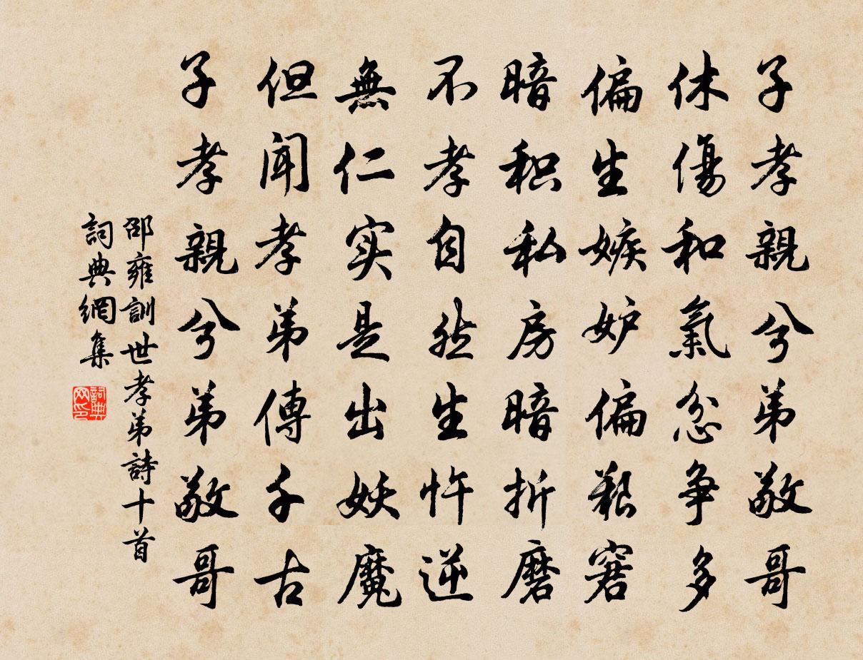 詩詞名句歷史字典書法欣賞書法字典國語詞典說文解字康熙字典古漢語字典標 題 作 者 詩 句 訓世孝弟詩十首作者:邵雍 朝代:宋代訓世孝弟詩十首原文子孝親兮弟敬哥,休傷和氣忿爭多。偏生嫉妒偏艱窘,暗積私房暗折磨。不孝自然生忤逆,無仁實是出妖魔。但聞孝弟傳千古,子孝親兮弟敬哥。詩詞問答問:訓世孝弟詩十首的作者是誰?答:邵雍問:訓世孝弟詩十首寫於哪個朝代?答:宋代邵雍訓世孝弟詩十首書法欣賞訓世孝弟詩十首書法作品詩詞推薦句蔡雍〔宋代〕滿前青嶂千屏列,直下澄江一帶橫。玉蝶泉張珪〔宋代〕仙人修煉地,玉井著神功。日月雙輪見,陰陽兩竅通。可堪清澈底,那更施無窮。尚冀丹砂力,當澆塵念空。子野雪後寄和卻寄廷玉仇遠〔宋代〕素琴掛壁已多時,政爾難逢種子期。腹有精神方學道,面無塵土始言詩。山童隔壁沽村醖,田叟登門送墓碑。小市贈思溪覺悟寺淨因師李洪〔宋代〕思溪渺渺泛蘭舟,檥棹臨津得自留。蓮社不知三伏熱,竹林獨占一庭秋。蒲葵喜接高人語,茗盌能消旅客愁。所恨句齊唐〔宋代〕偃藩唯覺訟鈴虛。和叔振曉上梅坡小亭史彌寧〔宋代〕巡檐詩袖漲寒香,日炙南枝泫曉霜。淨洗宮妝轉明潔,恰如湯餅試何郎。和微之宴景仁新第韓維〔宋代〕華構經營不日成,宛如圖畫著丹青。溫貂密坐浮香篆,綠蟻盈斟照弁星。得地新篁皆嫋嫋,凌霜修檜自亭亭。祝公華清宮和杜舍人張祜〔唐代〕五十年天子,離宮舊粉牆。登封時正泰,御宇日初長。上位先名實,中興事憲章。舉戎輕甲冑,餘地取河湟。道帝頌十玄談塵異釋印肅〔宋代〕誰言卞璧無人鑒,但辦肯心終不賺,燎卻眉毛尚不知,詢岐欲往西天際。和傅侍郎鹿鳴宴韻二首劉宰〔宋代〕先生讜論在延英,早歲金甌已覆名。自古正人羞枉尺,祗今公論有持衡。九重聞道將飛韶,一水何妨緩作程。莫笑五月間與正仲立耕養堂前見石榴一花吐初因以舒岳祥〔宋代〕石屏溪上晚風柔,深念沉思註易樓。好酒自能和性氣,閒愁何必上眉頭。十風五雨天常順,萬綠一紅春更留。灶婢戲聯疊韻體白玉蟾〔宋代〕兩槳往莽蒼,弓蓬窮空濛。偃僂苦怒雨,窮窿通雄風。美茝迤麗紫,叢楓朦朧紅。彼美綺里子,終同隆中翁。豐樂亭遊春·其三歐陽修〔宋代〕紅樹青山日欲斜,長郊草色綠無涯。遊人不管春將老,來往亭前踏落花。偶書楊簡〔宋代〕無聲之樂聞四方,純德孔明即就將。哀樂相生不可見,衾衾非燠箑非涼。秋毫莫大泰山小,殤子上壽彭祖夭。入門閏月二日始開北窗籬門張嵲〔宋代〕夏郊群樹綠冥冥,北戶今朝又脫扃。極目不知何所詣,三年於此看縈青。昨以拙詩十首寄西川杜相公,相公亦以新作十白居易〔唐代〕詩家律手在成都,權與尋常將相殊。剪截五言兼用鉞,陶鈞六義別開爐。驚人捲軸須知有,隨事文章不道無。篇數上方銛老求宿蘆詩宿蘆蓋所寓室名以其似漁舟陸游〔宋代〕一曲亭前水接天,放翁短棹弄風煙。宿蘆縱有江湖趣,猶是人間贗釣船。水龍吟(黃慶長夜泛鑑湖,有懷歸之曲,課予和之)姜夔〔宋代〕夜深客子移舟處,兩兩沙禽驚起。紅衣入漿,青燈搖浪,微涼意思。把酒臨風,不思歸去,有如此水。況茂林游倦江湖偉觀葉茵〔宋代〕此地舊寒碧,留題護竹君。窗虛不礙月,壁老易生雲。一水東西隔,兩山南北分。未堪低著眼,世事正紛紛。問法釋雲岫〔宋代〕乾陀國裹舊城河,遙憶河邊棗樹花。白象系來年代遠,榮枯今日事如何。名句推薦世事短如春夢,人情薄似秋雲。朱敦儒《西江月·世事短如春夢》 萬壑有聲含晚籟,數峰無語立斜陽。王禹偁《村行·馬穿山徑菊初黃》 秋風吹不盡,總是玉關情。李白《子夜吳歌·秋歌》 風雨牢愁無著處,那更寒蛩四壁。文天祥《酹江月·和友驛中言別》 夜來攜手夢同游,晨起盈巾淚莫收。白居易《夢微之》 他鄉生白髮,舊國見青山。司空曙《賊平後送人北歸》 燈火紙窗修竹里,讀書聲。陳繼儒《浣溪沙·初夏夜飲歸》 國將興,必貴師而重傅荀子《荀子·大略》 青青一樹傷心色,曾入幾人離恨中。白居易《青門柳》 宮粉雕痕,仙雲墮影,無人野水荒灣。吳文英《高陽台·落梅》