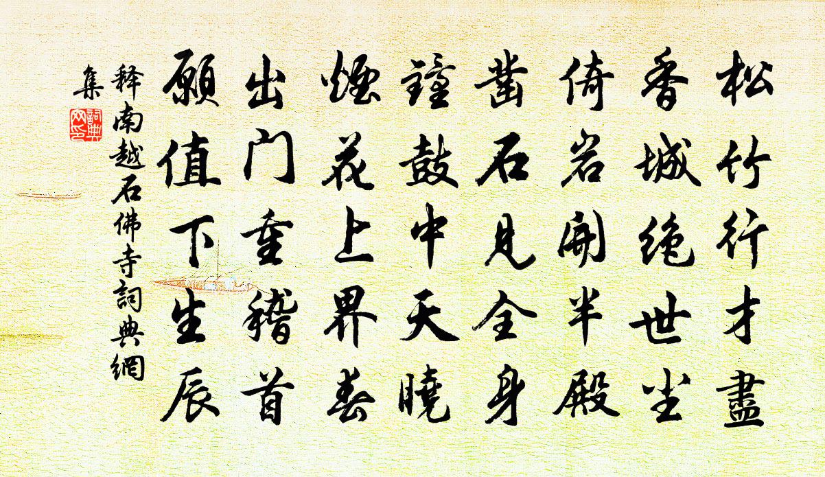 詩詞名句歷史字典書法欣賞書法字典國語詞典說文解字康熙字典古漢語字典標 題 作 者 詩 句 石佛寺作者:釋南越 朝代:宋代石佛寺原文松竹行才盡,香城絕世塵。倚岩開半殿,鑿石見全身。鐘鼓中天曉,煙花上界春。出門重稽首,願值下生辰。詩詞問答問:石佛寺的作者是誰?答:釋南越問:石佛寺寫於哪個朝代?答:宋代釋南越石佛寺書法欣賞石佛寺書法作品詩詞推薦於潛僧綠筠軒蘇軾〔宋代〕寧可食無肉,不可使居無竹。無肉令人瘦,無竹令人俗。人瘦尚可肥,士俗不可醫。旁人笑此言,似高還似痴。若寄華嚴賾講師釋紹曇〔宋代〕半生不睹德雲翁,懸想經行在別峰。破一微塵相見了,揭翻華藏十三重。十七夜如山庵孫應時〔宋代〕一雨秋能好,連宵月迥明。百年今夕話,萬里去年情。水滿天相盪,山空人獨行。蟬聲發奇思,攜酒未須傾。次韻高安撫雄楚樓餞別項安世〔宋代〕醉擘鳥絲寫玉欄,坐分鸞{左月右榷去木}膾龍肝。已知全楚風流在,更覺將軍禮數寬。一日樓成供燕餞,明朝岸別謝師宰王安石〔宋代〕閶闔城西地如水,雞鳴黃塵波浪起。窮年一馬望扶桑,東得省門身輒止。簿書期會老紛紛,邂逅論心喜有君。數日楚樓袁說友〔宋代〕東江風月夜潮平,西望巫山白帝城。止為山川增楚觀,惜哉徒沸市廛聲。詠竹詩謝朓〔南北朝〕窗前一叢竹。青翠獨言奇。南條交北葉。新筍雜故枝。月光疎已密。風來起復垂。青扈飛不礙。黃口得相窺。但恨碧牡丹晏幾道〔宋代〕翠袖疏紈扇。涼葉催歸燕。一夜西風,幾處傷高懷遠。細菊枝頭,開嫩香還遍。月痕依舊庭院。事何限。悵望秋意冬夜醉宿龍門覺起言志李白〔唐代〕醉來脫寶劍,旅憩高堂眠。中夜忽驚覺,起立明燈前。開軒聊直望,曉雪河冰壯。哀哀歌苦寒,鬱郁獨惆悵。傅說甲子歲元日呈鄭侍御明府權德輿〔唐代〕萬里煙塵合,秦吳遂渺然。無人來上國,灑淚向新年。世故看風葉,生涯寄海田。屠蘇聊一醉,猶賴主人賢。青玉案(戲用賀方回韻餞別朱少章)侯置〔宋代〕三年牢落荒江路。忍明日、輒帆去。冉冉年光真暗度。江山舞助,風波有險,不是留君處。梅花萬里傷遲暮。驛使己卯十月一日至燕越五日罹狴犴有感而賦文天祥〔宋代〕浩劫風塵暗,衣冠痛百罹。靜傳方外學,晴寫獄中詩。烈士惟名殉,真人與物違。世間忙會錯,認取去來時。送竇七王昌齡〔唐代〕清江月色傍林秋,波上熒熒望一舟。鄂渚輕帆須早發,江邊明月為君留。立冬夜舟中作范成大〔宋代〕人逐年華老,寒隨雨意増。山頭望樵火,水底見漁燈。浪影生千疊,沙痕沒幾稜。峨眉欲還觀,須待到晨興。句諶祜〔宋代〕蕃漢盛衰霜葉夢,陳隋興廢露華秋。畢叔文攜坡帖及與季真給事倡酬詩卷見訪於邢趙蕃〔宋代〕精金美玉當難朽,白衣蒼狗終何有。胡為徑欲老東坡,應坐生時宿南斗。何時斯文日再中,共推元佑超群公。袞衣早發竹山二首張嵲〔宋代〕天外峰蠻排木杪,江邊石氣動雲根。憑誰為謝東流水,好送寒聲入故園。春雨不止魯漕有二詩因次韻吳芾〔宋代〕春日固春雨,雨多亦可已。若為尚滂沱,連月煙浪里。江湖更瀰漫,不見蒲與葦。有時漏日光,洪雲薄如紙。欲晴次韻子瞻送顧子敦河北都運二首黃庭堅〔宋代〕儒者給事中,顧公甚魁偉。經明往行河,商略頗應史。勞人又費乏,國計安能已。成功渠有命,得人斯可喜。似聞陳山龍君祠迎享送神曲龔頤正〔宋代〕海波淵淪兮海山巃嵷,其下潛通兮君之宮。時思其母兮來舂容,菖葉生兮杏蔕融。君之來兮雷隆隆,雨我田兮秋芃名句推薦閒碾鳳團消短夢,靜看燕子壘新巢。周邦彥《浣溪沙·水漲魚天拍柳橋》 鴻雁幾時到,江湖秋水多。杜甫《天末懷李白》 秋色漸將晚,霜信報黃花。葉夢得《水調歌頭·秋色漸將晚》 西施越溪女,出自薴蘿山。李白《西施 / 詠薴蘿山》 莫莫高山,深谷逶迤佚名《紫芝歌》 忽聞歌古調,歸思欲沾巾。杜審言《和晉陵陸丞早春遊望》 去年今日此門中,人面桃花相映紅。崔護《題都城南莊》 積土成山,風雨興焉;積水成淵,蛟龍生焉;荀子《勸學》 忍淚佯低面,含羞半斂眉。韋莊《女冠子·四月十七》 過盡千帆皆不是,斜暉脈脈水悠悠。溫庭筠《望江南·梳洗罷》
