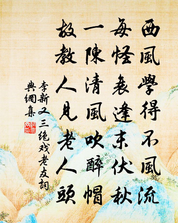 詩詞名句歷史字典書法欣賞書法字典國語詞典說文解字康熙字典古漢語字典標 題 作 者 詩 句 又三絕戲老友作者:李新 朝代:宋代又三絕戲老友原文西風學得不風流,每怪衰逢末伏秋。一陳清風吹醉帽,故教人見老人頭。詩詞問答問:又三絕戲老友的作者是誰?答:李新問:又三絕戲老友寫於哪個朝代?答:宋代李新又三絕戲老友書法欣賞又三絕戲老友書法作品詩詞推薦景祐釋奠武成王六首佚名〔宋代〕維師尚父,四覆分封。靈神峻密,祀事寅恭。蕭薌祗薦,飈馭排空。如嵊如式,福祿來崇。送劉祠部李新〔宋代〕玉腕騰雲黑霧開,穆王八駿始駑駘。逸氣飄遙長不已,重聞汗血下天來。李仲永墨梅姜特立〔宋代〕寫竹如草書,患俗不患清。畫梅如相馬,以骨不以形。墨君曩有文夫子,蟬腹蛇跗具生意。當時一派屬蘇公,雨葉周公謹硯(四首選二)黃宗羲〔清代〕弁陽片石出塘棲,餘墨猶然積水湄。一半已書亡宋事,更留一半寫今時。剩水殘山字句饒,剡源仁近共推敲。硯中宮詞宋白〔宋代〕十二樓前御柳垂,九重城裡百花時。宣州恰進紅絲毯,便遣宮娥舞柘枝。史應之贊黃庭堅〔宋代〕眉山史應之,愛酒而滑稽。對鄙不肖,醉眼一笑。司馬德操,萬事但好。東方戲嘲,驚動漢朝。窮則德操,達則方江上遇友人許棠〔唐代〕闕下分離日,杏園花半開。江邊相值夜,榆塞雁初來。坐久河沉斗,吟長月浸杯。鱸魚非不戀,共有客程催。再和孫應時〔宋代〕庭幃日聽烏鵲喜,里社相思雞鳧肥。獨身浪走一萬里,忽忽平生心事違。送和州張員外為江都令徐鉉〔唐代〕經年相望隔重湖,一旦相逢在上都。塞詔官班聊慰否,埋輪意氣尚存無。由來新地憐才子,始覺清風激懦夫。若向和章德文侍郎題晞浣堂韻寄張法師吳芾〔宋代〕丹成人去幾經年,怪石峻嶒樹曲拳。超脫每思攀逸駕,沉迷無奈縛塵緣。勝游徒有騷人詠,絕景難憑妙筆傳。投紱菊丁謂〔宋代〕陶令重時芳,鍾繇帝齎霶。清香宜桂酒,冷艷壓萸房。羽客長生助,騷人夕落傷。郊原多似是,甘苦冀情詳。和元遺山三首王奕〔宋代〕聖人與天游,擇地豈必巧。袤延十里林,老翠鎮盤繞。斧斤不可尋,兵劫不能燎。翁仲儼冠帶,麟虎峙強矯。書生贈龍光長老蘇軾〔宋代〕斫得龍光竹兩竿,持歸嶺北萬人看。竹中一滴曹溪水,漲起西江十八灘。西江月周紫芝〔宋代〕發白猶欹旅枕,溪深未掛煙莎。往來苕霅意如何。應有輕鷗笑我。細算年來活計,只消一個漁舟。金魚無分不須求江邊薛濤〔唐代〕西風忽報雁雙雙,人世心形兩自降。不為魚腸有真訣,誰能夜夜立清江。孫花翁墓王鎡〔宋代〕詞入秦樓唱至今,夜魂應共水仙吟。墳前幾樹桃花月,照得風流不死心。題澹山岩二首項安世〔宋代〕此日縱自爾,此興不可闌。竹徑滑拳跼,芒鞋側蹣跚。南窺下陰洞,北望升天關。鬼穴勇爭覷,仙扃誰得{左木右齊天樂(嚴縣尹度上和李觀我韻)劉天迪〔宋代〕瑞麟香軟飛瑤席,吟仙笑陪歡宴。桐影吹香,梅陰弄碧,一味微涼堪薦。停杯緩勸。記羅帕求詩,琵琶遮面。十載遊園晚歸馬上希深命賦梅堯臣〔宋代〕興盡夕陽天,言歸躍杏韉。新陰六街樹,遠目萬家煙。歌咽樓千尺,吟余月一弦。花間有游妓,醉去墮金鈿。漁父詞/漁父孫銳〔宋代〕平湖千頃浪花飛。春後銀魚霜更肥。菱葉飯,蘆花衣。酒酣載月忙呼歸。名句推薦兵戈既未息,兒童盡東征。杜甫《羌村三首·其三》 堯不能獨成,烏獲之不能自舉韓非及後人《韓非子·觀行》 思其人,至其鄉;其處在,其人亡。司馬光《資治通鑑·漢紀三十九》 一言足以召大禍,故古人守口如瓶,惟恐其覆墜也王永彬《圍爐夜話·第四八則》 莫飲卯時酒,昏昏醉到酉。佚名《增廣賢文·上集》 昔別君未婚,兒女忽成行杜甫《贈衛八處士》 人一能之,己百之。人十能之,己千之。子思《中庸·第二十章》 不入虎穴,焉得虎子。程登吉《幼學瓊林·卷四·鳥獸》 江湖多風波,舟楫恐失墜。杜甫《夢李白二首·其二》 抽刀斷水水更流,舉杯銷愁愁更愁。李白《宣州謝朓樓餞別校書叔雲 / 陪侍御叔華登樓歌》