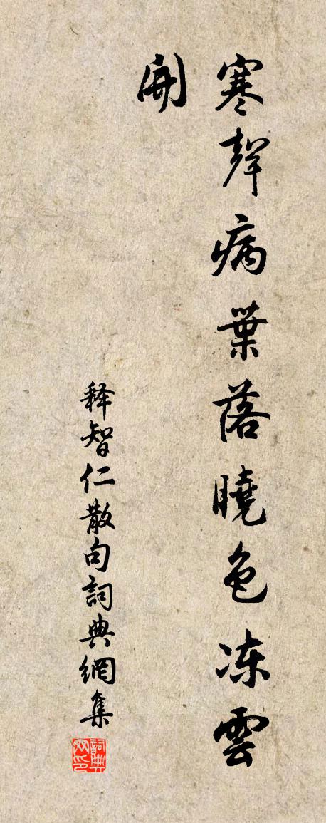 詩詞名句歷史字典書法欣賞書法字典國語詞典說文解字康熙字典古漢語字典標 題 作 者 詩 句 句作者:釋智仁 朝代:宋代句原文寒聲病葉落,曉色凍雲開。詩詞問答問:句的作者是誰?答:釋智仁問:句寫於哪個朝代?答:宋代釋智仁句書法欣賞句書法作品詩詞推薦題傳神陸游〔宋代〕雪鬢蕭然兩頰紅,人間隨處見神通。半醒半醉常終日,非士非農一老翁。櫪驥雖存千里志,雲鵬已息九天風。巉巉過嵩陰隱者李頻〔唐代〕當門看少室,倚杖復披衣。每日醒還醉,無人是與非。架書抽讀亂,庭果摘嘗稀。獨有江南客,思家未得歸。句諶祜〔宋代〕為惜舊時慈母線,寧甘今夜隔簾霜。聞楊和卿在館中讀易不去手贈以詩家鉉翁〔宋代〕人人讀醫經,知尊黃與岐。楊子讀醫經,乃以羲文周孔而為歸。易中有妙義,醫中之奧與易相表里。六十四卦字字奉陪太守及諸公游虎丘朱長文〔唐代〕何必襄陽孟浩然,苦吟自可繼前賢。虎丘合去十二度,熊軾再游三百年。雲閣為君追舊額,霓裳從古播朱弦。此行方壺自詠汪莘〔宋代〕性靜無一物,心生有萬端。曾將魂魄練,不被鬼神瞞。縱步地雖窄,仰頭天自寬。裁詩偏得偶,遇卦只成單。西亭子送李司馬岑參〔唐代〕高高亭子郡城西,直上千尺與雲齊。盤崖緣壁試攀躋,群山向下飛鳥低。使君五馬天半嘶,絲繩玉壺為君提。坐來豐年趙葵〔宋代〕一犁春雨足生涯,黍稷桑麻已滿略。軹頭今年風景好,村村社酒樂農家。荊棘中見梅花高翥〔宋代〕荊棘叢中數點春,春雲熊度月精神。依然竹屋茅檐下,靚女盈盈不嫁人。見子大後寄蘇泂〔宋代〕相過自一奇,歸去復相思。柳上已春意,屏間如杜詩。山川佳甚處,人物眇然時。愛重非金玉,微君不我知。浣溪沙(賞酴醿)葛勝仲〔宋代〕一夜狂風盡海棠。此花天遣殿群芳。芝蘭百濯見真香。勸客淋浪燈底韻,惱人魂夢枕邊囊。一枝插不□□□。偈頌一百六十首釋宗杲〔宋代〕今朝九月初五,天色半晴半十。衲僧鼻孔眼睛,切忌和泥合土。惺惺直是惺惺,靈利不妨靈利。等閒問著十人,五諸公見和次韻呈鄭舜舉國錄瑞伯仙尉陳棣〔宋代〕冠佩追隨倏半生,每憐蕭艾倚蘭英。開懷共醉酒賢聖,得句寧論詩父兄。天賦君才行有用,人言我拙坐無成。登填句釋曉瑩〔宋代〕江雲黯黯作愁陰。應詔內苑牡丹三首三花宋祁〔宋代〕九城蕃瑞殖,三山儼英蕤。巽采昭天造,同心奉帝嬉。繁疑交晝影,重欲亞晴枝。恩露方均泫,王風亦遍吹。並柯賦得玉卮無當(韻取卮字)元稹〔唐代〕共惜連城寶,翻成無當卮。詎慚君子貴,深訝巧工隳。泛蟻功全小,如虹色不移。可憐殊礫石,何計辨糟醨。江海桃花齊己〔唐代〕千株含露態,何處照人紅。風暖仙源里,春和水國中。流鶯應見落,舞蝶未知空。擬欲求圖畫,枝枝帶竹叢。青玉案陳瓘〔宋代〕碧空暗淡同雲繞。漸枕上、風聲峭。明透紗窗天欲曉。珠簾才卷,美人驚報,一夜青山老。使君留客金尊倒。正千除夜二首陳與義〔宋代〕萬里江湖憔悴身,冬冬街鼓不饒人。只愁一夜梅花老,看到天明付與春。奉和趙王遊仙詩庾信〔南北朝〕藏山還採藥。有道得從師。京兆陳安世。成都李意期。玉京傳相鶴。太乙授飛龜。白石香新芋。青泥美熟芝。山精名句推薦迢遞嵩高下,歸來且閉關。王維《歸嵩山作》 他鄉逢七夕,旅館益羈愁。孟浩然《他鄉七夕》 紅樹青山日欲斜,長郊草色綠無涯。歐陽修《豐樂亭遊春·其三》 留七分正經,以度生;留三分痴呆,以防死。陳繼儒《小窗幽記·集醒篇》 臨行挽衫袖,更嘗折殘菊。蘇軾《送頓起》 見而不見,聞而不聞,知而不知。韓非及後人《韓非子·主道》 習讀書之業,便當知讀書之樂王永彬《圍爐夜話·第五五則》 五更鐘動笙歌散,十里月明燈火稀。賀鑄《思越人·紫府東風放夜時》 酒酣應對燕山雪,正冰河月凍,曉隴雲飛。周密《高陽台·送陳君衡被召》 天涯靜處無征戰,兵氣銷為日月光。常建《塞下曲四首·其一》