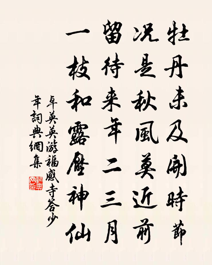 詩詞名句歷史字典書法欣賞書法字典國語詞典說文解字康熙字典古漢語字典標 題 作 者 詩 句 游福感寺答少年作者:卓英英 朝代:唐代游福感寺答少年原文牡丹未及開時節,況是秋風莫近前。留待來年二三月,一枝和露壓神仙。詩詞問答問:游福感寺答少年的作者是誰?答:卓英英問:游福感寺答少年寫於哪個朝代?答:唐代問:游福感寺答少年是什麼體裁?答:七絕卓英英游福感寺答少年書法欣賞游福感寺答少年書法作品注釋全唐詩:卷863-6詩詞推薦秋扇真山民〔宋代〕人心有炎涼,我心無歡悲。篋中重自珍,會有薰風時。次日再鎰韻三首陳造〔宋代〕微吟緩步愜晴沙,聊謝愔愔載婦車。時遣貰貂邨店酒,回思縛虎長官衙。春山好著屏中色,吟筆誰添錦上花。不妨宮詞十首張樞〔宋代〕堯殿融春天宴開,山呼才了樂聲催。侍臣宣勸君恩重,宰相親王對舉杯。閩人語佚名〔唐代〕歐陽獨步,藻蘊橫行。沿檄宿虎山山家趙汝鐩〔宋代〕高低田水曲通池,小小人家短短籬。杜宇教唆春去早,陰雲遮蓋月明遲。年華只解催教老,公事從來了是痴。若不又登碧雲亭感懷三十首吳芾〔宋代〕晚上危亭望遠山,望中有水亦回歪。終然不似吾廬好,上下山色水色間。井泉李呂〔宋代〕山溜碧泓澄,清甘歸色味。儻逢張又新,應不落第二。十七日窘雨邑中舟還陳宓〔宋代〕行到青山欲盡頭,窮源未省作溪游。輕雲放日催人渡,積雨肥波送客舟。臥看玉簪迎兩岸,心隨繡領逐浮漚。眼前以崇正辯示新仲胡寅〔宋代〕不羨飛仙術,仍修謗佛書。知音鼓琴後,覆瓿草玄余。龍象空相蹙,鳶魚祗自如。更煩君印可,底處認吾廬。洞庭魚李商隱〔唐代〕洞庭魚可拾,不假更垂罾。鬧若雨前蟻,多於秋後蠅。豈思鱗作簟,仍計腹為燈。浩蕩天池路,翱翔欲化鵬。浣溪沙(贈陳惜惜、憐憐)郭應祥〔宋代〕尊俎之間著二陳。津津眉宇笑生春。清歌妙舞兩無倫。叔隗輕盈饒態度,小喬嫵媚足精神。風流總屬一家人。宿南山普濟院張耒〔宋代〕閃閃青燈照薄帷,幽人不寐自吟詩。僧來邀我更深坐,待聽山風到樹枝。歲暮陸游〔宋代〕燕脂斑出古銅鼎,彈子窩深湖石山。老去柴門誰復過,天教二友伴清閒。布袋贊釋紹曇〔宋代〕馱布袋,笑誾誾,智無一兩,肉重千斤,轉腦回頭等個人。率陀歸路過錯,滿面是埃塵。效孔文舉贈柳聖功三首黃庭堅〔宋代〕武庫五兵森森,名駒萬里駸駸。英風爽氣如林,讀書鑿井欲深,學道卻要無心。漁人宋伯仁〔宋代〕不求豪富不求官,認缽相傳一釣竿。醉展綠蓑眠便得,滿城風雨自春寒。十一月十三日夜作陸游〔宋代〕風雪正相乘,蕭然一點燈。擁爐蒙衲被,就壁倚枯藤。火降神方王,河潮腦自凝。鄰雞太多事,三唱請晨興。上禮部侍郎陳情施肩吾〔唐代〕九重城裡無親識,八百人中獨姓施。弱羽飛時攢箭險,蹇驢行處薄冰危。晴天欲照盆難反,貧女如花鏡不知。卻向留題仙遊寺魏野〔宋代〕將從三峽泛扁舟,先向仙遊寺里游。水石卻驚偏怪異,江山狂興一時休。行田登海口盤嶼山詩謝靈運〔南北朝〕羈苦孰雲慰。觀海藉朝風。莫辨洪波極。誰知大壑東。依稀采菱歌。彷佛含嚬容。遨遊碧沙渚。游衍丹山峯。名句推薦長江春水綠堪染,蓮葉出水大如錢。張籍《春別曲》 瑕不掩瑜、瑜不掩瑕戴聖《禮記·聘義》 同聲則異而相應,意合則未見而相親戴聖《大戴禮記·保傅第四十八》 詩界千年靡靡風,兵魂銷盡國魂空。梁啓超《讀陸放翁集》 爭渡,爭渡,驚起一灘鷗鷺。李清照《如夢令·常記溪亭日暮》 寄相思,寒雨燈窗,芙蓉舊院。吳文英《宴清都·秋感》 聚散匆匆,雲邊孤雁,水上浮萍。劉過《柳梢青·送盧梅坡》 非懷北歸興,何用勝羈愁韓愈《洞庭湖阻風贈張十一署·時自陽山徙掾江陵》 仁者之為天下度也,辟之無以異乎孝子之為親度也。墨子《墨子·22章 節用(下)》 荒煙涼雨助人悲,淚染衣襟不自知。王安石《送和甫至龍安微雨》
