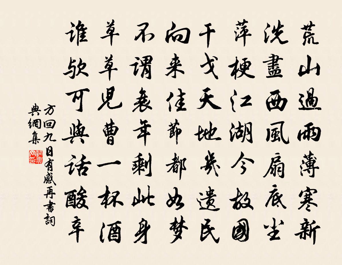 詩詞名句歷史字典書法欣賞書法字典國語詞典說文解字康熙字典古漢語字典標 題 作 者 詩 句 九日有感再書作者:方回 朝代:宋代九日有感再書原文荒山過雨薄寒新,洗盡西風扇底塵。萍梗江湖今故國,干戈天地幾遺民。向來佳節都如夢,不謂衰年剩此身。草草兒曹一杯酒,誰歟可與話酸辛。詩詞問答問:九日有感再書的作者是誰?答:方回問:九日有感再書寫於哪個朝代?答:宋代方回九日有感再書書法欣賞九日有感再書書法作品詩詞推薦避方寇五絕鄭剛中〔宋代〕皇家休運正無疆,撼樹蚍蜉不自量。未作天街一杯血,暫憑山谷恣跳梁。游鐘山詩應西陽王教沈約〔南北朝〕即事既多美。臨眺殊復奇。南瞻儲胥觀。西望昆明池。山中鹹可悅。賞逐四時移。春光發隴首。秋風生桂枝。廣王醇正叔二思詩王令〔宋代〕木落不去根,水流常背源。木落方病寒,尚覆本根溫。水流忘由來,散亂卑濕牽。讀子二思詩,起予二者言。木實句徐似道〔宋代〕牧童出捲烏鹽角,越女歸簪謝豹花。白薴歌戴復古〔宋代〕雪為緯,玉為經。一織三滌手,織成一片冰。清如夷齊,可以為衣。陟彼西山,於以採薇。頌古二十六首釋嗣宗〔宋代〕後園驢喫草,可憐無限虛生老。半夜盲人問故鄉,不知身在長安道。雞冠花董嗣杲〔宋代〕晴芳掩映宋窗曛,醜瓣攢鱗斗野雲。艷挺雙頭誰立異,名儕五德自為群。丹裳浥露承秋重,赤幘臨風唱曉分。函谷和三日陳師道〔宋代〕苦遭年少強追陪,病眼看花更覆杯。夾岸萬人傾國出,清江一注兩山開。遊人欲盡驚鷗下,晚日猶須惡雨催。更恐水調歌頭(八月十五夜集長樂堂月大明常歲所無眾客皆歡。戲用伯恭韻作)李彌遜〔宋代〕白髮閩江上,幾度過中秋。陰晴相半,曾見玉塔臥寒流。不似今年三五,皎皎冰輪初上,天闕恍神遊。下視人間世台城蕭德藻〔宋代〕六朝舊事知多少,盡在天禧塔上層。高處只應添淚眼,老僧語客莫來登。春日二首呈黃子邁大卿戴復古〔宋代〕帝里風光二月新,西湖幾隊踏青人。杏花時節偏饒雨,楊柳門牆易得春。或是或非塵里事,無窮無達醉中身。五陵台頭寺送宋希元蘇軾〔宋代〕相從傾蓋只今年,送別南台便黯然。入夜更歌金縷曲,他時莫忘角弓篇。(是日,與宋君同栽松寺中。)三年不顧送侯居甫監軍器所門戴栩〔宋代〕青雲直上不留難,也向神京效一官。御帶禁嚴曹事少,員分省戶薦書寬。明時蘭錡曾何用,昨夜邊烽未肯寒。定有臨川水驛汪元量〔宋代〕羊角山高鎖戰塵,春風吹草綠孤城。鵲巢遜與鳩夫婦,燕幙能容雁弟兄。今古廢興棋一著,萍蓬聚散酒三行。悲歌次韻公辟會蓬萊閣秦觀〔宋代〕林聲摵摵動秋風,共躡丹梯上臥龍。路隔西陵三兩水,門臨南鎮一千峰。湖吞碧落詩爭發,塔涌青冥畫幾重。非是治圃陸游〔宋代〕小圃漫經營,栽培抵力耕。土松宜雨點,根稚怯鉏聲。紅果方當熟,清陰亦漸成。每來常竟日,聊得暢幽情。送蘇評事韋應物〔唐代〕季弟仕譙都,元兄坐蘭省。言訪始忻忻,念離當耿耿。嵯峨夏雲起,迢遞山川永。登高望去塵,紛思終難整。平原郡齋二首黃庭堅〔宋代〕生平浪學不知株,江北江南去荷鋤。窗風文字翻葉葉,猶似勸人勤讀書。陪張燕公行郡竹籬趙冬曦〔唐代〕良臣乃國寶,麾守去承明。外戶人無閉,浮江獸已行。隨來晉盜逸,民化蜀風清。郛郭從彝典,州閭荷德聲。小人捉筆次前韻杜范〔宋代〕晨炊浮早渡,午夜過錢清。越國移舟便,曹娥上堰輕。人言三界近,共指一山橫。古剡明朝到,籃輿數去程。名句推薦歌舞尊前,繁華鏡里,暗換青青發。薩都剌《念奴嬌·登石頭城次東坡韻》 但從今、記取楚樓風,裴台月。辛棄疾《滿江紅·漢水東流》 同心一人去,坐覺長安空。白居易《別元九後詠所懷》 山夾水,澗。陵夾水,澞。山有穴為岫。佚名《爾雅·釋山》 誠者,非自成己而已也。所以成物也。成己仁也。成物知也。性之德也,合外內之道也。故時措之宜也。子思《中庸·第二十五章》 青海長雲暗雪山,孤城遙望玉門關。王昌齡《從軍行七首·其四》 燕子又將春色去。紗窗一陣黃昏雨。司馬槱《黃金縷·家在錢塘江上住》 落花水香茅舍晚,斷橋頭賣魚人散。馬致遠《壽陽曲·遠浦帆歸》 典盡客衣三尺雪,煉精詩句一頭霜。王建《維揚冬末寄幕中二從事》 相逢意氣為君飲,系馬高樓垂柳邊。王維《少年行四首》
