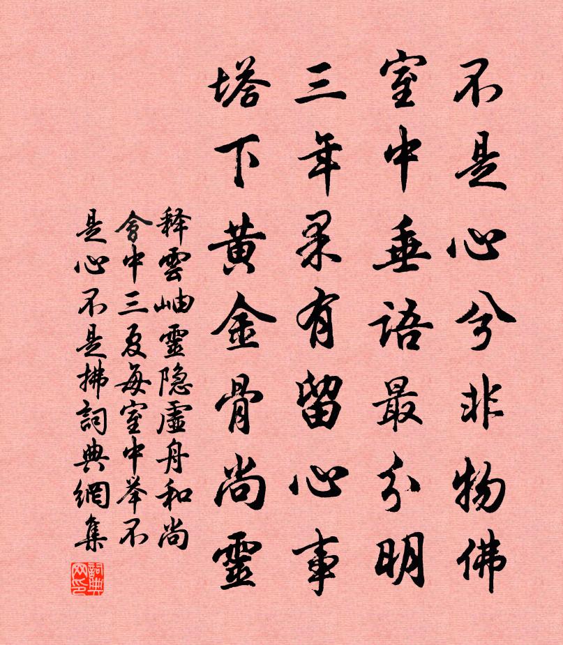 詩詞名句歷史字典書法欣賞書法字典國語詞典說文解字康熙字典古漢語字典標 題 作 者 詩 句 靈隱虛舟和尚會中三夏每室中舉不是心不是拂作者:釋雲岫 朝代:宋代原文不是心兮非物佛,室中垂語最分明。三年果有留心事,塔下黃金骨尚靈。詩詞問答問:《靈隱虛舟和尚會中三夏每室中舉不是心不是拂》的作者是誰?答:釋雲岫問:該詩寫於哪個朝代?答:宋代書法欣賞靈隱虛舟和尚會中三夏每室中舉不是心不是拂書法作品詩文賞析【原題】:靈隱虛舟和尚會中三夏每室中舉不是心不是拂不是物之語三年不易是時如隔羅縠看月不敢下語後移單淨慈常提此語忽蹉口自雲恁么說話墮三惡道惜不復見者老和尚今作一偈記諸詩詞推薦與諸公同出城觀稼白居易〔唐代〕老尹醉醺醺,來隨年少群。不憂頭似雪,但喜稼如雲。歲望千箱積,秋憐五穀分。何人知帝力,堯舜正為君。洞山十詠中澗金履祥〔宋代〕雪液風來自石峰,金華眾壑此為中。須知流出此山外,更會群流共入東。送張鬷嘏李覯〔宋代〕人意皆懷土,嗟君無故園。欲行須盡室,此去又他門。靜里文章好,貧來節行存。振淹知有日,倚伏豈虛言。採石月贈郭功甫梅堯臣〔宋代〕採石月下聞謫仙,夜披錦袍坐釣船。醉中愛月江底懸,以手弄月身翻然。不應暴落飢蛟涎,便當騎魚上九天。青山游淨因院寄璉禪師蘇轍〔宋代〕歲月潛消日裡冰,依然來見佛堂燈。此身已自非前我,問法何妨似舊僧。灑面飛泉時點點,壓池蒼石尚層層。遙知寒雨中夜坐陸游〔宋代〕江村風雨晚冥冥,閉戶添衣愴客情。爐爇松肪如蠟爨,鼎煎茶浪起灘聲。團樂賴有兒同話,剝啄應無客可迎。聊舉游清涼寺逢說命者傅會雲帥垣星照西方袁說友〔宋代〕奔走才千里,辛勤說五行。星躔初下照,君命趣東征。萬壑乾坤注,千艘日夜橫。江山看不暇,此役快平生。四和香/四犯令李處全〔宋代〕香雪新苞偏勝韻。領袖催花信。華節良辰人有分。看士女、旛垂鬢。莫向春風尋舊恨。樂事隨方寸。眉壽故應天不錢塘別諸同年林季仲〔宋代〕晚色明沙際,春愁掛柳邊。相逢一尊酒,難值七同年。聚散雁遵渚,行藏魚在淵。西興殘夜月,獨照渡頭船。南岩韓元吉〔宋代〕官曹簿領無時空,一春蹙蹙塵埃中。溪南十里岩谷好,俗駕屢整無由窮。前時相邀雨斷道,今時不雨天亦風。乃知蘇幕遮高道寬〔元代〕藥無窮,頻收采。丹鼎純烹,一味通三昧。萬法都無真箇會。清靜家風,最上為精粹。付知音,偏可意。開口參同鵲橋仙(七夕詞)石延年〔宋代〕一分素景,千家新月,涼露樓台遍洗。寶奩深夜結蛛絲,紝五孔、金針不寐。句徐某〔宋代〕仙台之陽石壇東,下有亭亭太古松。屺瞻拜墓馬廷鸞〔宋代〕假汝稀年只八年,爭教老境不悽然。青山慈母已黃壤,綠鬢中男余白顛。天外群鴻隨滅沒,雲間孤鶴自蹁躚。共攜暮冬書懷呈友人(一作喻鳧詩)方乾〔唐代〕空為梁甫吟,誰竟是知音。風雪生寒夜,鄉園來舊心。滄江孤棹迥,白閣一鍾深。君子久忘我,此懷甘自沈。玉樓春辛棄疾〔宋代〕何人半夜推山去。四面浮雲猜是汝。常時相對兩三峰,走遍溪頭無覓處。西風瞥起雲橫渡。忽見東南天一柱。老僧頌古二十四首釋宗演〔宋代〕空病有為藥,有病空為藥。空有兩俱非,藥病何處著。無處著,萬里秋風飛一鶚。句釋惠崇〔宋代〕歸禽動疏竹,落果響寒塘。和文與可洋州園亭三十詠其十三吏隱亭蘇轍〔宋代〕隱居亦非難,欲少求易遂。有意未成歸,聊就茅檐試。游浮洲寺趙蕃〔宋代〕久客渾忘賴,群山得細看。身如悟浮沒,詩喜助波瀾。塑象觀殊詭,作鍾懷叛乾。東湖空壯麗,芝嶺漫林巒。名句推薦泛樓船兮濟汾河,橫中流兮揚素波。劉徹《秋風辭》 曉雞驚樹雪,寒鶩守冰池。李商隱《幽居冬暮》 月既不解飲,影徒隨我身。李白《月下獨酌四首·其一》 御柳如絲映九重,鳳凰窗映繡芙蓉。溫庭筠《楊柳枝》 聖人之救危國也,以忠拂耳。韓非及後人《韓非子·安危》 心之憂危,若蹈虎尾,涉於春冰。佚名《尚書·周書·君牙》 玉樹歌殘王氣終,景陽兵合戍樓空。許渾《金陵懷古》 因人成事,其功不難。魏徵《隋書·列傳·卷七》 處顛者危,勢豐者虧。王充《論衡·卷一·累害篇》 道不同,不相為謀。孔子弟子《論語·衛靈公篇》