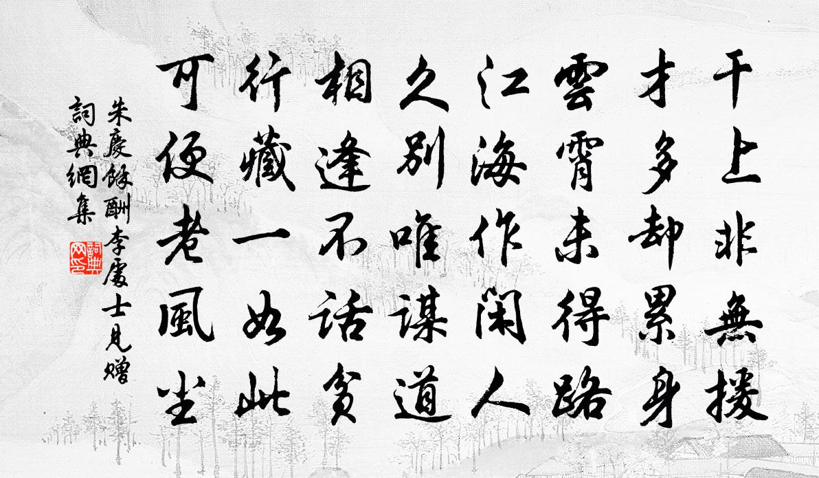 詩詞名句歷史字典書法欣賞書法字典國語詞典說文解字康熙字典古漢語字典標 題 作 者 詩 句 酬李處士見贈作者:朱慶餘 朝代:唐代酬李處士見贈原文幹上非無援,才多卻累身。雲霄未得路,江海作閒人。久別唯謀道,相逢不話貧。行藏一如此,可便老風塵。詩詞問答問:酬李處士見贈的作者是誰?答:朱慶餘問:酬李處士見贈寫於哪個朝代?答:唐代朱慶餘酬李處士見贈書法欣賞酬李處士見贈書法作品注釋全唐詩:卷515-3詩詞推薦自題齊己〔唐代〕禪外求詩妙,年來鬢已秋。未嘗將一字,容易謁諸侯。掛攀山皆遠,題名石盡幽。敢言梁太子,傍采碧雲流。傷心詩錢秉鐙〔清代〕屈指吳江死別時,孤情此日已全痴。子山漫著傷心賦,孫楚休傳除服詩。海外無香回玉樹,帳中何術召蛾眉。故園奉和洛陽玩雪應制沈佺期〔唐代〕周王甲子旦,漢後德陽宮。灑瑞天庭里,驚春御苑中。氛氳生浩氣,颯沓舞迴風。宸藻我盈尺,賡歌樂歲豐。寒食前一日西湖閒泛三首張鎡〔宋代〕艷紅香白遍遊人,花柳酣歌識太平。野客獨諳閒意趣,草煙空愛一川明。浣溪沙(四)韋莊〔唐代〕綠樹藏鶯鶯正嘀,柳絲斜拂白銅堤,弄珠江上草萋萋。日暮飲歸何處客,繡鞍驄馬一聲嘶,滿身蘭麝醉如泥。偈頌十八首釋如淨〔宋代〕大開此殿,親面一見。眼裡抽釘,腦後拔箭,本來無象通機變。觀春詹初〔宋代〕萬木春來花滿枝,忽來忽去迭無時。此中還有此中意,說向傍人人不知。宰邑垂滿喜與王梅溪孫主簿合併承入秋闈當別陳宓〔宋代〕貢士何年屋萬間,手栽仙桂萬人攀。聞孫雅有祖風烈,想見霜袍萬眼環。夜寒有作施樞〔宋代〕可怪輕寒薄短衾,起來搔首傍燈吟。百年易老風前鬢,萬事難侵水樣心。雁叫雲天秋渺渺,蟲鳴露砌夜沉沉。朱絲憶淵明二首馮時行〔宋代〕晨策東籬路,煌煌寒菊英。我豈無他人,底事憶淵明。忘言會諸理,掃盡世俗情。悠然見南山,此意誰與評。尋裴處士孟郊〔唐代〕涉水更登入,所向皆清真。寒草不藏徑,靈峰知有人。悠哉鍊金客,獨與煙霞親。曾是欲輕舉,誰言空隱淪。遠心題李尊師松樹障子歌杜甫〔唐代〕老夫清晨梳白頭,玄都道士來相訪。握髮呼兒延入戶,手提新畫青松障。障子松林靜杳冥,憑軒忽若無丹青。陰崖京師逢賣梅花五首梅堯臣〔宋代〕驛使前時走馬回,北人初識越人梅。清香莫把荼醾比,只欠溪頭月下杯。翠微寺陳炳〔宋代〕 * 休作獅子吼,門外泉聲正拍空。三十六峰渾不見,翠微真在有無中。漫興十一首趙蕃〔宋代〕風順風橫總欲乘,傳呼雖數不余譍。去程渺渺湖邊草,宿伴悠悠水上罾。閒中讀書次第高斯得〔宋代〕紫陽禮編甫盡卷,亟償通典平生願。增損溫公鑒目成,要把二岩書貫穿。夜燈覽徹六一文,眉出鉅集思重見。七書遣意仇遠〔宋代〕宦遊今倦矣,歲晚意何如。臘雪不到地,春風先滿閭。鄰翁寒乞炭,溪女曉供魚。多有梅花處,吾將卜隱居。壽湖南管倉五首廖行之〔宋代〕古人重繇使,竭作唯追胥。兩稅已復役,三倍將何如。洪惟愛基本,幸甚均慘舒。周親今閭閻,民情力有餘。詠史上伏生陳普〔宋代〕二兒並轡入公門,博局紛紛啟禍原。不及賈生何處是,弗將禮法教兒孫。題陸大參秀夫廣陵牡丹詩卷後林景熙〔宋代〕南海英魂叫不醒,舊題重展墨香凝。當時京洛花無主,猶有春風寄廣陵。名句推薦志於道,據於德,依於仁,游於藝。孔子弟子《論語·述而篇》 流水下灘非有意,白雲出岫本無心。佚名《增廣賢文·上集》 錢財如糞土,仁義值千金。馮夢龍《醒世恆言·卷十七》 寄語洛城風日道,明年春色倍還人。杜審言《春日京中有懷》 滄江好煙月,門系釣魚船。杜牧《旅宿》 橫笛驚征雁,嬌歌落塞雲。岑參《奉陪封大夫九日登高》 倉稟無宿儲,徭役猶未已。韋應物《觀田家》 萬物並育而不相害。道並行而不相悖。小德川流;大德敦化。子思《中庸·第三十章》 花開深洞仙門小,路過懸橋羽節輕。劉滄《贈道者》 稱是秦時避世人,勸酒相歡不知老。李白《山人勸酒》