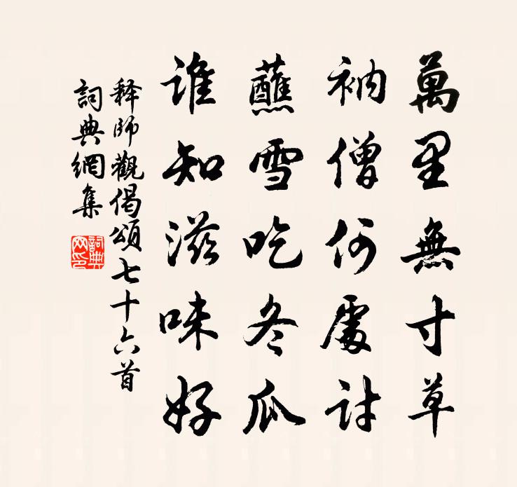 詩詞名句歷史字典書法欣賞書法字典國語詞典說文解字康熙字典古漢語字典標 題 作 者 詩 句 偈頌七十六首作者:釋師觀 朝代:宋代偈頌七十六首原文萬里無寸草,衲僧何處討。蘸雪吃冬瓜,誰知滋味好。詩詞問答問:偈頌七十六首的作者是誰?答:釋師觀問:偈頌七十六首寫於哪個朝代?答:宋代釋師觀偈頌七十六首書法欣賞偈頌七十六首書法作品詩詞推薦曹娥廟潘牥〔宋代〕一川經漲夕陽波,幼婦碑殘鎖綠蘿。不止但爭三十里,曹瞞元不識曹娥。鳳棲梧(五之二)張綱〔宋代〕雨洗軒庭迎晚照。 * 才芳,未覺秋光老。怪底烘堂添語笑。姮娥此夜來蓬島。獻壽新詞誰解道。滿眼兒孫,著語題楊解元壽萱堂二首王炎〔宋代〕濟濟斑衣子,怡怡白髮親。紫萱偏得地,玉樹解留春。王宗臣趙處仁鄭季克同游分得村字劉黻〔宋代〕出關非為看桃李,愛識西山深處村。舟泊野橋分柳色,屐尋閒徑破苔痕。鳩占欲雨喚夫婦,雞傍殘陽聚子孫。得友送劉士彥赴福建轉運判官黃庭堅〔宋代〕秋葉雨墮來,冥鴻天資高。車馬氣成霧,九衢行滔滔。中有寂寞人,靈府扃鎖牢。西風持漢節,騎從嚴弓刀。惟閩花溪漁隱圖唐寅〔明代〕湖上桃花塢,扁舟信往還。浦中浮乳鴨,木抄屾平山。見歐制乾陽枋〔宋代〕殿西歌徹彩薇聲,記室煩君為一行。竇幕月班燕刻重,裴得愈蔡功成。文書書靜旌旗卷,籌畫宵間鼓角清。今日元比干傳貫休〔唐代〕昏王亡國豈堪陳,只見明誠不見身。想得先生也知自,欲將留與後來人。和曾谹父庚伏書懷六首王洋〔宋代〕垣衣侵砌竹穿牆,日日蕭條氣運涼。急雨滿池鳴兩部,幽奇不獨水雲鄉。三用韻奉酬楊公遠〔宋代〕今日韶光滿九旬,浮生又了一年春。莫言虛度渾無補,學得先生句法新。烏夜啼佚名〔宋代〕曉來閒立回塘。一襟香。玉颭雲松風外、數枝涼。相併渾如私語,惱人腸。飛去方知白鷺、在花旁。促織梅堯臣〔宋代〕札札草間鳴,促促機上聲。織女夜中起,明河檐外橫。一絲不入杼,疏密工未精。豈知天孫巧,衣脫六銖輕。人間寄楊歸一文同〔宋代〕出處久異矣,居常勞所思。煙霄惟子未,鬢髮已翁為。世故豈須問,人生當自知。林泉聞幸好,足可樂明時。點絳唇張元乾〔宋代〕水鷁風帆,兩眉只解相思皺。悄然難受。教我怎唧口留。待得書來,不管歸時瘦。嬌痴後。是事撋就。只這難依口池州鄭許〔宋代〕嶂沒千重霧,江涵萬里天。湘潭送波浪,吳楚會風煙。和陶歸園田居六首蘇軾〔宋代〕環州多白水,際海皆蒼山。以彼無盡景,寓我有限年。東家著孔丘,西家著顏淵。市為不二價,農為不爭田。周公追和東坡次蔡郎中游湖韻於石〔宋代〕昔年著腳窮深幽,藕花十里煙波秋。騎驢踏月楊柳市,買舟聽雨菰蒲洲。酒樓倚天沸歌管,繁華轉眼如雲浮。山川泊舟陸游〔宋代〕湖水無風鏡面平,巉巉倒影萬峰青。放翁眼界便疏豁,過盡蘆村泊蓼汀。除夜書門牌姜特立〔宋代〕君恩華老境,慶事接新春。門戶嚴呵禁,神應護吉人。過淮陰縣楊萬里〔宋代〕索寞淮陰縣,人家草草中。荻籬緯春勝,茅屋學船篷。今日非昨日,南風轉北風。霍然香霧散,放出一輪紅。名句推薦蘭有秀兮菊有芳,懷佳人兮不能忘。劉徹《秋風辭》 寧為太平犬,莫作亂離人!馮夢龍《醒世恆言·卷三》 野梅燒不盡,時見兩三花劉基《古戍》 當年不肯嫁春風,無端卻被秋風誤。賀鑄《芳心苦·楊柳回塘》 昔歲逢太平,山林二十年。元結《賊退示官吏》 且憑天子怒,復倚將軍雄。高適《塞下曲》 一身報國有萬死,雙鬢向人無再青。陸游《夜泊水村》 父兄有善行,子弟學之或不肖王永彬《圍爐夜話·第三三則》 江南春盡離腸斷,苹滿汀洲人未歸。寇準《江南春·波渺渺》 天入平湖晴不風,夕帆和雁正浮空。陳與義《登岳陽樓》