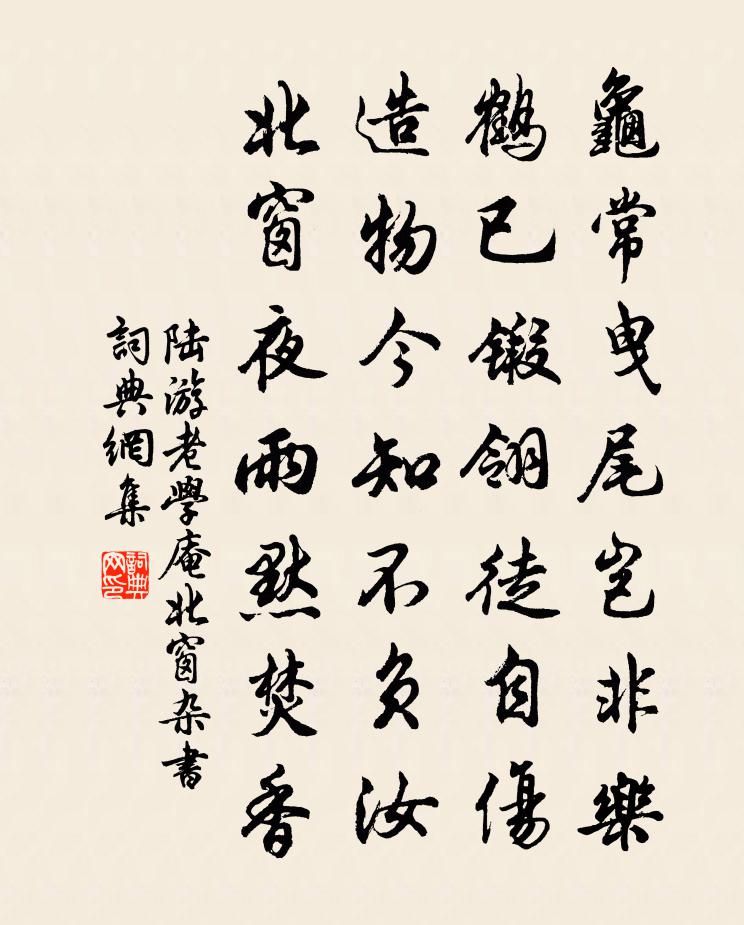 詩詞名句歷史字典書法欣賞書法字典國語詞典說文解字康熙字典古漢語字典標 題 作 者 詩 句 老學庵北窗雜書作者:陸游 朝代:宋代老學庵北窗雜書原文龜常曳尾豈非樂?鶴已鍛翎徒自傷。造物今知不負汝,北窗夜雨默焚香。詩詞問答問:老學庵北窗雜書的作者是誰?答:陸游問:老學庵北窗雜書寫於哪個朝代?答:宋代問:陸游的名句有哪些?答:陸游名句大全陸游老學庵北窗雜書書法欣賞老學庵北窗雜書書法作品詩詞推薦項羽錢舜選〔宋代〕項羽天資自不仁,那堪亞父作謀臣。鴻門若遂樽前計,又一商君又一秦。唐多令·惜別吳文英〔宋代〕何處合成愁。離人心上秋。縱芭蕉、不雨也颼颼。都道晚涼天氣好,有明月、怕登樓。 年事夢中休。花空煙水流夜過白雲話別張鎮孫〔宋代〕遙看天際白雲浮,渺渺西飛誰與謀。歸去扶溪溪水闊,秋來還上越台否。百歲令朱渙〔宋代〕瑞芳樓下,有花中君子,群然相聚。笑把筒露浥,來慶黃堂初度。淨植無塵,清香近遠,人與花名伍。六郎那得,頌古釋道顏〔宋代〕百丈野狐,塞雁銜蘆。李廣神箭,張顛草書。新竹李建勛〔唐代〕裊裊薰風軟,娟娟湛露光。參差仙子仗,迤邐羽林槍。迥去侵花地,斜來破蘚牆。籜乾猶抱翠,粉膩若塗裝。徑曲偈頌六十八首釋法薰〔宋代〕識得一,萬事畢。秘魔擎叉,魯祖面壁。臨際三玄三要,洞山五位君臣,雲門念七,是一不是一。昨夜新州老盧,慈恩寺避暑李遠〔唐代〕香荷疑散麝,風鐸似調琴。不覺清涼晚,歸人滿柳陰。寄題溪口廣慈院范仲淹〔宋代〕越中山水絕纖塵,溪口風光步步新。若得會稽藏拙去,白雲深處亦行春。減字木蘭花(和文伯兄詠新亭)倪偁〔宋代〕憑高一覽。紫翠相圍光照眼。下瞰平湖。鷺立鷗飛意自如。天清境勝。雲澹煙橫魚動鏡。不是公詩。誰寫新亭一段酬呂明父學士陳師道〔宋代〕當日功名指顧收,一言悟主過千秋。去登霄漢如平地,歸到雲山尚黑頭。解組行參蓮社客,揮金坐揖醉鄉侯。謝公楊和王挽章五首曹勛〔宋代〕乍去潭潭府,方多耿耿心。嘗忘言激切,共嘆老侵尋。側聽醫方驗,何期訃報臨。縗麻望神坐,雲亦慘愁陰。夏與熊王二秀才同宿僧院武元衡〔唐代〕共將纓上塵,來問雪山人。世綱從知累,禪心自證真。境空宜入夢,藤古不留春。一聽林公法,靈嘉願寄身。題劉路宣義風月堂陳與義〔宋代〕長風窗將佳月,窗萬里到此窗堂。天游本無待,邂逅今夕涼。北窗舊竹短,南窗新竹長。此君本無心,風月不相忘和令狐相公春早朝回鹽鐵使院中作劉禹錫〔唐代〕柳動御溝清,威遲堤上行。城隅日未過,山色雨初晴。鶯避傳呼起,花臨府署明。簿書盈几案,要自有高情。客夜與故人偶集 / 江鄉故人偶集客舍戴叔倫〔唐代〕天秋月又滿,城闕夜千重。還作江南會,翻疑夢裡逢。風枝驚暗鵲,露草覆寒蛩。羈旅長堪醉,相留畏曉鍾。次韻嚴巨孟鄭俠〔宋代〕俠也荒唐學,文章愧古風。誰將覆醯醢,子謂近蜺虹。去聖雖雲遠,微言信可宗。期君振頹敝,謨典嗣前功。戲效連珠疊韻體陳棣〔宋代〕溯流遲澀須流輕,石岸崎嶇沙岸平。高樹影藏低樹影,前灘聲掩後灘聲。飛禽飛去語禽語,歸客歸休行客行。望斷浣溪沙 張右丞壽王惲〔元代〕補*功深浴鳳池。好賢人道似緇衣。佩聲清音見委蛇。千歲壽祺陰有積,兩宮恩*古來稀。東山歌酒樂時熙。醉後王績〔唐代〕阮籍醒時少,陶潛醉日多。百年何足度,乘興且長歌。名句推薦煙水初銷見萬家,東風吹柳萬條斜。竇鞏《襄陽寒食寄宇文籍》 暗燈涼簟怨分離,妖姬,不勝悲。閻選《河傳·秋雨》 行多有病住無糧,萬里還鄉未到鄉。盧綸《逢病軍人》 日暮詩成天又雪,與梅並作十分春。盧梅坡《雪梅·其二》 命隨年欲盡,身與世俱忘;文天祥《除夜》 同天下之利者,則得天下;擅天下之利者,則失天下。姜子牙《六韜·文韜·文師》 誠者,天之道也。誠之者,人之道也。誠者,不勉而中不思而得:從容中道,聖人也。誠之者,擇善而固執之者也子思《中庸·第二十章》 無限傷心夕照中,故國淒涼,剩粉余紅。夏完淳《一剪梅·詠柳》 鐵衣霜露重,戰馬歲年深。戎昱《塞下曲·其六》 何計長來此,閒眠過一生。姚合《秋夜月中登天壇》