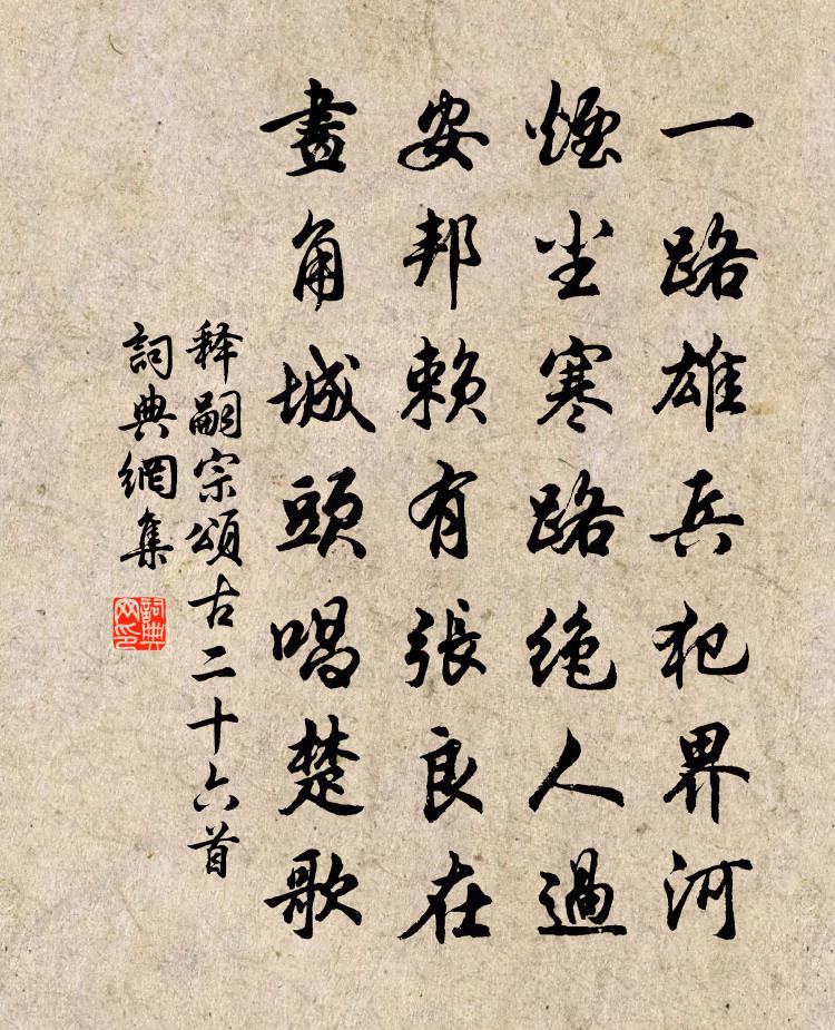 詩詞名句歷史字典書法欣賞書法字典國語詞典說文解字康熙字典古漢語字典標 題 作 者 詩 句 頌古二十六首作者:釋嗣宗 朝代:宋代頌古二十六首原文一路雄兵犯界河,煙塵寒路絕人過。安邦賴有張良在,畫角城頭唱楚歌。詩詞問答問:頌古二十六首的作者是誰?答:釋嗣宗問:頌古二十六首寫於哪個朝代?答:宋代釋嗣宗頌古二十六首書法欣賞頌古二十六首書法作品詩詞推薦昭君怨(瓊花)劉克莊〔宋代〕后土宮中標韻。天上人間一本。道號玉真妃。字瓊姬。我與花曾半面。流落天涯重見。莫把玉簫吹。怕驚飛。菩薩蠻(西湖曲)王氏〔宋代〕橫湖十頃琉璃碧。畫橋百步通南北。沙暖睡鴛鴦。春風花草香。閒來撐小艇。劃破樓台影。四面望青山。渾如蓬萊多麗 為友生書所見張翥〔元代〕小庭階。簾櫳婀娜蓬萊。恨匆匆、歸鴻度影,東風搖盪情懷。不多時、見他行過,霎兒後、依舊回來。銀鋌雙鬟,三御史詠佚名〔宋代〕韋子凝而密,任生直且狂。可憐元福慶,也學坐凝床。句高似孫〔宋代〕風流夸老看元宵。和仲巽奚山部落蘇頌〔宋代〕千里封疆薊霫間,時平忘戰馬牛閒。居人處處營耕牧,盡室穹車往復還。太廟觀之草周麟之〔宋代〕九廟寧神藹德馨,煌煌又見產芝英。香凝薦斝椒蘭潤,色映雕梁日月明。紹復祖宗全達孝,感通天地契精誠。試披句釋擇璘〔宋代〕弔古有心懷短李,拂塵無力看豐碑。松江亭王禹偁〔宋代〕登臨陡覺挹塵埃,時有清風颯滿懷。螮蝀一條連古岸,玻璃萬傾自天來。寒光浩渺輕煙闊,綠玉參差遠岫排。南指淳化中朝會二十三首佚名〔宋代〕四序伊始,三陽筆開。條風入律,玉琯飛灰。望雲肅謁,鳴佩斯來。稱觴獻壽,瞻拱星回。八月二十二日寓直玉堂,雨後頓涼范成大〔宋代〕雨意蒸雲暗夕陽,濃薰滿院落花香。題詩弄筆北窗下,將此工夫報答涼。上清宮鄭清之〔宋代〕雨余日腳到天涯,十里平山戴晚霞。疑是千虹蟠絳闕,頻移光景入仙家。又二首袁燮〔宋代〕平生酷愛水浮天,每到東湖決豁然。要識此湖功利溥,旱時無陰蔭民田。志道生日為詩勉之真德秀〔宋代〕我聞洙泗言,惟仁靜而壽。汝欲綿修齡,斯義盍深究。越從開闢來,新故更禪受。巍巍獨山嶽,屹立鎮宇宙。其體次韻張丞陳造〔宋代〕政平民安之,不在書上考。君看道傍樗,蒼雲蔭合抱。明時話英躔,佳氣指蓬島。孰知嵌岩幽,乃韞希代寶。張侯春晚書懷王之道〔宋代〕十年萍梗三到吳,走俗未暇觀西湖。是行信步至湖上,水光山色開天壺。遊人雜遝半羅綺,一徑不憚穿雲紆。歸來水釋智圓〔宋代〕本性澄明萬古同,滔滔潤物信無窮。百川奔注歸滄海,五服安居賴禹功。動帶晚風沖島嶼,靜涵秋色混虛空。浮舟採石墓白居易〔唐代〕採石江邊李白墳,遶田無限草連雲。可憐荒壟窮泉骨,曾有驚天動地文。但是詩人多薄命,就中淪落不過君。渚苹句宋太宗〔宋代〕鑾輿臨紫塞,朔野凍雲飛。和錢穆父尚書蔣穎叔侍郎從駕景靈宮二首范祖禹〔宋代〕寢廟威神挾正元,初晨天仗下端門。寒生碧瓦氣蔥鬱,日麗琱輿景晏溫。霜露感時知世遠,星辰拱極見君尊。自憐名句推薦無常安之國,無宜治之民戴聖《大戴禮記·保傅第四十八》 意內稱長短,終身荷聖情。杜甫《端午日賜衣》 杜漸防萌,慎之在始。房玄齡《晉書·列傳·第六十八章》 星河秋一雁,砧杵夜千家。韓翃《酬程延秋夜即事見贈》 卜以決疑,不疑何卜。李汝珍《鏡花緣·第十二回》 相馬失之瘦,相士失之貧。司馬遷《史記·滑稽列傳》 但怪得、當年夢緣能短。吳文英《三姝媚·過都城舊居有感》 夫知人之性,莫難察焉。諸葛亮《將苑·卷一·知人性》 低頭獨長嘆,此嘆無人喻。白居易《買花 / 牡丹》 往者不可諫,來者猶可追。孔子弟子《論語·微子篇》