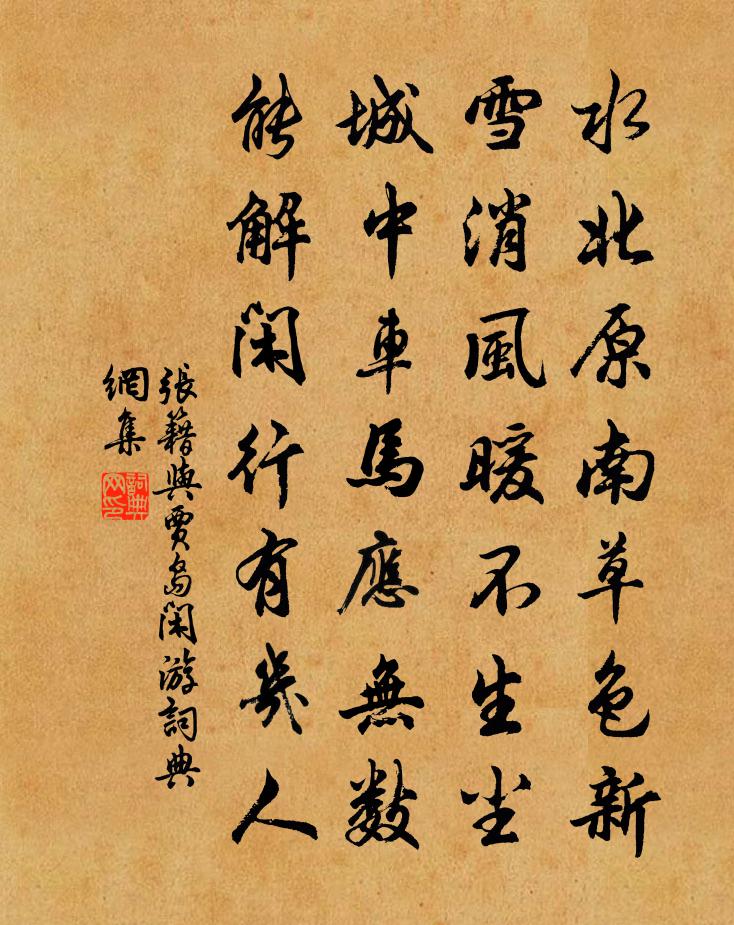 詩詞名句歷史字典書法欣賞書法字典國語詞典說文解字康熙字典古漢語字典標 題 作 者 詩 句 與賈島閒遊作者:張籍 朝代:唐代與賈島閒遊原文水北原南草色新,雪消風暖不生塵。城中車馬應無數,能解閒行有幾人。詩詞問答問:與賈島閒遊的作者是誰?答:張籍問:與賈島閒遊寫於哪個朝代?答:唐代問:與賈島閒遊是什麼體裁?答:七古問:張籍的名句有哪些?答:張籍名句大全張籍與賈島閒遊書法欣賞與賈島閒遊書法作品注釋全唐詩:卷386-32詩詞推薦春貼子皇帝閣六首真德秀〔宋代〕萬宇新歌大有年,又看瑞雪粲瓊田。太平和氣隨春轉,斗米從今三四錢。桂陽宰胡達信同年見贈三首次韻黃公度〔宋代〕場屋聲名識子初,氣吞楊孔況其餘。十年流落猶州縣,千里往來只簡書。臥雨餐風從鞅掌,昂霄聳壑正權輿。割雞師繹諾湖莊之約畏風色不果來以詩見餉次其韻曹彥約〔宋代〕宴集慚非左氏莊,妄行村落似猖狂。人生適意真難遇,天意慳晴未易量。可但客衣吹杲杲,只愁春色去堂堂。輟行杪秋洞庭懷王道士佚名〔唐代〕漂泊日復日,洞庭今更秋。青桃亦何意,此夜催人愁。惆悵客中月,裴回江上樓。心知楚天遠,目送滄波流。謝客賀頑極和尚住越州光孝釋紹曇〔宋代〕越王城北唐朝寺,千間老屋摧風雨。塔影凌空落鑑湖,劫初鈴子丁東語。久無本色住山人,愁殺檀門許元度。剝否偈頌二十二首釋妙倫〔宋代〕九十日一夏,始終無縫罅。拶到末梢頭,有個好說話。長撲梵志註九經,瞎眼波斯書八卦。桂枝香(四明鄞江樓九日)趙以夫〔宋代〕水天一色。正四野秋高,千古愁極。多少黃花密意,付他歡伯。樓前馬戲星球過,又依稀、東徐陳跡。一時豪俊,仲夏張耒〔宋代〕雲間趙盾益可畏,淵底武侯方熟眠。若無一雨為施澤,直恐三伏便欲然。算商酤酒有底急,束帶坐曹真欲顛。平生歸宗墨池洪咨夔〔宋代〕龍跳虎躍入昭陵,墨汁空留一段冰。散作淋漓元氣濕,屋頭老木掛疏藤。寄徐秋澗張汝勤〔宋代〕懷人渺渺數重山,風月將秋入夢寒。疑有清風生羽翼,去隨明月倚欄乾。好事近趙長卿〔宋代〕劍水靄歡聲,喜慶間生人傑。一段蔥蔥佳氣,扇薰風時節。今朝銀艾佐琴堂,爭把壽香爇。去去鳳皇池上,見龜巢再次韻陳造〔宋代〕從公囊筆看西邊,不比分弓出酒泉。觴詠每忘秋漏永,平安晏有夕烽傳。痼腸頓已蜂腰病,妙手親逢鶴背仙。歸捋師永錫家青神喜紅花堰興作詩因次韻晁公溯〔宋代〕終歲辛勤農在野,邊頭亦聞軍茇舍。指揮郡縣催輓輸,兼作葦蒲收{上厭下木}柘。諸將但思弧矢利,教我力耕誰滿庭芳(和同漕彥約送秦壽之)王之道〔宋代〕雪霽風溫,霜消日暖,一時笑語烘春。草堂何幸,四座德星鄰。聊借紅妝侑爵,蘭膏膩、高髻盤雲。清歌妙,貫珠賀蘇邛州移鼎州兼呈八座四絕史堯弼〔宋代〕白鶴山頭留幾時,白鶴池畔歌來遲。浮邱伯去無訊息,老眼而今儻見之。阻風江口陳維崧〔清代〕濁浪堆空,暨陽城下風濤怒。冰車鐵柱,隱隱轟吳楚。獨眺君山,且共春申語。愁如許,一杯酹汝,同看蛟龍舞。遣悶項安世〔宋代〕夜與影同宿,盡將書共談。虛涼惟稱暑,陰濕恐生嵐。眼有思家淚,心懷報國慚。更須辭命紱,身已住僧庵。送客江行許渾〔唐代〕蕭蕭蘆荻花,郢客獨辭家。遠棹依山響,危檣轉浦斜。不寒澄淺石,潮落漲虛沙。莫與征徒望,鄉園去漸賒。寄洛中諸姊元淳〔唐代〕舊國經年別,關河萬里思。題詩憑雁翼,望月想蛾眉。白髮愁偏覺,歸心夢獨知。誰堪離亂處,掩淚向南枝。晚立陳師道〔宋代〕遶舍苔衣積,倚牆梨頰紅。地平宜落日,野曠自多風。禹跡千年後,家山一顧中。未休嗤土偶,已復逐飄蓬。名句推薦半畝方塘一鑒開,天光雲影共徘徊。朱熹《活水亭觀書有感二首·其一》 背燈和月就花陰,已是十年蹤跡十年心。納蘭性德《虞美人·銀床淅瀝青梧老》 不聞不若聞之,聞之不若見之,見之不若知之,知之不若行之。荀子《荀子·儒效》 悲莫悲生離別,樂莫樂新相識,兒女古今情。辛棄疾《水調歌頭·壬子三山被召陳端仁給事飲餞席上作》 舞低楊柳樓心月,歌盡桃花扇底風。晏幾道《鷓鴣天·彩袖殷勤捧玉鍾》 兵不完利,與無操者同實管仲《管子·參患》 楓落河梁野水秋。淡煙衰草接郊丘。蘇庠《鷓鴣天·楓落河梁野水秋》 獻賦十年猶未遇,羞將白髮對華簪。錢起《贈闕下裴舍人》 曉風不散愁千點,宿雨還添淚一痕。曹雪芹《詠白海棠》 四月南風大麥黃,棗花未落桐葉長。李頎《送陳章甫》