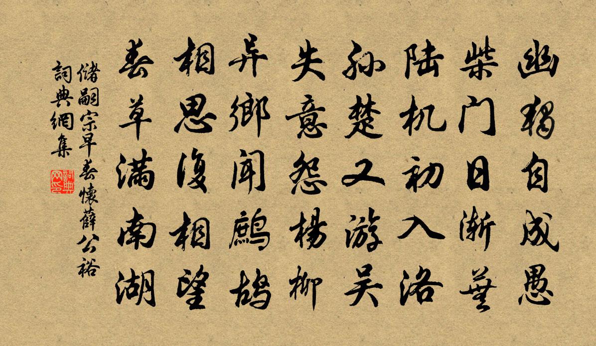 詩詞名句歷史字典書法欣賞書法字典國語詞典說文解字康熙字典古漢語字典標 題 作 者 詩 句 早春懷薛公裕作者:儲嗣宗 朝代:唐代早春懷薛公裕原文幽獨自成愚,柴門日漸蕪。陸機初入洛,孫楚又游吳。失意怨楊柳,異鄉聞鷓鴣。相思復相望,春草滿南湖。詩詞問答問:早春懷薛公裕的作者是誰?答:儲嗣宗問:早春懷薛公裕寫於哪個朝代?答:唐代問:早春懷薛公裕是什麼體裁?答:五律儲嗣宗早春懷薛公裕書法欣賞早春懷薛公裕書法作品注釋全唐詩:卷594-25詩詞推薦賣殘牡丹魚玄機〔唐代〕臨風興嘆落花頻,芳意潛消又一春。應為價高人不問,卻緣香甚蝶難親。紅英只稱生宮裡,翠葉那堪染路塵。及至烏夜啼(中秋)趙鼎〔宋代〕雨餘風露悽然。月流天。還是年時今夜、照關山。收別淚。持杯起。問嬋娟。問我扁舟流蕩、幾時還。陳時中法台得郡而歸喜而成詩吳芾〔宋代〕去歲秋風話別離,今秋俄報有歸期。自應冠豸登三院,何遽憑熊把一麾。治行佇為千里最,才猷已是九重知。莫辭艮山閣家之巽〔宋代〕樂山仁者寂不動,面壁老胡機械深。艮背行庭無別義,佛心即是伏羲心。玉爐三澗雪 贈安抱真等王丹桂〔元代〕魚在迷津苦海,隨波逐浪漂游。閒拋香餌下綸鉤。一釣俄然回首。也是宿緣深重,一齊萬事都休。前途何處是程頭詠廿四氣詩·小暑六月元稹〔唐代〕倏忽溫風至,因循小暑來。竹喧先覺雨,山暗已聞雷。戶牖深青靄,階庭長綠苔。鷹鸇新習學,蟋蟀莫相催。辛卯元日三首方回〔宋代〕六十年前五歲兒,夢魂歷歷萬艱危。數聲春雨微中酒,絕好梅花大欠詩。老病自應無世味,退修焉用要人知。十兄題秩巴寨朱汝賢〔宋代〕十大曲破寰海知,六么對舞纖腰肢。秩巴古寨士解圍,譜傳建業隆興時。天匏作腔豺臠皮,竹撩裊繞疊指麾。慢曲華清宮司馬光〔宋代〕新豐雞犬稀,薊北馬秋肥。金殿翠華去,玉階紅葉飛。荒林上路廢,溫谷舊流微。嗟此非人事,何須問是非。送劉朝美侍郎歸蜀關耆孫〔宋代〕清議久不作,世無公是非。只因翻故紙,不覺蹈危機。東壁夢初斷,西山蕨正肥。十年成底事,贏得載書歸。再留幾復黃庭堅〔宋代〕客興蓮藕敝鶉衣,蓮藕囊金罄褭蓮藕蹄。羸驂蓮藕多斷轡,垢發不勝篦。道德千年事,窮通一理齊。晚田猶溉種,虎丘六絕句點頭石范成大〔宋代〕當年揮塵講何經,賺得堅頑側耳聽。我自吟詩無法說,石頭莫作定盤星。桐柏山胡融〔宋代〕清曉騎白鹿,直上桐柏山。冊環若城郭,琪樹郁參天。青猨導我路,如入崆峒巔。瑤草被阪綠,瓊蕊凌霜繁。旁瞰觀佽飛斬蛟龍圖贊李白〔唐代〕佽飛斬長蛟,遺圖畫中見。登舟既虎嘯,激水方龍戰。驚波動連山,拔劍曳雷電。鱗摧 * 下,血染滄江變。感此贈王弘遠曹攄〔魏晉〕採石他山。攻璞南荊。雖無和璧。冀收瑤瓊。日月愈久。曾無玉聲。傾心注耳。寂焉靡聽。桃李不報。徒勞我誠。□□□□□□□卷後劉克莊〔宋代〕□□□□□□□,□□□梁一點塵。繞樹都忘寒徹□,□□□□□□□。□□客至徘徊月,不怕天嗔漏□□,□□已酉三月二十一日夜夢中作鄭剛中〔宋代〕曲闌乾畔短籬邊,用意春工剪不圓。一夜西風借霜力,幽香噴出小金錢。留遊子明范成大〔宋代〕得得跫音喜,匆匆笑口開。牢愁攻易破,歸夢挽難回。我已疏茶碗,君今減酒杯。不知乘興棹,更得幾回來。玉樓春石孝友〔宋代〕台門瑞靄光陽動。人語鼓聲沈洶洶。觀風堂迥暗香飄,卷雨樓前寒翠擁。鋒車促入承天寵。丹詔銜來須彩鳳。五絲詠梅五十首呈史尚書釋紹嵩〔宋代〕夜起荊扉趁暗香,林間梅下卜齋房。寒窗安著清相向,清殺東坡錦繡腸。名句推薦寧添一斗,莫添一口。佚名《增廣賢文·上集》 雁引愁心去,山銜好月來。李白《與夏十二登岳陽樓》 風力雖尚勁,然徒步則汗出浹背。袁宏道《滿井遊記》 晚歲登門最不才,蕭蕭華發映金罍蘇洵《九日和韓魏公》 遊人不管春將老,來往亭前踏落花。歐陽修《豐樂亭遊春·其三》 道狹草木長,夕露沾我衣。陶淵明《歸園田居·其三》 蒼旻霽涼雨,石路無飛塵。岑參《暮秋山行》 柳鎖鶯魂,花翻蝶夢,自知愁染潘郎史達祖《夜合花·柳鎖鶯魂》 筆落驚風雨,詩成泣鬼神杜甫《寄李十二白二十韻》 與肩挑貿易,毋占便宜;見貧苦親鄰,須加溫恤。朱柏廬《朱子家訓·全文》