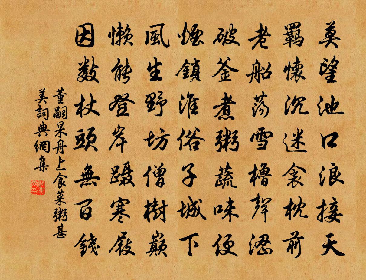 詩詞名句歷史字典書法欣賞書法字典國語詞典說文解字康熙字典古漢語字典標 題 作 者 詩 句 舟上食菜粥甚美作者:董嗣杲 朝代:宋代舟上食菜粥甚美原文莫望池口浪接天,羈懷沉迷衾枕前。老船盪雪櫓聲澀,破釜煮粥蔬味便。煙鎖淮俗子城下,風生野坊僧樹巔。懶能登岸躡寒屐,因數杖頭無百錢。詩詞問答問:舟上食菜粥甚美的作者是誰?答:董嗣杲問:舟上食菜粥甚美寫於哪個朝代?答:宋代董嗣杲舟上食菜粥甚美書法欣賞舟上食菜粥甚美書法作品詩詞推薦至日有感二首張耒〔宋代〕一臥孤村兩見冬,獨搔華發思無窮。荒山極目漫汗雪,老樹當庭晝夜風。佳節妻兒具樽酒,茅齋斟酌慰愁翁。未央張制置珏第五十一文天祥〔宋代〕氣敵萬人將,獨在天一隅。向使國不亡,功業竟何如。眼兒媚黃公度〔宋代〕羊,嘗遺示梅詞。公依韻和之。初公被召命而西過分水嶺,有詩云:“嗚咽泉流萬仞峰,斷腸從此各西東。誰知不奉陪安守登膴原觀沈與求〔宋代〕江南多佳山,駢首闖城郭。緬懷在坦夷,要使一見廓。邦侯王事餘,幽致到丘壑。散策占城陰,含睇及民瘼。愛此李萬州輓詩項安世〔宋代〕仙李來南日,熙寧去國人。一身辭赤芾,四世尚朱輪。桑梓推前輩,葭莩接世姻。傷心挽耆舊,不獨為情親。同夢得和思黯見贈來詩中先敘三人同宴之歡…兼吟鄙懷白居易〔唐代〕醉伴騰騰白與劉,何朝何夕不同游。留連燈下明猶飲,斷送尊前倒即休。催老莫嫌孫稚長,加年須喜鬢毛秋。教他夜出芙蓉堂宋庠〔宋代〕北沼涼歸早,西軒火正流。螢光偏愛夜,蛩語最知秋。好月因雲暗,清風為樹留。煙來昏翠幕,霧下失滄洲。河轉酬泗州韋中丞埇上日寄贈兼次本韻薛能〔唐代〕魯儒相悟欲成空,學盡文章不見功。官自掖垣飄海上,鎮從隨岸入山中。嘗遭火發瞿雲宅,爭得天如老氏弓。何意金陵白楊十字巷李白〔唐代〕白楊十字巷,北夾湖溝道。不見吳時人,空生唐年草。天地有反覆,宮城盡傾倒。六帝餘古丘,樵蘇泣遺老。山口曉望蘇欽〔宋代〕喜鵲寒鴉噪晚田,山前茅舍起炊煙。小橋敗葉風頻掃,斜月平蕪犢自眠。酹江月(題烏江項羽廟)汪宗臣〔宋代〕白蛇宵斷,逐鹿人、交趁罾魚群起。赤幟雄張軍縞素,龍種天生大器。堪鄙猴冠,自為狼藉,楚帳多塵壘。膽寒垓自責二首朱淑真〔宋代〕女子弄文誠可罪,那堪詠月更吟風。磨穿鐵硯非吾事,繡折金針卻有功。悶無消遣只看詩,不見詩中話別離。添得蘇湖道間陳杰〔宋代〕風物瞻天咫,林塘占地幽。夾牆樓蔭術,跨岸屋藏舟。湖近家皆給,田腴歲再秋。幸生無事日,更隸浙西州。奉和聖制上巳於望春亭觀禊飲應制王維〔唐代〕長樂青門外,宜春小苑東。樓開萬井上,輦過百花中。畫鷁移仙妓,金貂列上公。清歌邀落日,妙舞向春風。渭水教授致政李君輓詩魏了翁〔宋代〕冠蓋任雲浮,門前日夜流。不為盱豫悔,肯作浚恆羞。科第聯五葉,詩書閒一丘。芸芸終有謝,贏得早歸休。舟過城門村,清曉雨止日出五首楊萬里〔宋代〕深村可笑是居民,生長深山野水濱。總出籬東攜稚子,走來岸上看官人。更漏子馮延巳〔唐代〕風帶寒,枝正好,蘭蕙無端先老。情悄悄,夢依依,離人殊未歸。褰羅幕,憑朱閣,不獨堪悲搖落。月東出,雁南月夜登樓黃庚〔宋代〕玉宇澄清暮靄收,吟邊怕倚仲宣樓。寒蟾千里夜如書,新雁一聲天欲秋。湖海誰青豪傑眼,風霜易白少年頭。更殘東峰亭各賦一物得棲煙鳥李岑〔唐代〕從來養毛羽,昔日曾飛遷。變轉對朝陽,差池棲夕煙。遇此枝葉覆,夙舉冀沖天。次韻徐影說見寄並呈牟存叟高斯得〔宋代〕東南有華屋,結構清江濆。規橅百年遠,庭宇無纖氛。前林藝杞梓,後圃植蘭蓀。嘉賓日還往,門戶生精魂。雖慚名句推薦庫無備兵,雖有義,不能征無義。墨子《墨子·05章 七患》 氣之輕清上浮者為天,氣之重濁下凝者為地。程登吉《幼學瓊林·卷一·天文》 家童掃蘿徑,昨與故人期。錢起《谷口書齋寄楊補闕》 暗燈涼簟怨分離,妖姬,不勝悲。閻選《河傳·秋雨》 秋菊有佳色,裛露掇其英。陶淵明《飲酒·其四》 大道之行也,天下為公。戴聖《禮記·禮運》 知之者不如行之者,行之者不如安之者。王通《中說·卷六·禮樂篇》 無情不似多情苦。一寸還成千萬縷。晏殊《玉樓春·春恨》 一點烽傳散關信,兩行雁帶杜陵秋。陸游《秋晚登城北樓》 前不見古人,後不見來者。陳子昂《登幽州台歌》