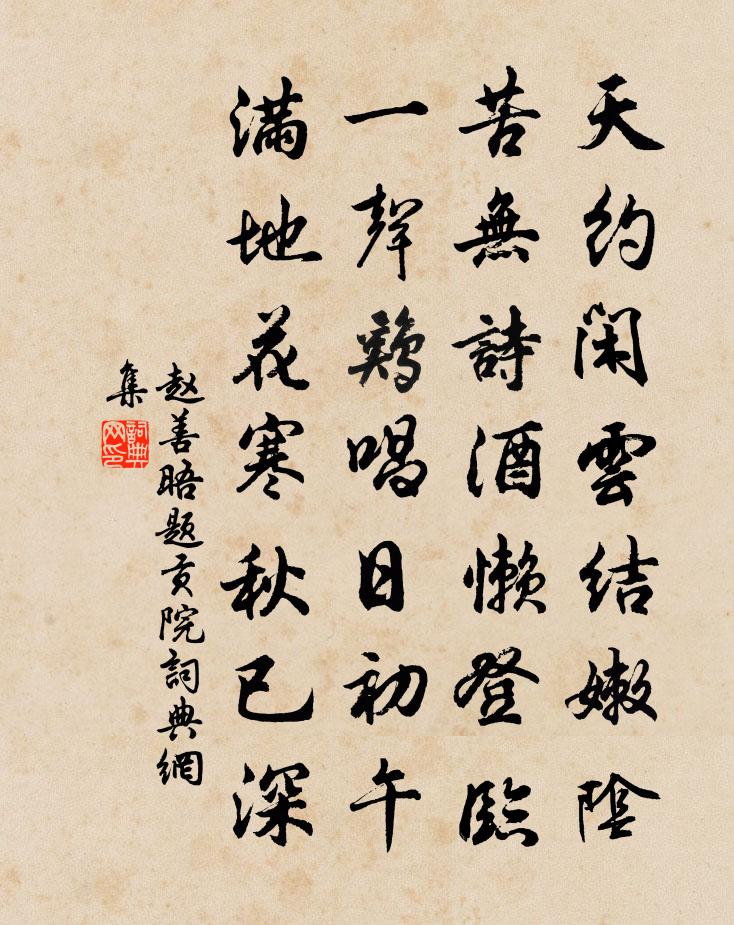 詩詞名句歷史字典書法欣賞書法字典國語詞典說文解字康熙字典古漢語字典標 題 作 者 詩 句 題貢院作者:趙善晤 朝代:宋代題貢院原文天約閒雲結嫩1-1陰,苦無詩酒懶登臨。一聲雞唱日初午,滿地花寒秋已深。詩詞問答問:題貢院的作者是誰?答:趙善晤問:題貢院寫於哪個朝代?答:宋代趙善晤題貢院書法欣賞題貢院書法作品詩詞推薦頌古十四首經題{中八兩邊各一點}釋可湘〔宋代〕不向經頭識本真,紙堆討甚法王身。未開梵夾承當去,免作循行數墨人。奉賀御製靈應瑞石夏竦〔宋代〕沉潛毓粹生嘉石,宥密開祥契上穹。降聖遠期真馭協,卜年遐祚寶符同。敻殊延喜靈珪上,詎比昭華瑞琯中。隱起秋日登滕王閣彭孫遹〔清代〕客路逢秋思易傷,江天煙景正蒼涼。依然極浦生秋水,終古寒潮送夕陽。高士幾回亭草綠?梅仙一去嶺雲荒。臨風危語宋祁〔宋代〕奔車下山朽索轡,倒行垂踵臨無地。棋子十二卵相累,手探驪珠觸龍睡。續侄溥賞酴醾勸酒二首陳著〔宋代〕醉時愁亦樂,老去日如年。慣見紅相別,欣逢綠又鮮。僧志月碧雲軒改為景雲軒因書二首李覯〔宋代〕長見江淹雜體詩,碧雲非是惠林詞。試言日莫佳人怨,何事高僧卻得知。雜詠五言五首劉克莊〔宋代〕敝廬吾亦愛,陋巷人不堪。痴兒蝸帶屋,老子繭名庵。病中七夕楊萬里〔宋代〕良辰美景底須來,苦惱如山正滿懷。蟬度清歌侑溪柳,花吹黃雪灑官槐。新秋風物俱堪賞,久病心惰自不佳。說與次韻芻父秋懷蘇泂〔宋代〕發短日益白,眼昏時見花。無人知若士,有句可雄夸。籬菊風前蕊,山梅雨後葩。平生蘇季子,猶足送年華。秋日途中李中〔唐代〕竹林已蕭索,客思正如讎。舊業吳江外,新蟬楚驛頭。遙天疏雨過,列岫亂雲收。今夕誰家宿,孤吟月色秋。小箬舟中望月楊萬里〔宋代〕偶於古柳檕春船,雲放千峰月滿川。跳入廣寒宮裡坐,下看碧玉鏡中天。斯須萬象都成雪,遮莫三更且未眠。歸到紫雲洞員興宗〔宋代〕君不見茂州長史文章翁,生平姓字懸天東,英言撼帝帝不從,建隆以來無此忠。今焉棲神寓玄躬,道在翳嘶峰外之次韻張守秋懷四首劉子翬〔宋代〕失計縈塵網,棲棲厭不情。興隨鳧舄遠,官比綺曹清。大案韋編古,深房紙瓦明。聖賢聊晤對,事業只平平。鷓鴣天(月夜諸院飲酒行令)趙長卿〔宋代〕寶篆煙消香已殘。嬋娟月色浸欄乾。歌喉不作尋常唱,酒令從他各自還。傳杯手,莫教閒。醉紅潮臉媚酡顏。相攜湖州貢焙新茶張文規〔唐代〕鳳輦尋春半醉回,仙娥進水御簾開。牡丹花笑金鈿動,傳奏吳興紫筍來。即事張嵲〔宋代〕屐齒休令破紫苔,柴門無客不須開。雨余籬菊埋光去,木落前山獻體來。送呂興元李新〔宋代〕霧豹平時豈一班,定將清對領威顏。東南民病知多少,莫把皇華誤出關。惜歡王建〔唐代〕當歡須且歡,過後買應難。歲去停燈守,花開把火看。曉發唐求〔唐代〕旅館候天曙,整車趨遠程。幾處曉鍾斷,半橋殘月明。沙上鳥猶在,渡頭人未行。去去古時道,馬嘶三兩聲。幽棲陸游〔宋代〕誰謂幽棲陋,茅茨足庇床。雨便梧葉大,風度練花香。浴佛兒童喜,繅絲婦女忙。朅來三十載,吾鬢固宜霜。名句推薦朝聞遊子唱離歌,昨夜微霜初渡河。李頎《送魏萬之京》 敖不可長,欲不可從,志不可滿,樂不可極。戴聖《禮記·曲禮上》 河畔青蕪堤上柳,為問新愁,何事年年有?馮延巳《鵲踏枝·誰道閒情拋棄久》 下床著新衣,初學小姑拜。毛鉉《 * 詞·下床著新衣》 客思吟商還怯。怨歌長、瓊壺暗缺。周密《玉京秋·煙水闊》 鄉淚客中盡,孤帆天際看。孟浩然《早寒江上有懷 / 早寒有懷 / 江上思歸》 南浦淒淒別,西風裊裊秋。白居易《南浦別》 江山故宅空文藻,雲雨荒台豈夢思。杜甫《詠懷古蹟五首·其二》 我家洗硯池邊樹,朵朵花開淡墨痕。王冕《墨梅》 嗚呼! 何時眼前突兀見此屋杜甫《茅屋為秋風所破歌》