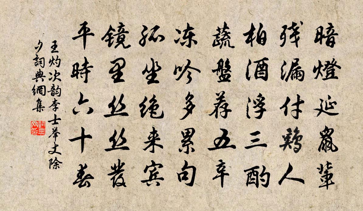 詩詞名句歷史字典書法欣賞書法字典國語詞典說文解字康熙字典古漢語字典標 題 作 者 詩 句 次韻李士舉丈除夕作者:王灼 朝代:宋代次韻李士舉丈除夕原文暗燈延鼠輩,殘漏付雞人。柏酒浮三酌,蔬盤薦五辛。凍吟多累句,孤坐絕來賓。鏡里絲絲髮,平時六十春。詩詞問答問:次韻李士舉丈除夕的作者是誰?答:王灼問:次韻李士舉丈除夕寫於哪個朝代?答:宋代王灼次韻李士舉丈除夕書法欣賞次韻李士舉丈除夕書法作品詩詞推薦用雪坡春色韻劉學箕〔宋代〕才出城門興便濃,晴光野色兩俱融。柳方染得三分綠,桃已熏成一半紅。山涌林巒荒寺隱,湖分港汊小舟通。相攜宴清都·初春盧祖皋〔宋代〕春訊飛瓊管。風日薄、度牆啼鳥聲亂。江城次第,笙歌翠合,綺羅香暖。溶溶澗淥冰泮。醉夢裡、年華暗換。料黛蝶戀花趙雍〔元代〕枝上流鶯千囀巧。好夢方成,又把人驚覺。臨鏡慵妝眉淡掃。羅衣寬盡腰肢小。別久啼多音信少。應是嬌波,不似東皋王安石〔宋代〕起伏晴雲徑,縱橫暖水陂。草長流翠碧,花遠沒黃鸝。楚制從人笑,吳吟得自怡。東皋興不淺,遊走及芳時。寄太湖隱者陸游〔宋代〕青松伐作薪,白玉碎作塵,雖雲質已毀,見者猶悲辛。磊砢任棟樑,溫潤中琮璧,豈以捐空山,遂比凡木石。酈生次韻樂先生吳中見寄八首其范成大〔宋代〕幾多螻蟻與王侯,往古來今共一丘。遮莫功名掀宇宙,百年兩角寄蝸牛。過蘇州蘇舜欽〔宋代〕東出盤門刮眼明,蕭蕭疏雨更陰晴。綠楊白鷺俱自得,近水遠山皆有情。萬物盛衰天意在,一身羈苦俗人輕。無窮沁園春方岳〔宋代〕子盍規夫,商丘之木,有樗不才。縱斧斤睥睨,何妨雪立,風煙傲兀,怎問春回。老子似之,倦遊久矣,歸曬漁蓑繡嶺宮詞李洞〔唐代〕春日遲遲春草綠,野棠開盡飄香玉。繡嶺宮前鶴髮翁,猶唱開元太平曲。句晏殊〔宋代〕潛嶺岧嶢副祝融。朝來郭印〔宋代〕朝來仍獨坐,心事有誰知。啅鵲傳枝喜,鳴鳩喚雨悲。整冠驚發短,覽鏡覺顏衰。白日堂堂去,長繩不可羈。句李全之〔宋代〕還山終戴鹿皮巾。讀陳平傳晃沖之〔宋代〕劉郎白首尚多疑,百戰功臣跡轉危。致使文成謝封邑,未如還薦魏無知。題鄭承事所作惠蘭三首陳鑒之〔宋代〕蘭如君子蕙如士,此評吾得這涪翁。有餘不足姑勿率,畢竟清幽氣類同。行香子朱彝尊〔清代〕蠶月桑津,輕浪魚鱗。好風光最易愁人。相逢休便,閒卻殘春。待播船回,游驄去,又因循。歌罷梁塵,舞散花茵題時遁澤畫卷十首王柏〔宋代〕斷岸臨江渚,風聲瑟瑟寒。蒼髯五君子,莫作大夫看。寒食前一日行部過牛首山七首楊萬里〔宋代〕帛山恨骨已寒灰,盡禁廚煙肯更回。老病不禁餿食冷,杏花餳粥湯將來。暮春王安石〔宋代〕春期行晼晚,春意剩芳菲。曲水應修禊,披香未試衣。雨花紅半墮,煙樹碧相依。悵望夢中地,王孫底不歸。憶昔行送李成這徵君程公許〔宋代〕憶昔與郡同射策,同舟同館心膠漆。萬言人奏甘棄置,賴有湖山好看客。歸裝濡滯及黃池,半菽寒菹作除夕。慨慷次韻西鄰新居兼乞酒魚玄機〔唐代〕一首詩來百度吟,新情字字又聲金。西看已有登垣意,遠望能無化石心。河漢期賒空極目,瀟湘夢斷罷調琴。況逢名句推薦浮雲蔽白日,遊子不顧返。佚名《行行重行行》 空獨倚東風,芳思誰寄。周密《繡鸞鳳花犯·賦水仙》 不充詘於富貴,不遑遑於所欲。姚察、姚思廉《梁書·列傳·卷五十》 樓頭小婦鳴箏坐,遙見飛塵入建章。王昌齡《青樓曲二首》 修己而不責人,則免於難。左丘明《左傳·閔公·閔公二年》 法令至行,公平無私劉向《戰國策·秦一·衛鞅亡魏入秦》 叢菊兩開他日淚,孤舟一系故園心。杜甫《秋興八首·其一》 又如知痛,必已自痛了,方知痛。王陽明《傳習錄·卷上·徐愛錄》 風煙俱淨,天山共色。吳均《與朱元思書》 暗數十年湖上路,能幾度,著娉婷。盧祖皋《江城子·畫樓簾暮卷新晴》