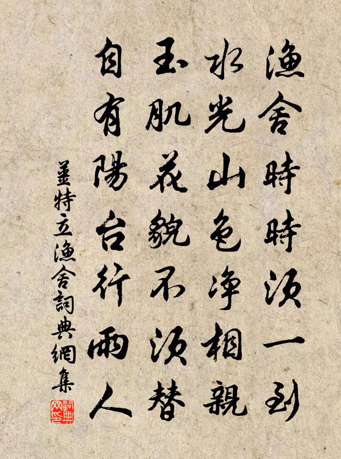 詩詞名句歷史字典書法欣賞書法字典國語詞典說文解字康熙字典古漢語字典標 題 作 者 詩 句 漁舍作者:姜特立 朝代:宋代漁舍原文漁舍時時須一到,水光山色淨相親。玉肌花貌不須替,自有陽台行雨人。詩詞問答問:漁舍的作者是誰?答:姜特立問:漁舍寫於哪個朝代?答:宋代姜特立漁舍書法欣賞漁舍書法作品詩詞推薦虞美人黃機〔宋代〕十年不作湖湘客。亭堠催行色。淺山荒草記當時。篠竹籬邊羸馬、向人嘶。書生萬字平戎策。苦淚風前滴。莫辭衫段釋之客都下作詩道其懷宋祁〔宋代〕密雪天街客履穿,更將羈思敵彫年。無人載酒誰同樂,有物燒愁便許燃。腷臆文章千牘上,蕭條光景二毛邊。我能王孫游二首曹勛〔宋代〕紅芳開繡戶,碧草襯斜陽。樓上頻回首,思君道路長。遊春集未成再賦呈趙司法曾豐〔宋代〕我來已作一年痴,敢問諸公幾許時。客里酒杯切到口,風前花片半辭枝。尚余魏紫姚黃在,安用桃紅李白為。公事九鎖山十詠王易簡〔宋代〕嵐陰四圍合,澗水數折流。試手翻碧海,卷雨來青虬。靜躁為人役,蓄泄同神謀。長歌亭上詩,飛仙不可留。倚欄假日山行釋正覺〔宋代〕平生胸中雲外峰,有閒便與扶瘦筇。但知一世丘壑味,想得十分猿鳥從。明見秋容山洗雨,清可人意風吟松。歸來贈畫梅呂生樓鑰〔宋代〕西湖處士賦疎影,未似希真好樂章。豈是無情甘澹泊,受它風月幾淒涼。四月二十日登烏奴山卷剛中〔宋代〕烏奴樓閣起江皋,特地攜樽上最高。城閣帶煙無十里,舳艫銜運過千艘。箇中官事暫時少,明日吾生依舊勞。未到雪作曾幾〔宋代〕臥聞微霰卻無聲,起看階前又不能。一夜紙窗明似月,多年布被冷於冰。履穿過我柴門客,笠重歸來竹院僧。三白滿庭芳 贈文登小王先生馬鈺〔元代〕身為環堵,重封重鎖。無著無漏無破。閒里尋閒,閒中有閒功果。常守常清常靜,便獨行、獨坐獨臥。忘人忘我。讀吟嘯集彭秋宇〔宋代〕興廢明知數有天,臣心感激義當然。孔明尚欲西都蜀,王蠋寧甘北面燕。鳳鶴不靈淒落日,蛟龍已逝冷長川。丈夫雨二首趙蕃〔宋代〕旱極乃得雨,悽然天已秋。譬如病且革,藥劑方一投。不猶愈於無,庶幾千一瘳。未聞失東隅,果有桑榆收。閿鄉寓居十首(一作卜居,一本閿鄉上有壬戌歲三字)吳融〔唐代〕六載抽毫侍禁闈,可堪多病決然歸。五陵年少如相問,阿對泉頭一布衣。再和劉克莊〔宋代〕世味澆漓酒趣深,對花無客亦孤斟。飢來肯羨乞墦食,貧殺不貪諛墓金。耄齒未妨師抑戒,高譚何似守規箴。吾今化州化州郡守〔宋代〕羅川帶郭古南州,陵水環城小庾樓。雲淡青林無過雁,雨涵丹荔集鳴鳩。叨榮銅竹三經夏,勸課農桑屢有秋。好趁題江國錄先生石室陳尚文〔宋代〕海甯邑屋千山環,幽人更愛山中山。山城已遠人煙寒,江君石室深巑屼。聞君十載棲長安,焉能斂翼縈岩巒。臥龍次韻環翠亭鄭俠〔宋代〕天圍湖海淨團圞,水色山光四座寒。暗結濃陰森萬木,靜鋪遙碧擁千巒。共斟綠醑看浮蟻,遙見孤舟下遠湍。是處相和歌辭。相逢行二首李白〔唐代〕朝騎五花馬,謁帝出銀台。秀色誰家子,雲車珠箔開。金鞭遙指點,玉勒近遲回。夾轂相借問,疑從天上來。憐腸三月二十日晚酌陸游〔宋代〕暫因賜沐作閒身,太息才餘一日春。委地落花新著雨,穿簾歸燕不生人。衛青此日怪長揖,王翰當年謀卜鄰。商略次韻章茂獻謝茶周必大〔宋代〕墨談名高筆有花,胸中五色補皇家。諫書夜奏常焚稿,講舌時乾每賜茶。秘祝重尋丹灶火,長生元笑紫河車。新詩名句推薦未老莫還鄉,還鄉須斷腸。韋莊《菩薩蠻·人人盡說江南好》 將不可驕,驕則失禮,失禮則人離,人離則眾判。諸葛亮《將苑·卷一·將驕吝》 大樹底下好遮陰張南莊《何典·第十回》 不見年年遼海上,文章何處哭秋風?李賀《南園十三首》 去其智,絕其能,下不能意。韓非及後人《韓非子·主道》 不可同日而語畢沅《續資治通鑑·宋紀·宋紀七十三》 千里馬常有,而伯樂不常有。韓愈《馬說》 深居俯夾城,春去夏猶清。李商隱《晚晴》 執古之道,以御今之有。能知古始,是謂道紀。老子《老子·道經·第十四章》 露蓼香涇,記年時相識吳文英《尾犯·甲辰中秋》