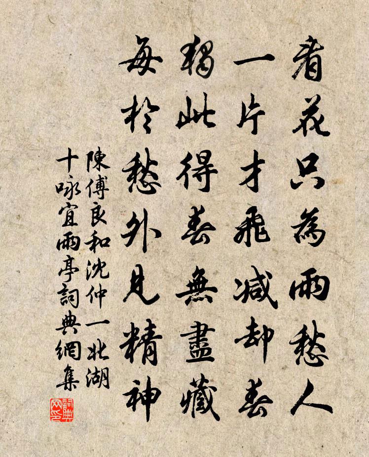 詩詞名句歷史字典書法欣賞書法字典國語詞典說文解字康熙字典古漢語字典標 題 作 者 詩 句 和沈仲一北湖十詠宜雨亭作者:陳傅良 朝代:宋代和沈仲一北湖十詠宜雨亭原文看花只為雨愁人,一片才飛減卻春。獨此得春無盡藏,每於愁外見精神。詩詞問答問:和沈仲一北湖十詠宜雨亭的作者是誰?答:陳傅良問:和沈仲一北湖十詠宜雨亭寫於哪個朝代?答:宋代陳傅良和沈仲一北湖十詠宜雨亭書法欣賞和沈仲一北湖十詠宜雨亭書法作品詩詞推薦桃源憶故人歐陽修〔宋代〕鶯愁燕苦春歸去。寂寂花飄紅雨。碧草綠楊歧路。況是長亭暮。少年行客情難訴。泣對東風無語。目斷兩三煙樹。長春花鄭剛中〔宋代〕小蕊頻頻包碎綺,嫩紅日日醉朝霞。氣溫已是如三月,更向亭前堆落花。感時晁說之〔宋代〕千里逋亡蒲柳身,淚痕長短送殘春。望惟書問平安到,樂在兒童讀誦聲。桑海恩深變未得,龍蛇躁甚起何因。即看香閨十詠鮫綃帨張玉孃〔宋代〕半幅生綃雪色寒,鮫人相贈比琅玕。華清浴罷恩波媚,南浦傷時詠雨斑。水仙高文虎〔宋代〕朝朝暮暮泣陽台,愁絕冰魂水一杯。巫峽雲深迷昨夢,瀟湘雪重寫余哀。菊如相得無先意,梅亦傾心敢後開。惱徹孫賓臾道人蘇轍〔宋代〕萬里飄然不繫舟,酒壚一笑便相投。千金不換金丹訣,何事惟須一布裘。同誼夫國才餞季然於普門院取壁間五字詩各探王灼〔宋代〕塵榻為子下,柴扉為子開。從今斷還往,一室長莓苔。揚州寒食贈屯田張員外成均吳博士同年殿省柳王禹偁〔宋代〕前年寒食節,待詔直內庭。休暇百官出,獨掩深嚴扃。近侍不敢醉,賜酒空滿瓶。閒就通中枕,時聞索上鈴。思入欸乃歌二章戲王穉川黃庭堅〔宋代〕從師學道魚千里,蓋世成功黍一炊。日日倚門人不見,看盡林烏反哺兒。甘州張炎〔宋代〕乎絕頂,舊有浮遠堂,今廢。俯長江、不占洞庭波,山拔地形高。對扶疏古木,浮圖倒影,勢壓雄濤。門掩翠微僧好事近(代人書扇)楊冠卿〔宋代〕晚起倦梳妝,斜壓翠鬟雲鬢。手捻花枝輒笑,問青鸞音信。繡簾慵卷玉鉤垂,風篁奏餘韻。燈火黃昏院落,報雕鞍水調歌頭(和吳允成游靈洞韻)陳亮〔宋代〕人愛新來景,龍認舊時湫。不論三伏,小住便覺凜生秋。我自醉眠其上,任是水流其下,湍激若為收。世事如斯去齊雲亭宋祁〔宋代〕歸雲片片鳥行沒,晚日寸寸城陰生。林下本無蘇合彈,棲烏何事向人驚。龜堂雜興陸游〔宋代〕曳杖東岡信步行,夕陽偏向竹間明。丹楓吹盡鴉聲樂,又得霜天一日晴。送李校書二十六韻杜甫〔唐代〕代北有豪鷹,生子毛盡赤。渥窪騏驥兒,尤異是龍脊。李舟名父子,清峻流輩伯。人間好少年,不必須白晰。十五立秋方回〔宋代〕暑赦如聞降德音,一涼歡喜萬人心。雖然未便梧桐落,終是相將蟋蟀吟。 * 銀河正牛女,詰朝紅日尾觜參。朝廷舜待者以拙自處請語為警釋紹曇〔宋代〕大地人求巧,子獨全其拙。吃飯倒把匙,刺眼翻著襪。只知困守株,不愁飛辯月。天真未解分,混沌一團鐵。抱璞江上春事晁公溯〔宋代〕春來江上解霜嚴,群柏周廬筍出檐。突兀狸頭蒙紫籜,參差龍甲長蒼髯。閒思井臼高人宅,懶傍車輿刺史幨。留滯晨至湖上陸游〔宋代〕劍南無劇暑,長夏更宜人。啼鳥常終日,幽花不減春。荷香浮綠酒,藤露落烏巾。莫作天涯想,翛然夢裡身。行次穎州聞張甥宗亮不捷鄉薦以詩唁而迎之梅堯臣〔宋代〕風前汝 * ,雨冷江南書。始嘆與意異,何慚定監疏。但能存楚玉,切莫道黔驢。不負當時約,馳迎一乘車。名句推薦桃今百餘尺,花落成枯枝。李白《獨不見》 罔談彼短,靡恃己長。周興嗣《千字文·全文》 回看射鵰處,千里暮雲平。王維《觀獵》 一點烽傳散關信,兩行雁帶杜陵秋。陸游《秋晚登城北樓》 早知潮有信,嫁與弄潮兒。李益《江南曲》 肯救人坑坎中,便是活菩薩王永彬《圍爐夜話·第二八則》 花片片飛風弄蝶,柳陰陰下水平橋。張先《浣溪沙·樓倚春江百尺高》 平生不下淚,於此泣無窮。李白《江夏別宋之悌》 治民者,禁奸於未萌。韓非及後人《韓非子·心度》 論至德者不和於俗,成大功者不謀於眾。司馬遷《史記·趙世家》