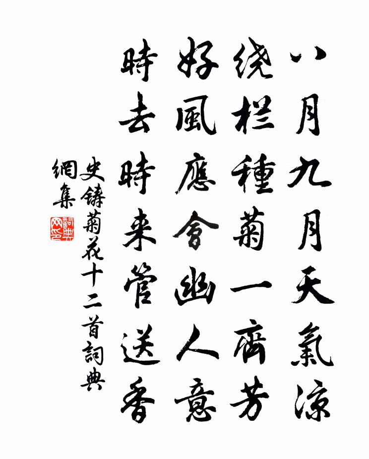詩詞名句歷史字典書法欣賞書法字典國語詞典說文解字康熙字典古漢語字典標 題 作 者 詩 句 菊花十二首作者:史鑄 朝代:宋代菊花十二首原文八月九月天氣涼,繞欄種菊一齊芳。好風應會幽人意,時去時來管送香。詩詞問答問:菊花十二首的作者是誰?答:史鑄問:菊花十二首寫於哪個朝代?答:宋代史鑄菊花十二首書法欣賞菊花十二首書法作品詩詞推薦清平樂(詠橄欖燈球兒)侯置〔宋代〕縷金剪彩。茸綰同心帶。整整雲鬟宜簇戴。雪柳鬧蛾難賽。休夸結實炎州。且看指面纖柔。試問苦人滋味,何如插句元絳〔宋代〕使君麾蓋傲煙霞。制梅花湯陳郁〔宋代〕南枝開處覓春光,摘得冰葩密瓮藏。留煮牛湯消暑渴,吟騷才頰有浮香。贈將軍杜光庭〔唐代〕□□□□□□□,□□□□□□□。八表順風驚雨露,四溟隨劍息波濤。手扶北極鴻圖永,雲卷長天聖日高。未會題城南書院三十四詠張栻〔宋代〕暮從別野跨驢歸,風雨蕭蕭泥濺衣。出門回首且按轡,細聽泉聲和式微。病起吟邵雍〔宋代〕病作因循一月前,豈期為苦稍淹延。朝昏飲食是難進,軀體虛羸不可言。既勸佳賓持酒盞,更將大筆寫詩篇。始知亮禪人持缽求頌釋正覺〔宋代〕家林一錫飛,炊處青煙微。嚴默起禪板,虛通轉化機。溪寒秋染色,月冷夜流輝。莫學西山亮,此行宜早歸。貴妃閣春帖子許應龍〔宋代〕昨夜東風入律新,朝來蕙露淨無塵。玉觴椒酒陪歡宴,總道今春勝舊春。春日小園雜賦陸游〔宋代〕久矣雲霄鎩羽翰,小園聊得賦春寒。風生鴨綠紋如織,露染猩紅色未乾。不向山丘嘆零落,且從兒女話團欒。人言送董揚休比部知真州蘇轍〔宋代〕奏課西南最,分符江海沖。往來觀惠術,蟠錯試余鋒。文字從堆案,樽罍強解容。金山只隔水,時復聽晨鐘。題張粹夫萬卷樓馮時行〔宋代〕儒生讀書不貴書,枕頭閣腳醉夢余。反不若浮屠,寶貝為函金作字,海龍扶出凌空虎。君今收拾一萬卷,置在高樓訴衷情(因見早梅作)丘崈〔宋代〕十分風味似詩人。有些子太清生。只應最嫌俗子,消瘦卻盈盈。風乍靜,雪初晴。月微明。泊然疏淡,莫是無情,題居延古城贈喬十二知之陳子昂〔唐代〕聞君東山意,宿昔紫芝榮。滄洲今何在,華發旅邊城。還漢功既薄,逐胡策未行。徒嗟白日暮,坐對黃雲生。桂枝立春帖子太上皇帝閣周必大〔宋代〕有道春偏好,無為日更舒。齊心大庭館,何處覓華胥。蕙蘭芳引(林鐘商,俗名歇指調賦藏一家吳郡王畫蘭)吳文英〔宋代〕空翠染雲,楚山迥故人南北。秀骨冷盈盈,清洗九秋澗綠。奉車舊畹,料未許、千金輕儥。淺笑還不語,蔓草羅裙問天方逢辰〔宋代〕胭脂十二萬風塵,一樣胞胎父母身。天欲殺之胡至此,厥初何用降生民。丙子重陽觸事有賦絕句七首程公許〔宋代〕去年今日枕江樓,對酒談經夜不休。聞道黃花滿同谷,莫教兒輩覺風流。飛雪滿群山蔡伸〔宋代〕冰結金壺,寒生羅幕,夜闌霜月侵門。翠筠敲竹,疏梅弄影,數聲雁過南雲。酒醒敧粲枕,愴猶有、殘妝淚痕。繡姜總管輓詞樓鑰〔宋代〕及見開元盛,曾聞正始音。雕蟲徒壯歲,冠鶡豈初心。論事風生席,疏恩帶錫金。精神空滿腹,愁絕病沈沈。枕上六言二首范成大〔宋代〕寒更寂歷向曉,短夢參差屢驚。雞鳴似喚我醒,犬吠知有人行。名句推薦榮所眾羨,亦引眾怨。來俊臣《羅織經·固榮卷第六》 離人心上秋。吳文英《唐多令·惜別》 萬里不惜死,一朝得成功。高適《塞下曲》 東山老,可堪歲晚,獨聽桓箏。葉夢得《八聲甘州·壽陽樓八公山作》 阿婆還似初笄女,頭未梳成不許看。袁枚《遣興》 鳥向平蕪遠近,人隨流水東西。劉長卿《謫仙怨·晴川落日初低》 一涓春水點黃昏,便沒頓、相思處。史達祖《留春令·詠梅花》 詩成自寫紅葉,和恨寄東流。晏幾道《訴衷情·憑觴靜憶去年秋》 夜來風雨聲,花落知多少。孟浩然《春曉》 別浦今朝暗,羅帷午夜愁李賀《七夕》