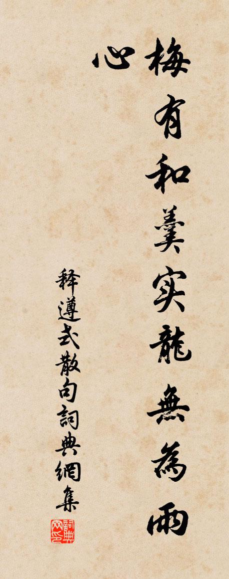 詩詞名句歷史字典書法欣賞書法字典國語詞典說文解字康熙字典古漢語字典標 題 作 者 詩 句 句作者:釋遵式 朝代:宋代句原文梅有和羹實,龍無為雨心。詩詞問答問:句的作者是誰?答:釋遵式問:句寫於哪個朝代?答:宋代釋遵式句書法欣賞句書法作品詩詞推薦即事十首劉克莊〔宋代〕吾生分裂後,不到舊京游。空作樊樓夢,安知在越樓。送考功武員外學士使嵩山置舍利塔歌徐堅〔唐代〕伊川別騎,灞岸分筵。對三春之花月,覽千里之風煙。望青山兮分地,見白雲兮在天。寄愁心於樽酒,愴離續於清題賈氏超然堂胡寅〔宋代〕超然華榜照新堂,兀爾忘機入醉鄉。城外有山心共遠,壺中無事日偏長。月留粉壁檀欒影,欄俯冰池菡萏香。最愛隕葉無可〔唐代〕繞巷夾溪紅,蕭條逐北風。別林遺宿鳥,浮水載鳴蟲。石小埋初盡,枝長落未終。帶霜書麗什,閒讀白雲中。時運 其一陶淵明〔魏晉〕邁邁時運,穆穆良朝。襲我春服,薄言東郊。山滌餘靄,宇曖微霄。有風自南,翼彼新苗。感皇恩晁端禮〔宋代〕蜀錦滿林花,三年重到。應被花枝笑人老。半開微謝,占得幾多時好。便須拼痛飲、花前倒。醉中但記,紅圍綠繞張十八員外以新詩二十五首見寄郡樓月下吟玩…寄微之白居易〔唐代〕秦城南省清秋夜,江郡東樓明月時。去我三千六百里,得君二十五篇詩。陽春曲調高難和,淡水交情老始知。坐到玉樓春秦觀〔宋代〕午窗睡起香銷鴨。斜倚妝檯開鏡匣。雲鬟整罷卻回頭,屏上依稀描楚峽。支頤痴想眉愁壓。咬損纖纖銀指甲。柔腸即事鄧深〔宋代〕水夾山圍近,天慳日到遲。塞沙擎巨石,古木障崇祠。黃藁畲田粟,青煙茅舍炊。兩村生理足,樂處幾人知。次陳秘書韻釋慧遠〔宋代〕保福當年閒借問,鵝湖驟步入僧堂。定盤星上無深意,莫認鉤頭些子香。上西平/金人捧露盤張元乾〔宋代〕臥扁舟,聞寒雨,數佳期。又還是、輕誤仙姿。小樓夢冷,覺來應恨我歸遲。鬢雲松處,枕檀斜、露泣花枝。名利峽路山行即事十首袁說友〔宋代〕浩蕩東風晚更嚴,黃埃得得上霜髯。細題今日山中景,更有前頭萬點尖。夔州元宵和曾端伯韻四首郭印〔宋代〕斗轉寅初月正中,昏燈達旦九衢通。漢家祀事傳來遠,想見當時太一宮。郊廟歌辭。昭德皇后廟樂章。舒和佚名〔唐代〕金枝羽部徹清歌,瑤台肅穆笙磬羅。諧音遍響合明意,萬類昭融靈應多。慶長春(壽戴一軒)佚名〔宋代〕有酒如澠,便開懷痛飲,我歌君拍。世事輪雲都莫問,只要顏紅鬢黑。鸝燕風清,鴛鴦水暖,打當生申節。薰風來上楊大諫張詠〔宋代〕東南雲物異,端正產賢人。才大可高古,名雄始入秦。文江橫舫楫,藝輔劃荊榛。民事憂偏切,金門老更親。天教夜宴南陵留別李嘉祐〔唐代〕雪滿前庭月色閒,主人留客未能還。預愁明日相思處,匹馬千山與萬山。宣州雜詩二十首梅堯臣〔宋代〕信讒多見逐,伐國豈無仁。屈子行江畔,昭王問水濱。包茅曾責貢,香草自持紉。莽蒼山川在,漁歌屬野人。題太岳院壁林焞〔宋代〕我來勸農值春雨,傍人笑我身藍縷。我身藍縷分當然,唯有擔夫愁艱阻。汝擔夫,聽我語,桑 * 粟生於土。若非題崇仙觀知足軒張繼先〔宋代〕此性本無一物,涓水亦自圓明。借問先生足處,軒前月白風清。名句推薦只應守寂寞,還掩故園扉。孟浩然《留別王侍御維 / 留別王維》 君子以同道為朋,小人以同利為朋脫脫《宋史·列傳·卷七十八》 怨別自驚千里外,論交卻憶十年時。高適《東平別前衛縣李寀少府 / 送前衛縣李宷少府》 生長富貴叢中的,嗜欲如猛火、權勢似烈焰。洪應明《菜根譚·概論》 淮南皓月冷千山,冥冥歸去無人管。姜夔《踏莎行·自沔東來》 長歌吟松風,曲盡河星稀。李白《下終南山過斛斯山人宿置酒》 春城無處不飛花,寒食東風御柳斜。韓翃《寒食 / 寒食日即事》 今日江頭兩三樹,可憐和葉度殘春。元稹《離思五首》 清晨入古寺,初日照高林。常建《題破山寺後禪院》 小荷才露尖尖角,早有蜻蜓立上頭。楊萬里《小池》