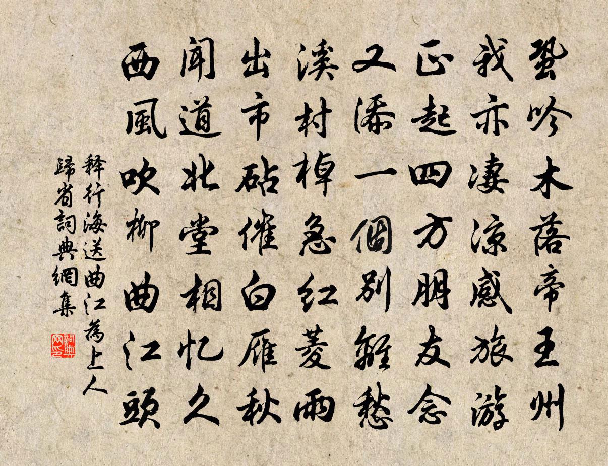 詩詞名句歷史字典書法欣賞書法字典國語詞典說文解字康熙字典古漢語字典標 題 作 者 詩 句 送曲江為上人歸省作者:釋行海 朝代:宋代送曲江為上人歸省原文蛩吟木落帝王州,我亦淒涼感旅遊。正起四方朋友念,又添一個別離愁。溪村棹急紅菱雨,出市砧催白雁秋。聞道北堂相憶久,西風吹柳曲江頭。詩詞問答問:送曲江為上人歸省的作者是誰?答:釋行海問:送曲江為上人歸省寫於哪個朝代?答:宋代釋行海送曲江為上人歸省書法欣賞送曲江為上人歸省書法作品詩詞推薦海棠吟金朋說〔宋代〕艷質妖娜放早春,誰教帝主溺初心。椒房一睡才扶起,徹動漁陽鼙鼓聲。春日獨游上林院後亭見櫻桃花奉寄希深聖俞仍歐陽修〔宋代〕昔日尋春地,今來感◇華。人行已荒徑,花發半枯槎。高榭林端出,殘陽水外斜。聊持一◇酒,徙倚憶天涯。喜李景魏就熊伯岩縣尉招樂雷發〔宋代〕長歌白石草廬深,今抱園絲就賞音。溫飽不為兒輩計,行藏端在古人心。鱣魚堂上春開帳,鸂鶒灘前夜對衾。擬掛白含笑楊萬里〔宋代〕薰風曉破碧蓮莟,花意猶低白玉顏。一粲不曾容昜發,清香何自遍人間。村居即事六言十首劉克莊〔宋代〕風窗有竹相敲,地爐無葉可燒。亂書翻覆未了,一燈明滅頻挑。登四望亭王炎〔宋代〕春老飛花盡,園林遍綠陰。憑高聊寓目,念遠更傷心。劇郡才難稱,衰年病易侵。不如休歇去,吾意決投簪。訪羅孟弼竹園張栻〔宋代〕江梅獨立蔭頹牆,苔蘚封枝色老蒼。手剪荊榛增嘆息,眼中春意滿三湘。南窗偶書方岳〔宋代〕西風忽悽厲,皎月流素光。客從何方來,蘭佩芙蓉裳。揮琴發哀彈,夜寂山蒼蒼。可人者麴生,挽我無何鄉。醉中句溫益〔宋代〕少年曾接元公論,屢話南閩佛剎奇。經曠禪師舊院方乾〔唐代〕谷鳥散啼如有恨,庭花含笑似無情。更名變貌難休息,去去來來第幾生。退朝王安石〔宋代〕門外鳴騶送響頻,披衣強起赴雞人。火城夜闇雲藏闕,玉座朝寒雪被宸。邂逅欲成雙白鬢,蕭條難得兩朱輪。猶憐同高叔不愚如晦飲再次韻二首陳造〔宋代〕珠簾深里按金絲,幻出揚州杜牧詩。共引玻璃扶窈窕,更煩側理寫環奇。一歡有約能如原,四者求並每後時。卻念張公子行常建〔唐代〕一作花古意日出花乘釣舟,花裊裊持釣花竿。涉淇傍荷花,驄馬閒金鞍。俠客(使君)白雲中,腰間懸轆轤。出門雜曲歌辭。楊柳枝盧貞〔唐代〕一樹依依在永豐,兩枝飛去杳無蹤。玉皇曾采人間曲,應逐歌聲入九重。淵靚亭黃伯固〔宋代〕江山無古今,闡發自我輩。心期得地勝,有目皆一快。負郭西繚川,眾流翕以匯。水光開三面,結屋此其最。囂塵挽文文山鄧剡〔宋代〕憶公淚懸河,九地無處瀉。想公騎赤龍,請命蒼梧野。世人醉生死,翻笑獨醒者。焉知千載英,精爽皎不夜。義士祝英台近(寒食詞)韓淲〔宋代〕館娃宮,采香徑,范蠡五湖側。子夜吳歌,聲緩不須拍。崇桃積李花閒,芳洲綠遍,更冉冉、柳絲無力。試思憶。大淵寄道冠漢鏡各答以一首劉克莊〔宋代〕已掛朝冠了,煩君寄道冠。頭蓬不梳久,發禿欲簪難。簡便烏巾贅,清羸鶴氅寬。兒童怪崖異,便作羽流看。雁足題黃司直園戴叔倫〔唐代〕為憶去年梅,凌寒特地來。門前空臘盡,渾未有花開。欲自邯鄲趨府復從中山行覺風異常馬上作晁說之〔宋代〕山行豈不惡,清音興自長。風從嶻嶪來,不比人間涼。浮涼夸湛露,屈子自悲傷。披襟青苹末,玉也媚君王。驩見名句推薦迸籜分苦節,輕筠抱虛心。柳宗元《巽公院五詠·苦竹橋》 把酒祝東風,且莫恁、匆匆去。王安石《傷春怨·雨打江南樹》 入春才七日,離家已二年。薛道衡《人日思歸》 秋到邊城角聲哀,烽火照高台。陸游《秋波媚·七月十六日晚登高興亭望長安南山》 君子之學也,入乎耳,著乎心荀子《荀子·勸學》 不知馬骨傷寒水,惟見龍城起暮雲。王涯《塞下曲二首·其二》 佳游不可得,春風惜遠別。李白《登梅岡望金陵贈族侄高座寺僧中孚》 誠信者,天下之結也。管仲《管子·樞言》 城頭鐵鼓聲猶震,匣里金刀血未乾。王昌齡《出塞二首》 威加海內兮歸故鄉,安得猛士兮守四方劉邦《大風歌》