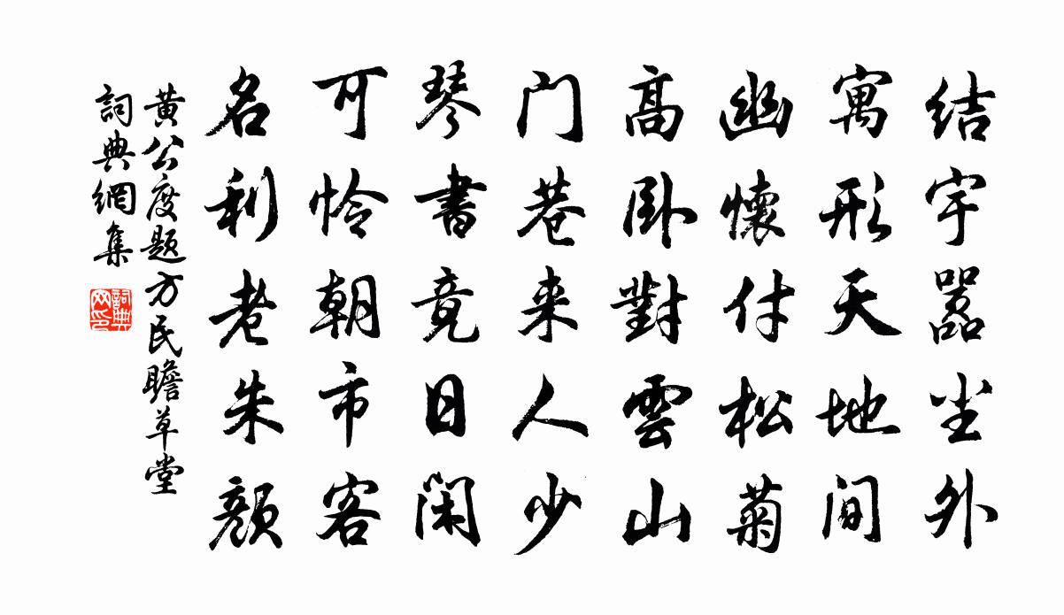 詩詞名句歷史字典書法欣賞書法字典國語詞典說文解字康熙字典古漢語字典標 題 作 者 詩 句 題方民瞻草堂作者:黃公度 朝代:宋代題方民瞻草堂原文結宇囂塵外,寓形天地間。幽懷付松菊,高臥對雲山。門巷來人少,琴書竟日閒。可憐朝市客,名利老朱顏。詩詞問答問:題方民瞻草堂的作者是誰?答:黃公度問:題方民瞻草堂寫於哪個朝代?答:宋代黃公度題方民瞻草堂書法欣賞題方民瞻草堂書法作品詩詞推薦積雨小霽,暮立卷書亭前二首楊萬里〔宋代〕報晴底用暮寒為,薄薄春衫橫見欺。似有如無風細甚,柳絲無賴恰先知。寒食出城馬上偶作王禹偁〔宋代〕欲報君親與願違,今年寒食任芳菲。八音遏密因山後,雙淚滂沱拜墓歸。艷治桃花迎馬笑,輕狂榆莢撲人飛。宦途漁父詞/漁父蒲壽宬〔宋代〕遠入茫茫無盡邊。漁舟來往似行天。敧枕看,不成眠。誰識人間太乙仙。好事近(歸有期作)葛立方〔宋代〕幾騎漢旌回,喜動滿川花木。遙睇清淮古岸,散離愁千斛。煙籠沙嘴定連艘,鵲腳蘸波綠。歸話隔年心事,秉夜闌送曹三同猗游山寺司空曙〔唐代〕山蹋青蕪盡,涼秋古寺深。何時得連策,此夜更聞琴。窮水雲同穴,過僧虎共林。殷勤如念我,遺爾掛冠心。山居二首釋堅璧〔宋代〕瓶孟古澗冷相依,雲淡山寒月色微。眼底賓朋聊自足,屋頭猿鳥恰忘機。山園茶筍疎疎有,世路人情慚漸稀。不記次韻酬喻工部雪中見懷張鎡〔宋代〕坐厭增冰地,遙思勝熱城。忘名全道用,遠俗養詩情。枕病憐幽獨,心交阻合併。晴春開徑在,自斷學淵明。齋中雜題陸游〔宋代〕湖水日益長,柳色日益深。好鳥西山來,飛鳴過前林。年華挽不留,陳跡曠難尋。花開少共賞,酒熟惟孤斟。王謝和子駿約游一二園亭看花遇雨而止司馬光〔宋代〕行樂及佳時,官閒無所羈。只知花正發,不共雨為期。淺草碧無際,濃雲冷四垂。陪遊興未盡,安得不相思。湖州歌九十八首汪元量〔宋代〕太肖風起浪頭高,錦柁搖搖坐不牢。靠著篷窗垂兩目,船頭船尾爛弓刀。重送杜牧〔唐代〕手撚金僕姑,腰懸玉轆轤。爬頭峰北正好去,系取可汗鉗作奴。六宮雖念相如賦,其那防邊重武夫。紫微方翥〔宋代〕學得天文夜睡遲,雲籠月照恨星稀。而今病眼都無力,猶向檐邊認紫微。和樂天為張建封侍兒盼盼作仍繼五篇·其五姜特立〔宋代〕黃金不惜買蛾眉,揀得如花四五枝。撒手行時無畦礙,更無一物可相隨。滬帥曹太博生日四首魏了翁〔宋代〕天馬無蹤運四時,試將六十四年推。後天八八方來數,加倍無窮自此基。示舵師武衍〔宋代〕不拘早晚過長橋,要泊橋邊踏巨鰲。無月色時方得睡,有梅花處必停篙。不逢水活魚休買,才見溪清米便淘。到得發邛州寄友人唐求〔唐代〕茫茫驅一馬,自嘆又何之。出郭見山處,待船逢雨時。曉雞鳴野店,寒葉墮秋枝。寂寞前程去,閒吟欲共誰。詠梅張九成〔宋代〕已知節物向在榮,籬下溪邊照眼明。夜雪壓枝生冷艷,曉寒入骨耿飛英。長條直上姿尤媚,斜朵橫來思更清。疑是鷓鴣天佚名〔宋代〕羅襪凌波洛浦仙。謫來潭府話夤綠。應嫌曲水香塵涴,誕降蘭亭禊事前。歌窈窕,舞嬋娟。芝蘭滿室慶團圓。殷勤答揚州劉原甫王安石〔宋代〕少食苦不足,一官聊自謀。為生晚更拙,懷祿尚遲留。黽勉詎有補,強顏包眾羞。謂我古人風,知君以相優。君實後園老格為園丁斧而薪之有所存者直乾危梢耳戴栩〔宋代〕爾梅生不辰,失身蔬茹圃。雖沾灌溉力,卻受穢濁侮。未能同臭味,只得共甘苦。青隨菜甲肥,翠引蒿芽吐。與時名句推薦一雙舞燕,萬點飛花,滿地斜陽。陳子龍《訴衷情·春遊》 意輕千金贈,顧向平原笑。李白《古風·齊有倜儻生》 時光只解催人老,不信多情,長恨離亭,淚滴春衫酒易醒。晏殊《採桑子·時光只解催人老》 雪霜凌厲而見殺,來歲不改其性也黃庭堅《書幽芳亭記》 撩亂舞晴空,發人無限思。劉禹錫《柳花詞三首》 故視強,則目不明;聽甚,則耳不聰;思慮過度,則智識亂。韓非及後人《韓非子·解老》 強自取柱,柔自取束。荀子《荀子·勸學》 一叫一迴腸一斷,三春三月憶三巴。李白《宣城見杜鵑花 / 子規》 行吟坐嘯獨悲秋,海霧江雲引暮愁。陳子龍《秋日雜感(十首選一)》 不惜千金買寶刀,貂裘換酒也堪豪。秋瑾《對酒·不惜千金買寶刀》