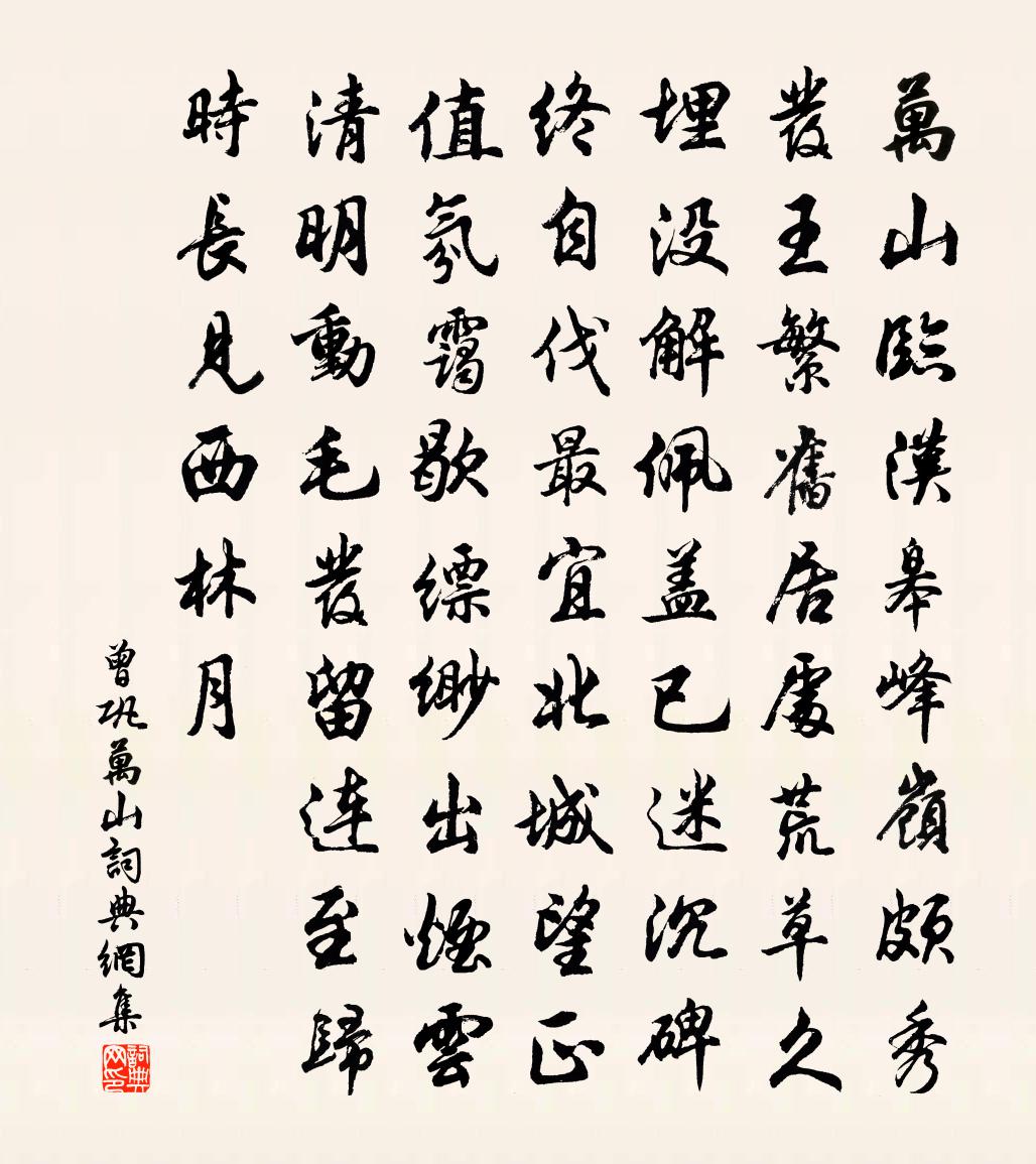 詩詞名句歷史字典書法欣賞書法字典國語詞典說文解字康熙字典古漢語字典標 題 作 者 詩 句 萬山作者:曾鞏 朝代:宋代萬山原文萬山臨漢皋,峰嶺頗秀髮。王繁舊居處,荒草久埋沒。解佩蓋已迷,沉碑終自伐。最宜北城望,正值氛靄歇。縹緲出煙雲,清明動毛髮。留連至歸時,長見西林月。詩詞問答問:萬山的作者是誰?答:曾鞏問:萬山寫於哪個朝代?答:宋代曾鞏萬山書法欣賞萬山書法作品詩詞推薦江上別友人薛師傳〔宋代〕秋江涓涓帆亂飛,秋山皎皎含斜暉。君趁江流去已遠,立對青山不認歸。知君不惜南來信,只恐衡陽雁足稀。江州蔡肇〔宋代〕潯陽江上陶彭澤,五株楊柳青山宅。元和之中白司馬,送客江頭明月下。當時盡作廬山客,林下題詩石上眠。半山亭陳肅〔宋代〕躡屐上高山,亭在半山側。猿鳥戲層台,煙霞含秀色。復知名利心,到此堪俱息。春日即事四絕王炎〔宋代〕小園桃李怯風雨,春事一年渾得晴。燕子欲相牽率去,踏青吾不敢徒行。題覺公新蘭若李端〔唐代〕頭白禪師何處還,獨開蘭若樹林間。鬼因巫祝傳移社,神見天人請施山。猛虎聽經金磬動,獼猴獻蜜雪窗閒。新齋應天長(花港觀魚)張矩〔宋代〕岸容浣錦,波影墮紅,纖鱗巧避鳧唼。禹浪未成頭角,吞舟膽猶怯。湖山外,江海匝。怕自有、暗泉流接。楚天遠榴花竹石鶴釋善珍〔宋代〕剪翮花前老可哀,寄聲鷹隼莫相猜。舊遊赤壁君如不,曾伴坡仙作賦來。水調歌頭甄良友〔宋代〕直節傲山雪,偃蓋詠松風。天香真色來報,春信月明中。六七日分景緯,五百年間英氣,相值產維崧。君子中庸也泊鴨步楊萬里〔宋代〕江流自在水風輕,雲去天來半欲晴。雨岸東西三十里,李花獨樹隔江明。吊齊齋先生尚書文節倪公程公許〔宋代〕仕道昔有訓,退處非為名。齊竽醉聒耳,虞弦自希聲。清波貫霅苕,空翠浮弁衡。圖史足怡悅,風月無將迎。生世禪人並化主寫真求贊釋正覺〔宋代〕山向岳奔,川趨海吞。船浮水柔有力,雁沒煙冷無痕。二三四七,傳持之句。百千萬億,變化之門。招手授手,知寄秋山和尚黃庚〔宋代〕幾夜孤吟憶貫休,疏鐘敲月動詩愁。何人來入匡廬社,分我山中一半秋。凱歌十首呈賈樞使劉克莊〔宋代〕自古勛名勒鼎彝,老於文學即今誰。腐儒尚可軍馬司,試作平淮第二碑。看雪楊萬里〔宋代〕揉雲剪水作風毯,夜落連明肯便休。舊說六花元未試,偶看一片上駝裘。興州新開古東池蘇轍〔宋代〕山繞興州萬疊青,池開近郭百泉並。昔年種柳人安在,累歲開花藕自生。波暖跳魚聞樂喜,人來野鴨望船鳴。西還余以雪牡丹歌呈誠齋回柬雲只得籍沒是兵家不張鎡〔宋代〕春風欲去難留住,措置無如信野人。但解有詩隨手和,自然日日是青春。仲明留少城未還予將歸矣留詩別之李流謙〔宋代〕判袂四十日,望君君不來。過門先問訊,立馬屢徘徊。正坐牽歸夢,無緣把別杯。鶴山果西去,會面更悠哉。演雅方岳〔宋代〕蒼鷹守株待兔,白鷺臨淵羨魚。鳲鳩婦嘆於室,蝸牛亦愛吾廬。宴德初書樓林景熙〔宋代〕樓高不二尋,已作百尺想。中有湖海豪,開襟納萬象。頗延素心人,談笑落清響。鄰花吹午香,檐竹薦秋爽。於中次韻溫其元日詩劉子翬〔宋代〕曉來飛雨挾風顛,洗出韶容換故年。花動一紅明屋角,山寒亂碧到樽前。病如夜鶴孤還警,老似春蠶飽即眠。賴有名句推薦滄江好煙月,門系釣魚船。杜牧《旅宿》 日日深杯酒滿,朝朝小圃花開。朱敦儒《西江月·日日深杯酒滿》 驚回千里夢,已三更。起來獨自繞階行。岳飛《小重山·昨夜寒蛩不住鳴》 思則有備,有備無患左丘明《左傳·襄公·襄公十一年》 日往菲薇,月來扶疏。左思《三都賦》 黃鳥翩翩楊柳垂,春風送客使人悲。高適《東平別前衛縣李寀少府 / 送前衛縣李宷少府》 淒淒歲暮風,翳翳經日雪。陶淵明《癸卯歲十二月中作與從弟敬遠》 居移氣,養移體。孟子《孟子·盡心章句上·第三十六節》 事業文章隨身銷毀,而精神萬古如新洪應明《菜根譚·概論》 終古閒情歸落照,一春幽夢逐遊絲。納蘭性德《浣溪沙·楊柳千條送馬蹄》