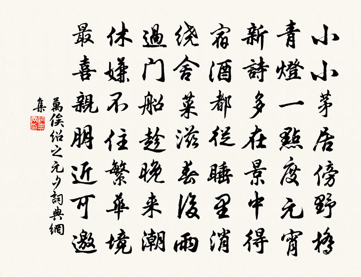 詩詞名句歷史字典書法欣賞書法字典國語詞典說文解字康熙字典古漢語字典標 題 作 者 詩 句 元夕作者:万俟紹之 朝代:宋代元夕原文小小茅居傍野橋,青燈一點度元宵。新詩多在景中得,宿酒都從睡里消。繞舍菜滋春後雨,過門船趁晚來潮。休嫌不住繁華境,最喜親朋近可邀。詩詞問答問:元夕的作者是誰?答:万俟紹之問:元夕寫於哪個朝代?答:宋代万俟紹之元夕書法欣賞元夕書法作品詩詞推薦湘弦怨孟郊〔唐代〕昧者理芳草,蒿蘭同一鋤。狂飆怒秋林,曲直同一枯。嘉木忌深蠹,哲人悲巧誣。靈均入回流,靳尚為良謨。我願導引佚名〔宋代〕長樂晚彩戲萊衣。奄忽夢報仙期。帝鄉渺渺乘鸞去,啼紅嬪御不勝悲。蒼梧煙水杳難追。腸斷處、過江時。銀濤千太倉隆福寺創觀音院以詩百韻寄妙觀大師且呈郟亶〔宋代〕珍重妙觀師,書來再三讀。不蒙促歸計,乃憂曠箋牘。疑師未相知,待我尚塵俗。竊聞構新殿,東畔建廊屋。聖像寄題張秀才此君亭金君卿〔宋代〕群山四向盤青雲,山足一徑縈雲根。拂雲截徑敞軒檻,檻外百卉鋪重茵。矜春哆哆弄顏色,散漫紅紫何紛紛。主人用明師叔韻贈畫工張子英陳淳〔宋代〕雖憑縑素狀儀容,的自毫心蘊妙鋒。個個本來天所賦,隨人變化有奇工。玲瓏四犯姜夔〔宋代〕壘鼓夜寒,垂燈春淺,匆匆時事如許!倦遊歡意少,俯仰悲今古。江淹又吟恨賦,記當時、送君南浦。萬里乾坤,酬皇甫賓客白居易〔唐代〕閒官兼慢使,著處易停輪。況欲逢新歲,仍初見故人。冒寒尋到洛,待暖始歸秦。亦擬同攜手,城東略看春。送柳震歸蜀司空曙〔唐代〕白日雙流靜,西看蜀國春。桐花能乳鳥,竹節競祠神。蹇步徒相望,先鞭不可親。知從江僕射,登榻更何人。點絳唇 追和趙文敏公舊作十首客有持文敏公邵亨貞〔元代〕作長短句題於後。公以承平王孫而嬰世變,離黍之悲,有不能忘情者,故深得騷人意度。予生十有四年而公斃,每江城子 嵩山中作元好問〔金代〕眾人皆醉屈原醒。笑劉伶。酒為名。不道劉伶,久矣笑螟蛉。死葬糟丘珠不惡,緣底事,赴清冷。醉鄉千古一昇平梨花晁說之〔宋代〕春到梨花意更長,好將素質殿紅芳。若為寄與江南客,枉是楊梅憶庚郎。吳給事輓詞項安世〔宋代〕我來鏡水問遺民,想見堂堂報國身。五月陂塘三百里,千年廟學一番新。世傳風烈今無數,自許經行得最親。一讀題魏萬成江亭劉長卿〔唐代〕蕭條方歲晏,牢落對空洲。才出時人右,家貧湘水頭。蒼山隱暮雪,白鳥沒寒流。不是蓮花府,冥冥不可求。回陳兄惠瓜劉宰〔宋代〕碧圓到眼舌生津,三載深慚拜賜頻。莫怪尊前最知味,東陵自是種瓜人。已亥雜詩 192龔自珍〔清代〕花神祠與水仙祠,欲訂源流愧未知。但向西泠添石刻,駢文撰出女郎碑。送來巡檢方回〔宋代〕鐵甲金戈百戰攻,將軍未老紫髯濃。早依討粵□□□,□受從驃合騎封。驚邏三年微竊鼠,飛騰一日定采□,□□首尾吟邵雍〔宋代〕堯夫非是愛吟詩,詩是堯夫登閣時。往事千年徒渺漭,斜陽一片漫光輝。伊川洛川水似線,太室少室峰如錐。爭者五月間與正仲立耕養堂前見石榴一花吐初因以舒岳祥〔宋代〕石屏溪上晚風柔,深念沉思註易樓。好酒自能和性氣,閒愁何必上眉頭。十風五雨天常順,萬綠一紅春更留。灶婢觀物吟邵雍〔宋代〕利輕則義重,利重則義輕。利不能勝義,自然多至誠。義不能勝利,自然多{上分下心}爭。漁家傲葛勝仲〔宋代〕疊疊雲山供四顧。簿書忙裡偷閒去。心遠地偏陶令趣。登覽處。清幽疑是斜川路。野蔌溪毛供飲具。此身甘被煙霞名句推薦背燈和月就花陰,已是十年蹤跡十年心。納蘭性德《虞美人·銀床淅瀝青梧老》 林暗草驚風,將軍夜引弓。盧綸《和張僕射塞下曲·其二》 稻花香里說豐年。聽取蛙聲一片。辛棄疾《西江月·夜行黃沙道中》 捲地風來忽吹散,望湖樓下水如天。蘇軾《六月二十七日望湖樓醉書》 當時相候赤欄橋,今日獨尋黃葉路。周邦彥《玉樓春·桃溪不作從容住》 千金之裘,非一狐之腋也;台榭之榱,非一木之枝也;三代之際,非一士之智也司馬遷《史記·劉敬叔孫通列傳》 筆落驚風雨,書成泣鬼神。馮夢龍《醒世恆言·卷二十一》 黃鶯也愛新涼好,飛過青山影里啼。徐璣《新涼》 竹籬茅舍,淡煙衰草孤村。白樸《天淨沙·冬》 漠漠水田飛白鷺,陰陰夏木囀黃鸝。王維《積雨輞川莊作 / 秋歸輞川莊作》