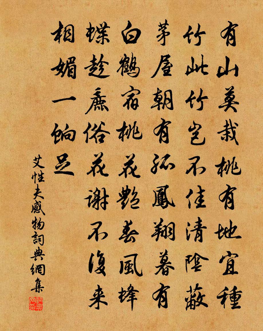 詩詞名句歷史字典書法欣賞書法字典國語詞典說文解字康熙字典古漢語字典標 題 作 者 詩 句 感物作者:艾性夫 朝代:宋代感物原文有山莫栽桃,有地宜種竹。此竹豈不佳,清陰蔽茅屋。朝有孤鳳翔,暮有白鶴宿。桃花艷春風,蜂蝶趁麄俗。花謝不復來,相媚一餉足。詩詞問答問:感物的作者是誰?答:艾性夫問:感物寫於哪個朝代?答:宋代問:感物是什麼體裁?答:五古艾性夫感物書法欣賞感物書法作品詩詞推薦北湖陶弼〔宋代〕寧越佳山水,城樓枕北湖。丘陵助形勢,溝洫借膏腴。晚景群峰會,春流眾壑趨。自知千載後,歌調有農天。滿庭芳 藏頭 拆起力字王哲〔元代〕莫驅馳,公全道,來真性明光。誰知得,便是水中霜。應相從相見,人悟,物物俱忘。中有,華耀處,怎奈被雲藏十六觀經頌中品中生釋遵式〔宋代〕若人至心一日夜,持戒持齋無破缺。以此功德回願生,七日華敷成記莂。江上晚行寇準〔宋代〕秦川不得卻歸耕,奉詔年來在楚城。孤寺殘鍾催夕照,汀洲疏葦送秋聲。西風獨起湖山思,久客應知寂寞情。野鶴題山水圖釋行海〔宋代〕暮色溪山遠,煙林一兩家。孤舟何不在,雁欲下平沙。宴清郎盧祖皋〔宋代〕春訊管飛瓊管,風管日薄,度管牆啼鳥聲管亂。江城次第,笙歌翠合,綺羅香暖。溶溶澗淥冰泮,醉夢裡,年華暗蝶戀花(道中有簪二色菊花)趙師俠〔宋代〕百疊霜羅香蕊細。裊裊垂鈴,綴簇黃金碎。獨占九秋風露里。芳心不與群英比。采采東籬今古意。秀色堪餐,更惹上乘展墓示子侄陳著〔宋代〕吾行荷謝老天公,不放南來送雨風。筇杖步前皆雅興,梅花香底欠詩工。塵埃辟易青山外,邱壟淒涼落照中。一片盤墅睦鄰黃由〔宋代〕才到松陵即是家,民間何處不桑麻。欣欣老稚迎門笑,斗酒相歡亦孔嘉。登石室飯僧詩謝靈運〔南北朝〕迎旭凌絕嶝。映泫歸漵浦。鑽燧斷山木。掩岸墐石戶。結架非丹甍。藉田資宿莽。同游息心客。曖然若可睹。清霄清平樂辛棄疾〔宋代〕柳邊飛鞚。露濕征衣重。宿鷺驚窺沙影動。應有魚蝦入夢。一川淡月疏星。浣沙人影娉婷。笑背行人歸去,門前稚北窗三友白居易〔唐代〕今日北窗下,自問何所為。欣然得三友,三友者為誰?琴罷輒舉酒,酒罷輒吟詩。三友遞相引,循環無已時。一彈題江郎廟六絕陳淳〔宋代〕禮學無人發世蒙,正神流弊與妖同。既非氣類相求者,豈解精誠妙感通。用元韻答蔣簿王炎〔宋代〕北去方休駕,西行又出車。身勞雖僕僕,心靜自如如。儻得重揮麈,全勝數寄書。詩來驚老眼,筆力掣鯨魚。生年釋文珦〔宋代〕生年已六十,所歷更萬端。富貴等浮雲,變滅不足觀。身如冬嶺松,獨立守歲寒。心如古井水,到底無波瀾。吾道沈約姜特立〔宋代〕懷情既不盡,謚隱亦何疑。截舌帝其怒,在天靈可欺。送季明府赴太平粹戴復古〔宋代〕人說陳胡蔡,合君為四賢。一廉官似水,三載吏無權。政自詩書出,民從教化遷。神明判事筆,一出萬人傳。宮詞宋白〔宋代〕後苑秋晴校獵歸,淡妝宮女盡戎衣。數中供奉誰精熟,斜勒驕聰掠草飛。贈吳處士棋潘閬〔宋代〕昔日長饒國手先,如今多病臥林泉。有時閒倚青松笑,猶憶曾輸一著玄。四絕贈馬浩然法師李筌吳真君葛立方〔宋代〕舊得陰符虎口岩,素書漆軸玉函緘。君方濡筆書靈篆,已有飛來青鳥銜。名句推薦便縱有千種風情,更與何人說?柳永《雨霖鈴·寒蟬淒切》 仁人之於弟也,不藏怒焉,不宿怨焉,親愛之而已矣。孟子《孟子·萬章章句上·第三節》 親賢臣,遠小人。諸葛亮《出師表/前出師表》 巫峽啼猿數行淚,衡陽歸雁幾封書。高適《送李少府貶峽中王少府貶長沙》 寒笛對京口,故人在襄陽。劉昚虛《暮秋揚子江寄孟浩然》 被冷香消新夢覺,不許愁人不起李清照《念奴嬌·春情》 溫故,而知新,敦厚以崇禮。子思《中庸·第二十七章》 仁者見之謂之仁,知者見之謂之知佚名《易傳·繫辭傳上·第五章》 橋北橋南千百樹,綠煙金穗映清流。朱栴《官橋柳色》 歸去來兮,吾歸何處?蘇軾《滿庭芳·歸去來兮》