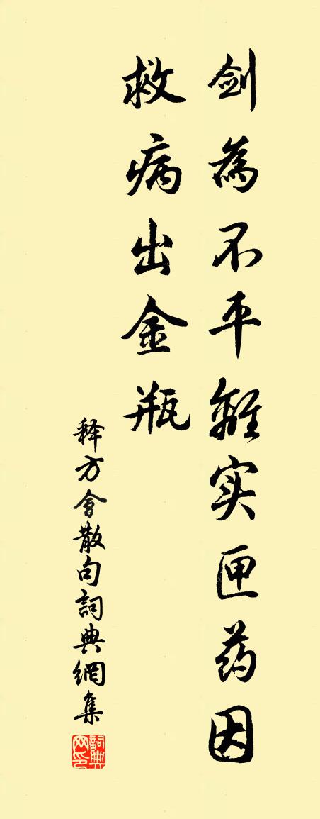 詩詞名句歷史字典書法欣賞書法字典國語詞典說文解字康熙字典古漢語字典標 題 作 者 詩 句 句作者:釋方會 朝代:宋代句原文劍為不平離實匣,藥因救病出金瓶。詩詞問答問:句的作者是誰?答:釋方會問:句寫於哪個朝代?答:宋代釋方會句書法欣賞句書法作品詩詞推薦和權載之離合詩(時為國子司業)武少儀〔唐代〕少年慕時彥,小悟文多變。木鐸比群英,八方流德聲。雷陳美交契,雨雪音塵繼。恩顧各飛翔,因詩睹瑰麗。傅野寄江都路員外徐鉉〔唐代〕吾兄失意在東都,聞說襟懷任所如。已縱乖慵為傲吏,有何關鍵制豪胥。縣齋曉閉多移病,南畝秋荒憶遂初。知道休浣日西掖謁所知溫庭筠〔唐代〕赤墀高閣自從容,玉女窗扉報曙鍾。日麗九門青鎖闥,雨晴雙闕翠微峰。毫端蕙露滋仙草,琴上薰風入禁松。荀令送趙仲寶永興乾耀提舉捉賊梅堯臣〔宋代〕知君少以勇,曾向蕭關戰。橫刀突虜圍,奪馬傷胡箭。當時獨免歸,猛毅邊人羨。今來提漢卒,寇盜清秦縣。未足癸丑元日文定時留豐城青湘唁家胡寅〔宋代〕去年已向爆聲殘,曉氣絪緼雨不寒。玉佩想聞趨桂殿,彩衣遙祝獻椒盤。千齡這運方更始,一統王春正履端。不與皇太后合春帖子六首蘇頌〔宋代〕東郊青幘拜春回,迎得陽和次第來。風向烏竿千里應,氣隨魚鑰九重開。遣興次韻和晁應之四首張耒〔宋代〕露下風悲螢火流,周南羈客意悠悠。山川老去三年淚,關塞秋來萬里愁。慣逐禽魚諳異俗,每因霜月夢滄洲。一拋水龍吟莫崙〔宋代〕鏡寒香歇江城路,今度見春全懶。斷雲過雨,花前歌扇,梅邊酒盞。離思相欺,萬絲縈繞,一襟銷黯。但年光暗換奇仲和致中棋詩有玄中一著是吾宗之句劉子翬〔宋代〕局上深機未足窮,玄中一著若為通。五宗惟明不是物,三語孰解將無同。常恨老懷多憒憒,每逢益友太匆匆。金篦挽蜀帥趙侍郎二首李曾伯〔宋代〕蜀賴宗臣力,劍光星斗高。位才登豹尾,身幾付鴻毛。節概公何慊,時艱運適遭。岷山如不壞,難泯此忠勞。哭柏岩和尚賈島〔唐代〕苔覆石床新,師曾占幾春。寫留行道影,焚卻坐禪身。塔院關松雪,經房鎖隙塵。自嫌雙淚下,不是解空人。題惟晤師斑竹杖強至〔宋代〕蜀江濯錦含文漪,竹生江岸初綠滋。錦波一浸入竹肌,萬洗不落斑在皮。又聞淚點灑舜妃,遺蹟漸染傳今時。搯不紹興祀岳鎮海瀆四十三首佚名〔宋代〕青陽筆開,祀事也飭。在人贊溉,其聲苾苾。敬爾威備,亦孔之則。神之格思,無我有斁。贈李道士謁仙行白玉蟾〔宋代〕蓬萊空夜月,琪樹不秋風。霜畦老芝(左瓜右瓜),煙闕多麟龍。靈龜不知歲,孤雲杳無蹤。白鶴忽歸來,紫鸞鳴春帖子詞皇帝閣十二首宋祁〔宋代〕天矯蒼龍引翠旌,君王暫報出郊迎。勾芒一夜催春到,萬戶千門歌吹聲。以烏紗巾餉客吳儆〔宋代〕落托烏紗墊角巾,已將清泚絛京塵。請君便漉淵明酒,醉後從他雪滿簪。送大兄兼寄趙團練陳師道〔宋代〕貧有分離苦,官無早晚宜。又為千里別,未覺十年遲。日與江山遠,風連草木悲。平生劉子政,見可只論詩。丁未正月春色已粲然露坐高風堂北觀種花陸游〔宋代〕苦寒不解歲崢嶸,病守兀坐憂疲氓。天風誰遣撼斗柄,便覺春色來江城。北山賽廟見殘雪,東津送客聞新鶯。衣裘又答陳公美三首蘇洵〔宋代〕仲尼魯司寇,官職亦憶優。從祭肉不及,戴冕奔諸侯。當時不之知,為肉誠可羞。君子意有在,眾人但愆尤。置之宋江三十六贊龔開〔宋代〕不疾而速,故神無方。汝行何之,敢離大行。名句推薦多少新亭揮淚客,誰夢中原塊土。劉克莊《賀新郎·送陳真州子華》 以不忍人之心,行不忍人之政,治天下可運之掌上。孟子《孟子·公孫丑章句上·第六節》 誠既勇兮又以武,終剛強兮不可凌。屈原《國殤》 問別來、解相思否。吳文英《惜秋華·七夕前一日送人歸鹽官》 長記曾攜手處,千樹壓、西湖寒碧。姜夔《暗香·舊時月色》 城上高樓接大荒,海天愁思正茫茫。柳宗元《登柳州城樓寄漳汀封連四州》 劇辛樂毅感恩分,輸肝剖膽效英才。李白《行路難三首》 酒闌更喜團茶苦,夢斷偏宜瑞腦香。李清照《鷓鴣天·寒日蕭蕭上瑣窗》 公子南橋應盡興,將軍西第幾留賓。杜審言《春日京中有懷》 蓼岸荻花中,隱映竹籬茅舍。張昪《離亭燕·一帶江山如畫》