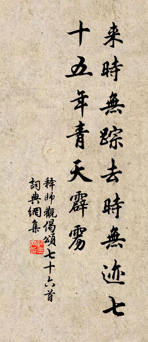 詩詞名句歷史字典書法欣賞書法字典國語詞典說文解字康熙字典古漢語字典標 題 作 者 詩 句 偈頌七十六首作者:釋師觀 朝代:宋代偈頌七十六首原文來時無蹤,去時無跡。七十五年,青天霹靂。詩詞問答問:偈頌七十六首的作者是誰?答:釋師觀問:偈頌七十六首寫於哪個朝代?答:宋代釋師觀偈頌七十六首書法欣賞偈頌七十六首書法作品詩詞推薦送蔣節推赴岳陽趙師秀〔宋代〕君山那可上,四面是層波。此地風煙古,前人賦詠多。征帆沖雁字,官舍近漁歌。況爾修真者,回仙必見過。縱筆陸游〔宋代〕行省當年駐隴頭,腐儒隨牒亦西遊。千艘沖雪魚關曉,萬灶連雲駱谷秋。天道難知胡更熾,神州未復士堪羞。會須游靈隱寺程公許〔宋代〕賦予花好在岩壑花,強持縛花纓簪。野花當奈何,惝恍如驚麇。京華百萬家,{角戢}{角戢}瓦疊鱗。海氣盪煩崔文學甲攜文見過蕭然有出塵之姿問之則孫介蘇軾〔宋代〕象服盛簪珥,豈是邢夫人。敝衣破冠履,可憐范叔貧。君看崔員外,晚就觀國賓。當年頗赫赫,翁媼爭為姻。(事【雙調】落梅風_秋思懷桃葉張可久〔元代〕秋思懷桃葉,憶柳枝,仲宣樓杜陵詩思。白雲中兩三個新雁兒,寫相思不成愁字。金丹詩四十八首張繼先〔宋代〕氣龍津虎不難分,下手須從神定門。白雪煉多齊日月,黃芽服久出乾坤。四神鼎內堪逃死,五色漿中可返魂。世上摸魚兒佚名〔宋代〕歲華向晚,遙天布同雲,霽雪輕飛。前村昨夜漏春光,楚梅先放南枝。嘆東君運巧思。裁瓊鏤玉妝繁蕊。花中偏異夜行船馬鈺〔元代〕秘奧豈愁天地管。處玄機,故然貧懶。守服環牆,高而不短。馬風性,無寒暖。常*心香慵執卷。師恩報,何時願論語絕句一百首張九成〔宋代〕看來商頌繼關雎,亂訓為終始是初。試把初終篇較取,洋洋風雅豈為虛。順風至岳州危甚項安世〔宋代〕黑雲將雨向巴邱,白浪奔雷送客舟。一路逆風才得順,百年何日是無愁。神林浦外飛沙惡,道士磯頭亂石稠。系纜四曲金雞岩白玉蟾〔宋代〕水滿寒潭潭著月,山藏空谷正吞煙。金雞初報洞中曉,一聲喚起玉淵龍。八月十四夜神泉官滿再別同官吳泳〔宋代〕有客有客白其馬,日倚垂楊問行者。式微式微胡不歸,未歸滿耳聞別詩。斷弦再續情緒惡,別酒重稔味如蠟。袖中西湖念語歐陽修〔宋代〕昔者王子猷之愛竹,造門不問於主人,陶淵明之臥輿,遇酒便留於道士。況西湖之勝概,擅東潁之佳名。雖美景良偈六十三首釋道寧〔宋代〕薄{左卑右刂}明月碎清風,淺種深耕莫大功。破二作三橫豎算,四方八面用無窮。從歐陽全真借觀陳擇之蜀中詩題其後趙蕃〔宋代〕書去方懷蜀道長,寄憶未達忽傳亡。那知今夕辰陽郡,灑淚殘詩十數章。偈頌二百零五首釋正覺〔宋代〕一句超然,良馬影鞭。道出語默,理合方圓。運斤之妙,賓主可憐。斲輪之伎,父子不傳。莫將爻象兮相求龜殼,慈恩寺偶題鄭谷〔唐代〕往事悠悠添浩嘆,勞生擾擾竟何能。故山歲晚不歸去,高塔晴來獨自登。林下聽經秋苑鹿,江邊掃葉夕陽僧。吟余緣識宋太宗〔宋代〕年年柳與韶光契,春風便作開花便。黃鶯到處不絕聲,嫩葉芽新生翡翠。湖州歌九十八首 其九十六汪元量〔宋代〕夜來酒醒四更過,漸覺衾裯冷氣多。踏雪敲門雙敕使,傳言太子送天鵝。御街行晁補之〔宋代〕天街月照珠簾粉。嚲轡曾相近。繁華樂事老來慵,對酒尚憐佳景。王孫年少,風流應更,無奈春愁悶。幽期莫誤香名句推薦保民而王,莫之能御也。孟子《孟子·梁惠王章句上·第七節》 嚴妝欲罷囀黃鸝,飛上萬年枝。和凝《喜遷鶯·曉月墜》 沽酒清陰時系馬,招涼短檻幾留題。許德溥《西橋柳色》 三軍可奪帥也,匹夫不可奪志也。佚名《論語十二章》 種豆南山下,草盛豆苗稀。陶淵明《歸園田居·其三》 今日重來訪,不見知音人。馮夢龍《警世通言·卷一》 不責人小過,不發人陰私,不念人舊惡洪應明《菜根譚·概論》 御柳如絲映九重,鳳凰窗映繡芙蓉。溫庭筠《楊柳枝》 狎興生疏,酒徒蕭索,不似少年時。柳永《少年游·長安古道馬遲遲》 松雪飄寒,嶺雲吹凍,紅破數椒春淺。周密《獻仙音·吊雪香亭梅》