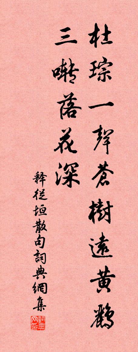 詩詞名句歷史字典書法欣賞書法字典國語詞典說文解字康熙字典古漢語字典標 題 作 者 詩 句 句作者:釋從垣 朝代:宋代句原文杜琮一聲蒼樹遠,黃鸝三囀落花深。詩詞問答問:句的作者是誰?答:釋從垣問:句寫於哪個朝代?答:宋代釋從垣句書法欣賞句書法作品詩詞推薦平居遺興林逋〔宋代〕有甚餘閒得解嘲,高慵時把幾桯敲。卑孜晚鳥沉幽語,歷刺煙篁露病梢。草野交遊披褐見,神仙書史點朱抄。皇朝再別鄭叔友兼寄方次雲黃公度〔宋代〕鞍馬侵三伏,萍蓬寄一身。及秋歸計早,到日附書頻。炎嶺休長客,清漳有故人。過逢如問信,為道各埃塵。曾祖聖師真一還源真人贊白玉蟾〔宋代〕杏林驛,雪之夕。老師張,弟子石。子張子夏廟同鄰幾聖俞過作韓維〔宋代〕峨峨道旁廟,庭戶煥丹黝,恭聞師商賢,下拜奠卮酒。大梁故王都,豪傑所奔走。當時多尊榮,死不道人口。二君袁州慶豐堂十閒詠祖無擇〔宋代〕年長身多病,閒鈔已試方。未甘先犬馬,畢命報恩光。餞楊世章陳深〔宋代〕阿章年少構才酞,柏府當年與贊籌。高臥久無求仕想,閒曹聊作讀書謀。風煙坐度吳江晚,山水重控禹穴幽。正喜次韻周子嘉詠雪王之道〔宋代〕勢凌風力斗清嚴,徹骨尤非老病堪。凍蠡夜回千首北,寒梅朝放一枝南。扁舟底事方行役,販履何人正立談。江上春菜蘇軾〔宋代〕蔓菁宿根已生葉,韭芽戴土拳如蕨。爛烝香薺白魚肥,碎點青蒿涼餅滑。宿酒初消春睡起,細履幽畦掇芳辣。茵陳二偈呈似壽老范成大〔宋代〕法法剎那無住,云何見在去來。若覓三心不見,便從不見打開。孟說所過者化,莊雲相代乎前。何處安身立命?飢答顯忠上人梅堯臣〔宋代〕驅馬傍馳道,歸自許西偏。高車非舊貴,立避槐樹邊。心雖欲往謁,仆餒行不前。是甘處窮巷,晨笑微生煙。儻有已亥季秋至淨居思大智者場院因瞻二士相三日李彌遜〔宋代〕雨華隨步到天關,遠目才分繚繞山。風馬不馳前景斷,更於何地覓無遠。答秦嘉詩徐淑〔兩漢〕妾身兮不令,嬰疾兮來歸。沉滯兮家門,歷時兮不差。曠廢兮侍覲,情敬兮有違。君今兮奉命,遠適兮京師。悠悠送趙郎二首張嵲〔宋代〕亂離何處托浮生,羨子今為劍外行。異縣頻年多送遠,中原何日見承平。雲開壠首河山迥,月出巴江閣道橫。此別次韻子瞻與安節夜坐三首蘇轍〔宋代〕前山積雪暮崢嶸,燕坐微聞落瓦聲。共對一尊通夜語,相看萬里故鄉情。信歸嶺上寒梅遠,恨極江南春草生。明目壽傅守釋若芬〔宋代〕秋入東籬破曉霜,黃花不肯媚重陽。花神愛惜緣何事,要向今朝薦壽觴。招朱法曹趙宰趙予野飲陳造〔宋代〕秦郵望儀真,相與不三驛。仕學四十年,此地幾旅食。寓公芹泮士,十九盡親識。茲游最奇傳,詩壇許投跡。每當蝶戀花陳允平〔宋代〕謝了梨花寒食後。翦翦輕寒,曉色侵書牖。寂寞幽齊惟酌酒。柔條恨結東風手。淺黛嬌黃春色透。薄霧輕煙,遠映夏日聯句李昂〔唐代〕人皆苦炎熱,我愛夏日長。——李昂薰風自南來,殿閣生微涼。——柳公權湖山園周端臣〔宋代〕丹樓碧閣面山開,綠樹紅芳繞水栽。多少好春閒過卻,主人無暇不曾來。老人付宋汝為〔宋代〕憔悴應憐范叔寒,南北東西萬里謫。朱顏荏苒變黎黑,走遍天涯常是客。名句推薦照野旌旗,朝天車馬,平沙萬里天低。周密《高陽台·送陳君衡被召》 用舍由時,行藏在我,袖手何妨閒處看。蘇軾《沁園春·孤館燈青》 關山多雨雪,風水損毛衣。李遠《詠雁》 佯愛人,不得復憎也;佯憎人,不得復愛也。韓非及後人《韓非子·外儲說右下》 山從人面起,雲傍馬頭生。李白《送友人入蜀》 君人者,愛民而安,好士而榮,兩者無一焉而亡。荀子《荀子·君道》 昨日鄰家乞新火,曉窗分與讀書燈。王禹偁《清明》 瘦葉幾經雪,淡花應少春。於武陵《贈賣松人》 一手獨拍,雖疾無聲。韓非及後人《韓非子·功名》 千古風流八詠樓,江山留與後人愁。李清照《題八詠樓》