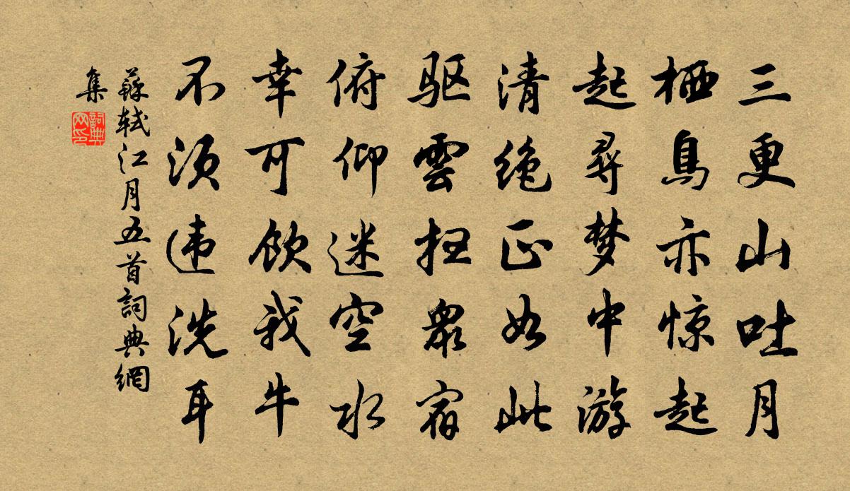 詩詞名句歷史字典書法欣賞書法字典國語詞典說文解字康熙字典古漢語字典標 題 作 者 詩 句 江月五首作者:蘇軾 朝代:宋代江月五首原文三更山吐月,棲鳥亦驚起。起尋夢中游,清絕正如此。驅雲掃眾宿,俯仰迷空水。幸可飲我牛,不須違洗耳。詩詞問答問:江月五首的作者是誰?答:蘇軾問:江月五首寫於哪個朝代?答:宋代問:蘇軾的名句有哪些?答:蘇軾名句大全蘇軾江月五首書法欣賞江月五首書法作品詩詞推薦句高似孫〔宋代〕夢無全覺久,詩只半聊奇。失調名佚名〔宋代〕待醉里小王,書寫副、神荼鬱壘。南樓令 塞外重九納蘭性德〔清代〕古木向人秋,驚蓬掠鬢稠。是重陽、何處堪愁。記得當年惆悵事,正風雨,下南樓。斷夢幾能留,香魂一哭休。怪奉和白敏中聖道和平致茲休運歲終功就合詠盛明呈上馬植〔唐代〕舜德堯仁化犬戎,許提河隴款皇風。指揮貙武皆神算,恢拓乾坤是聖功。四帥有徵無汗馬,七關雖戍已弢弓。天留望金華山絕句四首趙蕃〔宋代〕雲蔽雲開山只然,畫無能事著詩傳。扁舟盡日無多厭,信手拈來亦漫編。漣漪亭賞梅陸游〔宋代〕判為梅花倒玉卮,故人幽夢憶疏籬。寫真妙絕橫窗影,徹骨清寒蘸水枝。苦節雪中逢漢使,高標澤畔見湘纍。詩成送侍御帥夔府喻良能〔宋代〕諸葛仍祠廟,公孫只故基。棟樑酣夕照,雉堞蔓秋葵。耿耿登臨意,悠悠今古思。烹鮮不勞力,餘事杜陵詩。陌上二女梅堯臣〔宋代〕素手搴冪{上四下離},柔纖明春荑。轉眄動桂葉,陽語啟瓠犀。阿姊金盛珠,阿妹繅籍圭。吹香襲行路,豈獨下點絳唇向子諲〔宋代〕今日重陽,強挼青蕊聊開宴。我家幾甸。試上連輝觀。憶著酺池,古塔煙霄半。愁心遠。情隨雲亂。腸斷江城雁。春羈詩鮑照〔南北朝〕征人嘆道遐。去鄉愒路邇。佳期每無從。淮陽非尺咫。春日都游心。勞情出徙倚。岫遠雲煙綿。谷屈泉靡迤。風起秋蕊香仇遠〔宋代〕三徑歸來秋早。門外金鋪誰掃。東籬不種閒花草。惱亂西風未了。霜華侵鬢淵明老。南山曉。啼紅怨綠駸駸少。自南屏謙師妙於茶事自雲得之於心應之於手非可蘇軾〔宋代〕道人曉出南屏山,來試點茶三昧手。忽驚午盞兔毫斑,打作春瓮鵝兒酒。天台乳花世不見,玉川風腋今安有。東坡次韻月窗兄惜別四首陳著〔宋代〕分付浮生一字休,欲休不得是離愁。如今只怕歸無準,心在丹山最上頭。長歌行沈約〔南北朝〕春隰荑綠柳。寒墀積皓雪。依依往紀盈。霏霏來思結。思結纏歲晏。曾是掩初節。初節曾不掩。浮榮逐弦缺。弦缺故宮怨方鳳〔宋代〕白日欲落何王宮,腥雲頹樹生烈風。獼猱幾年爭聚族,飢蟒獰猙攫人肉。熊豨肆毒夜橫行,刺蛆刲血多飛鼪。螢尻宮詞王仲修〔宋代〕太平無事似熙豐,天樂聲和下帝宮。禽鳥也能知樂事,宮鶯嬌醉弄春風。送黃元董赴廷試李呂〔宋代〕江夏無雙最擅名,君家群從總能文。丹枝只為一門種,黃卷仍收再世勛。天上鴛鴻方接武,眼前駑蹇漫成群。蜀軍送裴侍御赴歲入京(得陽字)岑參〔唐代〕羨他驄馬郎,元日謁明光。立處聞天語,朝回惹御香。台寒柏樹綠,江暖柳條黃。惜別津亭暮,揮戈憶魯陽。酬李公寅留別李復〔宋代〕歸風何急動徵車,幾夕相逢意有餘。綠暗河橋冰泮後,雲藏山徑雪晴初。登門曾上千重峻,遊刃將驚萬窾虛。他日句晏殊〔宋代〕山留盤瓠跡,洞有秦人書。名句推薦兒女此情同。往事朦朧。湘娥竹上淚痕濃。辛棄疾《浪淘沙·賦虞美人草》 又是春將暮,無語對斜陽。葛長庚《水調歌頭·江上春山遠》 安上治民,莫善於禮。孔子及其弟子《孝經·廣要道》 日暮詩成天又雪,與梅並作十分春。盧梅坡《雪梅·其二》 黃葉仍風雨,青樓自管弦。李商隱《風雨》 亂山殘雪夜,孤燭異鄉人。崔塗《除夜 / 巴山道中除夜書懷 / 除夜有懷》 形相雖惡而心術善,無害為君子也。荀子《荀子·非相》 垂下簾櫳。雙燕歸來細雨中。歐陽修《採桑子·群芳過後西湖好》 漸秋闌、雪清玉瘦,向人無限依依。李清照《多麗·詠白菊》 佇聽寒聲,雲深無雁影。周邦彥《關河令·秋陰時晴漸向暝》