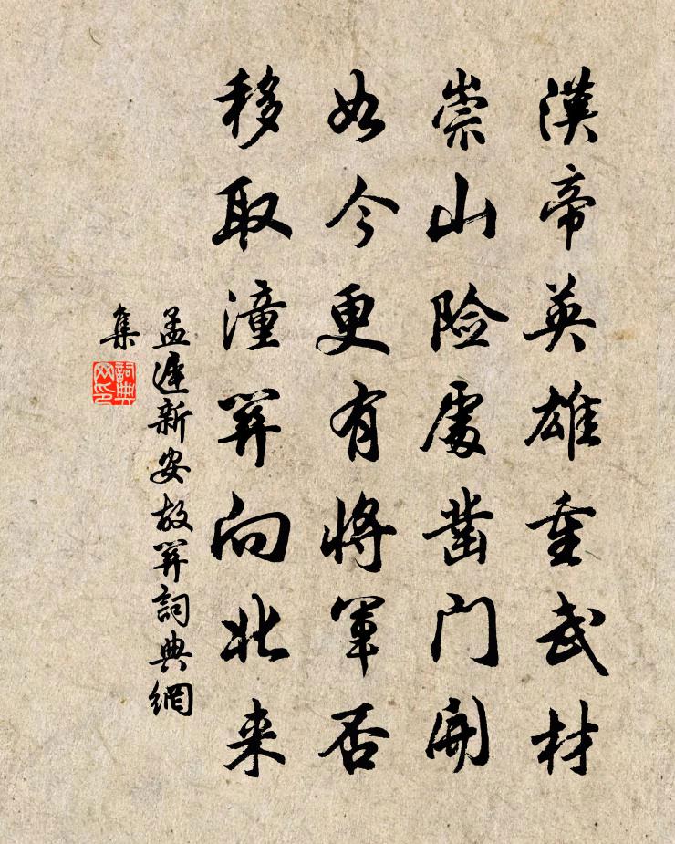 詩詞名句歷史字典書法欣賞書法字典國語詞典說文解字康熙字典古漢語字典標 題 作 者 詩 句 新安故關作者:孟遲 朝代:唐代新安故關原文漢帝英雄重武材,崇山險處鑿門開。如今更有將軍否,移取潼關向北來。詩詞問答問:新安故關的作者是誰?答:孟遲問:新安故關寫於哪個朝代?答:唐代問:新安故關是什麼體裁?答:七絕孟遲新安故關書法欣賞新安故關書法作品注釋全唐詩:卷557-13詩詞推薦謝陸梅磵曹靖庵見和拙稿顧逢〔宋代〕梅磵先賡三體句,靖庵又和五言詩。不知二稿流傳後,能續君詩更有誰。浪淘沙蔣捷〔宋代〕人愛曉妝鮮。我愛妝殘。翠釵扶住欲敧鬟。印了夜香無事也,月上涼天。新譜學箏難。愁涌蛾彎。一床衾浪未紅翻留題融州老君岩劉誼〔宋代〕謾說人間假像真,老君形相亦虛言。岩前瑞氣歸宸翰,佛子年年□國恩。和題劍門韓昭〔唐代〕閉關防老寇,孰敢振威稜。險固疑天設,山河自古憑。三川奚所賴,雙劍最堪矜。鳥道微通處,煙霞鎖百層。題推篷梅軸李曾伯〔宋代〕玉奴梳洗罷,半面露新妝。江岸數枝影,篷窗一罅香。橫披含曉色,臥對壓春芳。庚嶺幾多力,剡溪方寸長。蕭然重會馨桂山釋文珦〔宋代〕桂山吾友子,壯歲即相親。跌宕去鞿縶,出語必驚人。倏爾罹世難。東西各全身。十年不相逢,有若參與辰。偶乘謝韓監芍藥張栻〔宋代〕一年春事雨聲里,十里揚州夢想邊。眼底名花煩折贈,君家風物自嫣然。書齋十詠喚鐵劉子翬〔宋代〕號令行惟信,人誰不我承。舉烽諸國叛,敲鐵小童應。聞公擇過雲龍張山人輒往從之公擇有詩戲用其蘇軾〔宋代〕我生固多憂,肉食常苦墨。軒然就一笑,猶得好飲力。聞君過雲龍,對酒兩靜默。急攜清歌女,山郭及未昃。一歡李老谷迺賢〔元代〕高秋遠行邁,入谷雲氣暝。稍稍微雨來,漸怯衣裳冷。縈紆青崦窄,杳靄煙竹迥。峰迴稍開豁,夕陽散微影。霜葉解佩令 和古韻馬鈺〔元代〕山侗猛省,因師法旨。覺從前、不是不是。剔正根源,要日月、壺中並至。透玄關、應希夷理。龍吟虎嘯,能行能廿一兄以手和四清香見餉用心清聞妙香為韻成曾幾〔宋代〕微雨久逾潤,禪房低復深。下帷香一縷,收盡向來心。仙跡岩題詩二十三首天柱泉佚名〔宋代〕大滌之西一窮生,源高樵者只聞聲。汲泉烹茗多甘味,內隱丹砂赤更清。偈頌一百零四首釋紹曇〔宋代〕地上翻瓢,眉間掛劍。古道雖微,惡聲難掩。窮則通,通則變。倒跨楊岐三腳驢,踏破山前祖父田園,一片兩片,點絳唇辛棄疾〔宋代〕身後功名,古來不換生前醉。青鞋自喜。不踏長安市。竹外僧歸,路指霜鍾寺。孤鴻起。丹青手裡。剪破松江水。春題繆鑒〔宋代〕江雲漠漠水悠悠,望斷春風燕子樓。書寄碧雲千里雁,鏡分明月半奩秋。來時楊柳陰連陽,歸路菽花雪滿州。遙想謁金門趙崇嶓〔宋代〕春意泄。香重一枝梅雪。寒透玉壺冰暗結。玉奴情更劣。似語還羞奇絕。妒白憐紅時節。酒力未醒雙眼纈。一簾風項羽陸游〔宋代〕八尺將軍千里騅,拔山扛鼎不妨奇。范增力盡無施處,路到烏江君自知。偈頌一百二十三首釋崇岳〔宋代〕薦福住院,事事萬現。露柱燈籠,三門佛殿。若上若下,和光同塵。有時又卻,神頭鬼面。曉霧行李新〔宋代〕山川蒸空氣充塞,宇宙冥冥晝昏黑。九州四海安在哉,出門寸步迷南北。赤烏觜距非不剛,執轡神人身更長。胡為名句推薦夫尚賢者,政之本也。墨子《墨子·08章 尚賢(上)》 霰雪紛其無垠兮,雲霏霏而承宇。屈原《九章》 夫謀必素見成事焉,而後履之左丘明《國語·吳語·越王勾踐命諸稽郢行成於吳》 君到姑蘇見,人家盡枕河。杜荀鶴《送人游吳》 故人一去無期約。尺書忽寄西飛鶴。孫道絢《憶秦娥·季溫老友歸樵陽人來閒書因以為寄》 山光悅鳥性,潭影空人心。常建《題破山寺後禪院》 閉門覓句陳無己,對客揮毫秦少游。黃庭堅《病起荊江亭即事》 欲知卻老延齡藥,百草摧時始起花。蘇軾《趙昌寒菊》 數回細寫愁仍破,萬顆勻圓訝許同杜甫《野人送朱櫻》 荷花開後西湖好,載酒來時。歐陽修《採桑子·荷花開後西湖好》