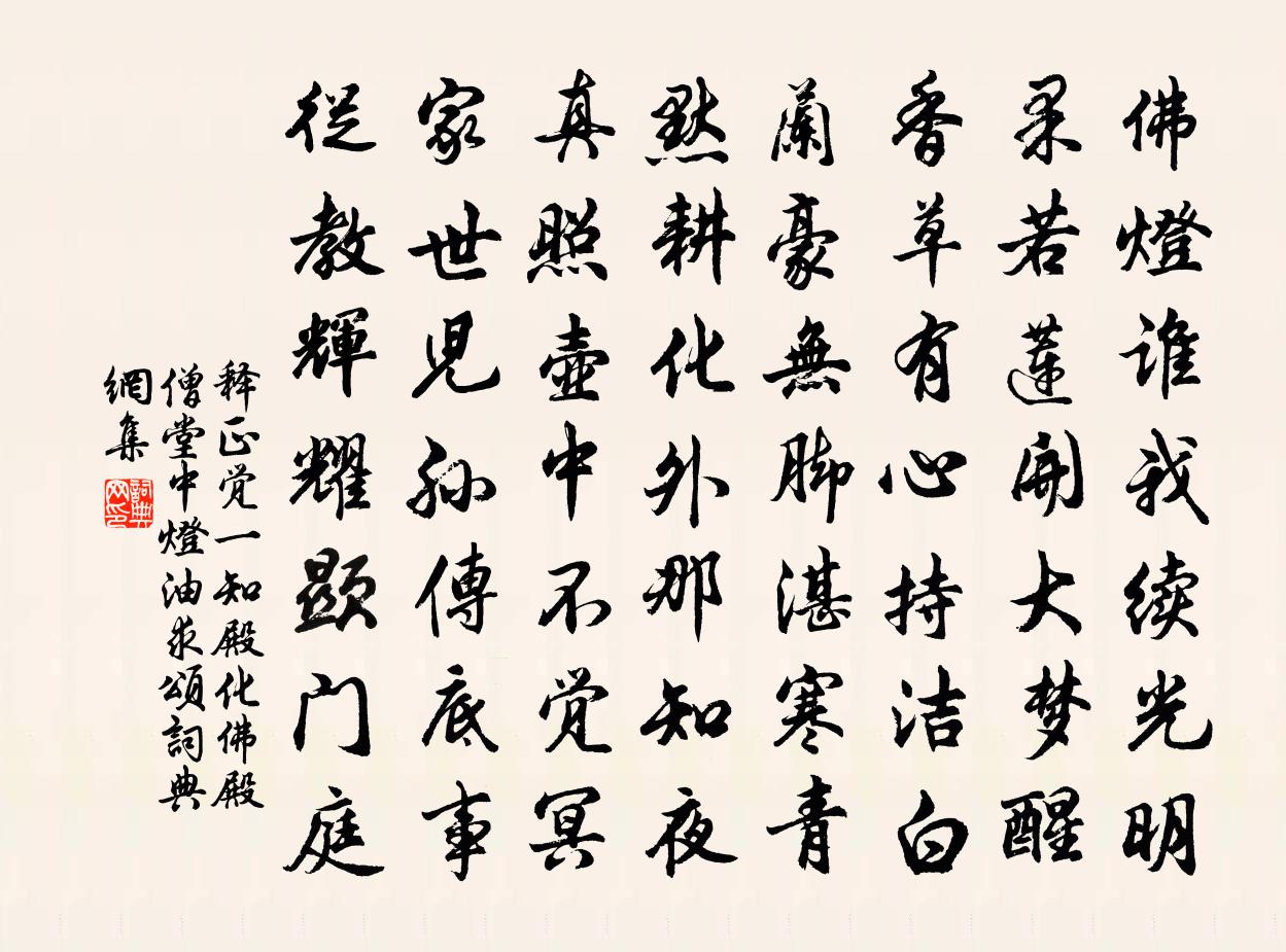 詩詞名句歷史字典書法欣賞書法字典國語詞典說文解字康熙字典古漢語字典標 題 作 者 詩 句 一知殿化佛殿僧堂中燈油求頌作者:釋正覺 朝代:宋代原文佛燈誰我續光明,果若蓮開大夢醒。香草有心持潔白,蘭豪無腳湛寒青。默耕化外那知夜,真照壺中不覺冥。家世兒孫傳底事,從教輝耀顯門庭。詩詞問答問:《一知殿化佛殿僧堂中燈油求頌》的作者是誰?答:釋正覺問:該詩寫於哪個朝代?答:宋代書法欣賞一知殿化佛殿僧堂中燈油求頌書法作品詩詞推薦甘露陳岩肖〔宋代〕負土築新阡,松楸手親藝。結廬居墓傍,猿鶴為垂涕。屈批幾星霜,精誠動天帝。三宵神澤零,霏霏灑松蓋。曉看陪淮南轉運魏兵部游穎州女郎台寺梅堯臣〔宋代〕舊傳媯氏女,將適楚人時。築館自臨水,故台空此基。因為楚宮媵,來與使車期。樓上望湖上,煙林晚蔽虧。追用徐廉使參政子方申屠侍御致遠張御史鵬飛方回〔宋代〕物有先時有後時,天工無早亦無遲。飽禁夜雨元非惡,暗受春風或未知。一死頻煩衰白報,三生不為落紅悲。解紛妾薄命梅堯臣〔宋代〕昔是波底沙,今為陌上塵。曾聞清泠混金屑,誰謂飄揚逐路人。悠悠萬物難自保,朝看穠華暮衰老。須知鉛黛不足玩郡齋海榴宋之問〔唐代〕澤國韶氣早,開簾延霽天。野禽宵未囀,山蜚晝仍眠。目茲海榴發,列映岩楹前。熠爚御風靜,葳蕤含景鮮。清晨奉和初春幸太平公主南莊應制李邕〔唐代〕傳聞銀漢支機石,復見金輿出紫微。織女橋邊烏鵲起,仙人樓上鳳凰飛。流風入座飄歌扇,瀑水侵階濺舞衣。今日木蘭花慢(元夕郡侯邀賦)劉應雄〔宋代〕梅妝堪點額,覺殘雪、未全消。忽春遞南枝,小窗明透,漸褪寒驕。天公似憐人意,便挽回、和氣做元宵。太守公和鮑守次韻林德祖十四首傅察〔宋代〕久嗟留滯壓叢輕,桃李無言向野亭。展驥始應流汗赤,登龍早見出藍青。三餘共對賢人酒,四野欣瞻別駕屏。何日感塞薛逢〔唐代〕滿塞旌旗鎮上游,各分天子一方憂。無因得見歌舒翰,可惜西山十八州。送方至劉克莊〔宋代〕老去憐才癖轉深,愛君筆力擅詞林。摶扶搖上二蟲笑,從渥窪來萬馬瘖。書號醇儒漸者遠,弘稱曲學到於今。漢家石牌峰陳岩〔宋代〕山斷空青近玉京,一牌就石琢磨成。煙揩霧拭明如鏡,留與遊人記姓名。見兒侄唱酬次韻五首蘇轍〔宋代〕讀書雖不惡,不讀亦自好。根牙就區別,花實隨時老。耘鋤不可無,雨露勿憂少。我釣不在魚,一竿寄洲島。恣逍遙丘處機〔元代〕忙裡偷閒,師前取意。勝如那、苦求庸昧。連朝抵暮,貪生不已。也道我、為人過了一世。假使狂圖,兼能巧智。送吳時父侍郎二首劉克莊〔宋代〕慧燈溥照人幽隱,心秤能權物重輕。士子比之常相國,吏民道是蔡端明。來時稻蟹非常熟,去日琴龜作伴行。安得寄陸隱君顧非熊〔唐代〕相思迢遞隔重城,鳥散階前竹塢清。定擬秋涼過南崦,長松石上聽泉聲。上吏部崔相公薛逢〔唐代〕龍門曾共戰驚瀾,雷電浮雲出浚湍。紫府有名同羽化,碧霄無路卻泥蟠。公車未結王生襪,客路虛彈貢禹冠。今日陪留宰游灌溪回飲縣圃六絕王炎〔宋代〕入眼山花盡笑迎,雙鳧飛處雨初晴。二年踏遍桃溪路,攜酒尋春只此行。頌證道歌證道歌釋印肅〔宋代〕中下多聞多不信,文章學解增心病。閻公未肯便饒伊,碓搗磨磨終不靜。題廬山太平興國宮寇準〔宋代〕飛泉噴薄走虹蜺,遠岫崢嶸植玉圭。若有桃花鎮開落,遊人應認武陵溪。玉虛道院朱鼎元〔宋代〕山東舍宅為琳宇,公子超然趣不群。帝足龜蛇交水火,將壇龍虎擁風雲。花階晝靜迎仙客,月殿香清禮老君。何日名句推薦相思一夜梅花發,忽到窗前疑是君。盧仝《有所思》 巴山重疊相逢處。燕子占巢花脫樹。張先《漁家傲·和程公辟贈》 位卑未敢忘憂國,事定猶須待闔棺。陸游《病起書懷》 行高者,名自高。人所重,非貌高。李毓秀《弟子規·泛愛眾》 昨日入城市,歸來淚滿巾。張俞《蠶婦》 聖人不能為時,時至而弗失。劉向《戰國策·秦三·秦客卿造謂穰侯》 秋草六朝寒,花雨空壇。朱彝尊《賣花聲·雨花台》 黃河水繞漢宮牆,河上秋風雁幾行。李夢陽《秋望》 湘淚淺深滋竹色,楚歌重疊怨蘭叢。李商隱《潭州》 武皇去金閣,英威長寂寞江淹《銅爵妓》