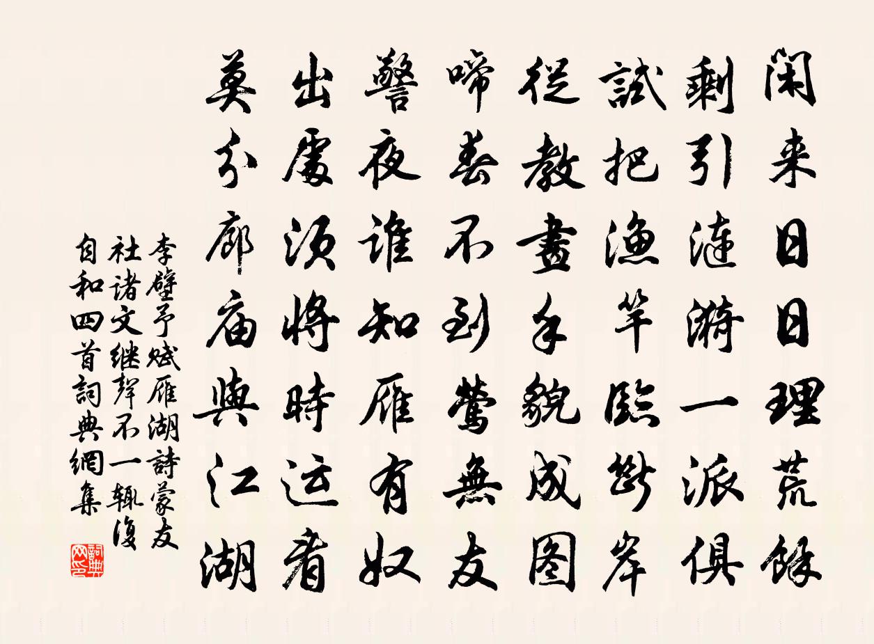 詩詞名句歷史字典書法欣賞書法字典國語詞典說文解字康熙字典古漢語字典標 題 作 者 詩 句 予賦雁湖詩蒙友社諸文繼聲不一輒復自和四首作者:李壁 朝代:宋代原文閒來日日理荒余,剩引漣漪一派俱。試把漁竿臨斷岸,從教畫手貌成圖。啼春不到鶯無友,警夜誰知雁有奴。出處須將時運看,莫分廊廟與江湖。詩詞問答問:《予賦雁湖詩蒙友社諸文繼聲不一輒復自和四首》的作者是誰?答:李壁問:該詩寫於哪個朝代?答:宋代書法欣賞予賦雁湖詩蒙友社諸文繼聲不一輒復自和四首書法作品詩詞推薦喜雨三首吳芾〔宋代〕昨朝偶得碧琳腴,不敢濡唇畏暑塗。雨過涼生襟袂爽,不妨傾倒且踟躕。走筆和張功父玉照堂十絕楊萬里〔宋代〕梅詩脫草巳流傅,要赴梅前更雪前。喚醒誠齋山里夢,落英如雪枕磚眠。重到都門俲轆轤體柴望〔宋代〕兩年不作京華夢,重到湖山事已非。柳外晚風寒食節,花間天氣雨晴時。闌乾獨憑鶯飛去,簾幕低垂燕未歸。欲托寄武昌簿孫彥常孔武仲〔宋代〕羈旅悠悠歲月殘,勝游無復似西山。從容把酒來天上,滴瀝嗚泉滿坐間。醉思隨風飄碧落,離襟和月墮荒灣。遙應挽湯仲能二首劉克莊〔宋代〕訃至聾三日,悲來贖百身。太丘州里化,伯起子孫貧。零落歐門士,消磨濮議人。殷勤齎掬淚,一灑素車塵。三堂道中寄公卷吳則禮〔宋代〕久坐懶成癖,誰令老作魔。逢人說江海,著處是關河。隴底烽燧暗,海門鴻雁多。西樓雲水白,猶奈酒樽麽。望江南/憶江南吳潛〔宋代〕家山好,好是夏初時。習習薰風回竹院,疏疏細雨灑荷漪。萬綠結成帷。呼社友,長日共追隨。瀹茗空時還酌酒,檄途寄翁靈舒徐璣〔宋代〕聞道長溪令,相當一館閒。便令全過舍,尚隔幾重山。為旅春郊外,懷人夜雨間。年來疏覽鏡,怕見減朱顏。十二月十八日會飲園夫獻桃花二首宋祁〔宋代〕今歲臘未破,明年春尚賒。天教催朔氣,先作塞南花。新春道中口占李新〔宋代〕老去難禁數別離,一樽春酒為誰悲。綠楊深院花飛處,只有東風獨自知。張連魯仲本蜀人從其先宦嶺表僅五六十年矣敖陶孫〔宋代〕毫州仙檜聃翁玩,西湖老檜陳朝餘。區區草木定何意,多生要傍齋房居。吾行東廣足已劬,兩年才到安期蒲。菩提浪淘沙劉禹錫〔唐代〕流水淘沙不暫停,前波未滅後波生。令人忽憶瀟湘渚,回暗迎神三兩聲。春日書懷四首姜夔〔宋代〕春雲驛路暗,遊了眇歸程。永懷故山下,風雨悲柏庭。翁仲不解語,綱鳥時時鳴。人家插垂柳,客里又清明。賢者之孝二百四十首郭巨林同〔宋代〕為養寧埋子,那知地有金。如何有天賜,且復怕官侵。臨江仙(風水洞作)蘇軾〔宋代〕四大從來都遍滿,此間風水何疑。故應為我發新詩。幽花香澗谷,寒藻舞淪漪。借與玉川生兩腋,天仙未必相思。偶書張鎡〔宋代〕移居桂隱詩全少,半為支離半為慵。今日一杯才引興,便成七字不求工。鶴來池畔閒尋水,蟬在松梢快語風。門外木蘭李石〔宋代〕大渡河邊瘴霧濃,邛崍關下木蘭紅。得州自昔連江雨,此地仍多出竅風,一笑萱花親念遠,三生藜杖子心同,莫緣吾年釋文珦〔宋代〕吾年易逾邁,感慨難具陳。齒髮半缺禿,肌膚多不仁。屏跡於空山,幾與木石鄰。憶昔少年時,秉志將求伸。所交史太師病癒未果走賀誕辰伊邇作古詩三首寄之劉應時〔宋代〕真隱愛西湖,居然來卜宅。春波自溶溶。秋林何策策。密邇城市居,夐與囂塵隔。開窗放月入,好句來幾席。【雙調】落梅風_天寶補遺姮張可久〔元代〕天寶補遺姮娥面,天寶年,鬧漁陽鼓聲一片。馬嵬坡襪兒得了看錢,太真妃死而無怨。西湖湖光靜,山影孤,載斜名句推薦嗚呼! 何時眼前突兀見此屋杜甫《茅屋為秋風所破歌》 百里不同風,千里不同俗班固《漢書·傳·王貢兩龔鮑傳》 盡無言、閒品秦箏,淚滿參差雁呂渭老《薄倖·青樓春晚》 自是相思抽不盡,卻教風雨怨秋聲。鄭燮《詠芭蕉》 花開深洞仙門小,路過懸橋羽節輕。劉滄《贈道者》 若待得君來向此,花前對酒不忍觸。蘇軾《賀新郎·夏景》 手攜稚子夜歸院,月冷空房不見人。白居易《為薛台悼亡》 江淮度寒食,京洛縫春衣。王維《送綦毋潛落第還鄉 / 送別》 柏台霜威寒逼人,熱海炎氣為之薄。岑參《熱海行送崔侍御還京》 淺情終似,行雲無定,猶到夢魂中。晏幾道《少年游·離多最是》