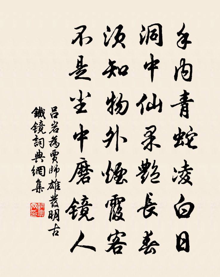詩詞名句歷史字典書法欣賞書法字典國語詞典說文解字康熙字典古漢語字典標 題 作 者 詩 句 為賈師雄發明古鐵鏡作者:呂岩 朝代:唐代為賈師雄發明古鐵鏡原文手內青蛇凌白日,洞中仙果艷長春。須知物外煙霞客,不是塵中磨鏡人。詩詞問答問:為賈師雄發明古鐵鏡的作者是誰?答:呂岩問:為賈師雄發明古鐵鏡寫於哪個朝代?答:唐代問:為賈師雄發明古鐵鏡是什麼體裁?答:七絕呂岩為賈師雄發明古鐵鏡書法欣賞為賈師雄發明古鐵鏡書法作品注釋全唐詩:卷858-37詩詞推薦再用出郊韻似延慶老三首吳潛〔宋代〕菩提只在攝心官,日觀元同月觀看。萬種因緣都是結,一花根蒂幾曾殘。祖師曾誓瘡膿壞,講主能參屎橛乾。石碩楮河張耒〔宋代〕土壁裂如削,流泉漱雨間。平沙放清淺,小石聚潺湲。絕岸木斜出,隔橋人暮還。憑鞍照毛髮,羈旅易衰顏。答問讀書居莫宣卿〔唐代〕書屋倚麒麟,不同牛馬路。床頭萬卷書,溪上五龍渡。井汲冽寒泉,桂花香玉露。茅檐無外物,只見青雲護。挽黃承事三首廖行之〔宋代〕疇昔雲天一覩披,十年徒有夢追隨。擔簦已負異時志,仰斗今余後學師。夜壑舟亡人孰秘,少微名在世空悲。嗟嗟七月二十一日午睡夢泛江風濤甚壯覺而有賦陸游〔宋代〕夢中不記適何邦,風飽蒲颿入大江。久矣眼中無此快,蹴天雪浪濺船窗。六言詩十首 其六嵇康〔兩漢〕名行顯患滋。位高勢重禍基。美色伐性不疑。厚味腊毒難治。如何貪人不思。宿監中偶作陸游〔宋代〕流落歸來兩鬢絲,此生真媿北山移。數殘宮漏寒無寐,開盡梅花病不知。同舍破甘醒宿酒,故人折簡索新詩。生涯蘭溪晚泊方岳〔宋代〕岸岸蘆花白,空江多月明。一簾秋色老,千里暮雲平。寒入霜前韭,香傳雨後橙。煩詩題品看,此酒舊知名。王齊萬秀才寓居武昌縣劉郎洑正與伍洲相對伍蘇軾〔宋代〕君家稻田冠西蜀,搗玉揚珠三萬斛。塞江流柿起書樓,碧瓦朱欄照山谷。傾家取樂不論命,散盡黃金如轉燭。惟余河梁晚望二首子蘭〔唐代〕水勢滔滔不可量,漁舟容易泛滄浪。連山翠靄籠沙漵,白鳥翩翩下夕陽。雨添一夜秋濤闊,極目茫茫似接天。不知董令升舍人朋溪圖趙祖文筆也曾幾〔宋代〕谷風不須歌,朋友道缺絕。請歌伐木詩,歌罷聽吾說。漢朝儒宗系,今代侍臣傑。甘泉久論思,陽羨小休歇。郊園贈惟了侍者陸游〔宋代〕雪中僵臥不須悲,徹骨清寒始解詩。一等人間閒草木,月窗君看早梅枝。相和歌辭子夜冬歌崔國輔〔唐代〕寂寥抱冬心,裁羅又絅絅。夜久頻挑燈,霜寒剪刀冷。題宣州延慶寺益公院(鹹通中入講極承恩澤)楊夔〔唐代〕嘿坐能除萬種情,臘高兼有賜衣榮。講經舊說傾朝聽,登殿曾聞降輦迎。幽徑北連千嶂碧,虛窗東望一川平。長年和胡仲方攝縣喜雨三首釋寶曇〔宋代〕雨入黃梅故弄晴,群龍鬚我一投誠。此無盡藏君為主,大貝明珠我得傾。壟頭水王建〔唐代〕壟水何年壟頭別,不在山中亦嗚咽。征人塞耳馬不行,未到壟頭聞水聲。謂是西流入蒲海,還聞北去繞龍城。壟東贈薜道士王遂〔宋代〕覿面逢幽侶,裝懷解吏紛。曾敲筠戶月,屢宿柳塘雲。離索知余恨,來過謝子勤。山中新雨足,幾處未耕耘。入道如夢令 山中逃熱三首張雨〔元代〕湖外殘鍾未了。過嶺樵夫恁早。犬吠又人行,推枕北窗清曉。清曉。清曉。勞動數聲啼鳥。陪謝紫微晚泛宋祁〔宋代〕積雨漲秋濠,輕舟共此邀。菰蒲斂鋩鍔,蓮芡熟橐韜。岸靜魚跳月,林喧鳥避篙。歸時興不淺,風物正蕭騷。宣甫以栟櫚茶刷見惠繼之以詩依韻奉和蘇頌〔宋代〕裝橐分餘具,茶筒使拂塵。制時工匪易,得處賞尤頻。常與輪槽並,宜為焙匣珍。齋中延客語,供辦未應貧。名句推薦見可而進,知難而退,軍之善政也。兼弱攻昧,武之善經也。左丘明《左傳·宣公·宣公十二年》 我住長江頭,君住長江尾。李之儀《卜運算元·我住長江頭》 照野瀰瀰淺浪,橫空隱隱層霄。蘇軾《西江月·頃在黃州》 兼聽則明,偏信則暗。司馬光《資治通鑑·唐紀八》 丈夫為志,窮當益堅,老當益壯。范曄《後漢書·列傳·馬援列傳》 內官初賜清明火,上相閒分白打錢。韋莊《長安清明》 乍見翻疑夢,相悲各問年。司空曙《雲陽館與韓紳宿別》 南山與秋色,氣勢兩相高。杜牧《長安秋望》 桑柘廢來猶納稅,田園荒後尚征苗。杜荀鶴《山中寡婦 / 時世行》 朱門沉沉按歌舞,廄馬肥死弓斷弦。陸游《關山月》