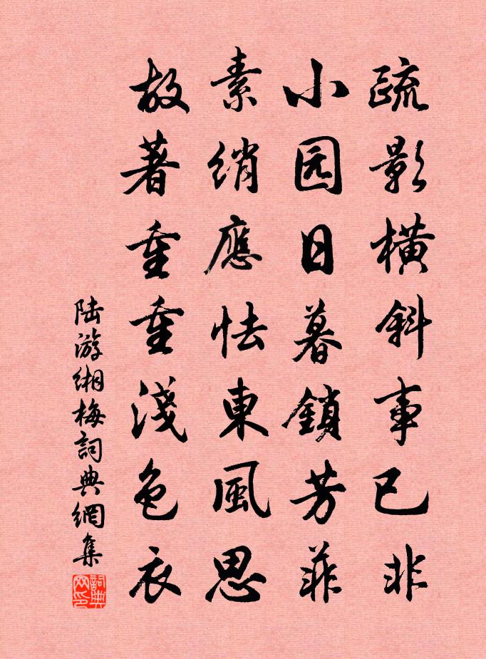 詩詞名句歷史字典書法欣賞書法字典國語詞典說文解字康熙字典古漢語字典標 題 作 者 詩 句 緗梅作者:陸游 朝代:宋代緗梅原文疏影橫斜事已非,小園日暮鎖芳菲。素綃應怯東風思,故著重重淺色衣。詩詞問答問:緗梅的作者是誰?答:陸游問:緗梅寫於哪個朝代?答:宋代問:陸游的名句有哪些?答:陸游名句大全陸游緗梅書法欣賞緗梅書法作品詩詞推薦新秋喜涼因寄兵部楊侍郎白居易〔唐代〕外強火未退,中銳金方戰。一夕風雨來,炎涼隨數變。徐徐炎景度,稍稍涼飆扇。枕簟忽淒清,巾裳亦輕健。老夫題汪水雲詩卷祖惟和〔宋代〕北去南來策蹇驢,偶然過我古玄都。雖無千樹桃花賦,卻有三秋桂子圖。賀老掛冠方賜剡,張翰命駕已歸吳。酒邊京東雜感洪昇〔清代〕勝國巡遊地,孤城有廢宮。周垣春草外,園殿夕陽下。狐搰沙翻雪,鴟蹲樹嘯風。唯餘舊村落,雞犬似新豐。失調名佚名〔宋代〕妙手庖人,搓得細如麻線。面兒白、心下黑,身長行短。驀地下來後,嚇出一身冷汗。這一場歡會,早危如累卵。沁園春·將止酒戒酒杯辛棄疾〔宋代〕杯汝來前!老子今朝,點檢形骸。甚長年抱渴,咽如焦釜;於今喜睡,氣似奔雷。汝說“劉伶,古今達者,醉後何至邑有感二首趙蕃〔宋代〕朱弦昔日被歌聲,歲月頻更感易生。唯有錦江橋下水,相逢不改舊時清。親耕籍田七首佚名〔宋代〕肇新帝藉,率我農人。三推終畝,祗事鹹均。陟降也時,粲然有文。受天之祐,多透如雲。又旋風吟二首邵雍〔宋代〕近日衰軀有病侵,如何醫藥不求尋。軒前密葉自成幄,砌下黃花空散金。閒看蜜蜂由蜜意,靜觀巢燕壘巢心。非關孔子泣顏回曹勛〔宋代〕噫嘻吁,天歟人歟,回也抑亦子之命歟,而其或者天實使之喪予。何仁者之不壽,而中道之棄兮。噫嘻吁,回歟回東堂獨坐懷琳老二首毛滂〔宋代〕聞道年來多掩關,高情定滿渺瀰間。秋風不怕清難忍,曉日應分暖伴閒。欲喚扁舟弄雲水,已疑小閣厭溪山。東堂清平樂晏幾道〔宋代〕蓮開欲遍,一夜秋聲轉。殘綠斷紅香片片,長是西風堪怨。莫愁家住溪邊,採蓮心事年年。誰管水流花謝,月明昨秀川館聯句許子紹〔宋代〕江聲床搖寒,山購窗拗綠。歸舟著沙邊,客夢繞鄉曲。簪盍豁秋悲,筵開從夜卜。黃花散疎籬,蒼竹圍破屋。詩誼德惟侍者巡釋智愚〔宋代〕岩桂初飄好問津,軟風輕結露華新。諸方不用多招手,自有尋香逐臭人。郡中言懷寄西川蕭員外羊士諤〔唐代〕功名無力愧勤王,已近終南得草堂。身外盡歸天竺偈,腰間唯有會稽章。何時臘酒逢山客,可惜梅枝亞石床。歲晚偈頌一百零二首釋慧遠〔宋代〕隴麥青春燕色過,嶺雲散盡楚天高。翻思歡喜園中事,八萬魔軍爭奈何。買硯碑趙孟堅〔宋代〕恰在貰金醉硯直,又逢古洛蔡公碑。摩挲不忍教他去,笑殺典衣償直時。贈畫僧鑒老王大受〔宋代〕高擊芒鞋聽學歸,一丘一壑自心知。小窗閒憶經行處,貌得疏煙晚照時。賦得暮雨送李胄 / 賦得暮雨送李曹韋應物〔唐代〕楚江微雨里,建業暮鍾時。漠漠帆來重,冥冥鳥去遲。海門深不見,浦樹遠含滋。相送情無限,沾襟比散絲。牽牛花危稹〔宋代〕青青柔蔓繞修篁,刷翠成花著處芳。應是折從河鼓手,天孫斜插鬢雲香。題玉山村叟屋壁錢起〔唐代〕谷口好泉石,居人能陸沈。牛羊下山小,煙火隔雲深。一逕入溪色,數家連竹陰。藏虹辭晚雨,驚隼落殘禽。涉趣名句推薦更無柳絮因風起,惟有葵花向日傾。司馬光《客中初夏》 盤心清露如鉛水,又一夜、西風吹折。張炎《疏影·詠荷葉》 何當痛飲黃龍府,高築神州風雨樓李大釗《口占一絕(壯別天涯未許愁)》 太上無敗,其次敗而有以成,此之謂用民。墨子《墨子·01章 親士》 一曲陽關,斷腸聲盡,獨自憑蘭橈柳永《少年游·參差煙樹灞陵橋》 君子遵道而行,半途而廢:吾弗能已矣。子思《中庸·第十一章》 玄都觀里桃千樹,花落水空流。元好問《人月圓·玄都觀里桃千樹》 嵩雲秦樹久離居,雙鯉迢迢一紙書。李商隱《寄令狐郎中》 草木也知愁,韶華竟白頭。曹雪芹《唐多令·柳絮》 去年今日關山路,細雨梅花正斷魂。蘇軾《正月二十日往岐亭郡人潘古郭三人送余於女王城東禪莊院》