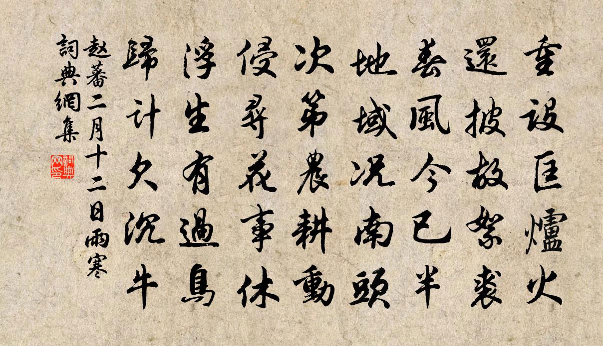 詩詞名句歷史字典書法欣賞書法字典國語詞典說文解字康熙字典古漢語字典標 題 作 者 詩 句 二月十二日雨寒作者:趙蕃 朝代:宋代二月十二日雨寒原文重設匡爐火,還披故絮裘。春風今已半,地域況南頭。次第農耕動,侵尋花事休。浮生有過鳥,歸計欠沉牛。詩詞問答問:二月十二日雨寒的作者是誰?答:趙蕃問:二月十二日雨寒寫於哪個朝代?答:宋代趙蕃二月十二日雨寒書法欣賞二月十二日雨寒書法作品詩詞推薦吳徐憲應特陳應龍〔宋代〕弱冠弄筆硯,恥為章句儒。夜半劍氣發,精光射天衢。欲分天子憂,張燈閱地圖。七閩山水秀,我亦思故廬。世事句郭廷謂〔宋代〕魄逐東流水,墳依獨坐山。重九席上觀金鈴菊韓億〔宋代〕黃金綴菊鈴,兗地獨馳名。細蕊浮杯雅,香筩貯露清。風休沈夜警,雨碎入寒聲。自此傳仙種,秋芳冠玉京。句薛紹彭〔宋代〕天寒湘水秋,雨暗蒼梧暮。舊里火後多有築宅有太平客戶也戴表元〔宋代〕人說離鄉賤,歸鄉更莫論。許詢家莫乾,杜甫客東屯。廢井微蹤出,新鄰雜語喧。平生江海意,歲晚白榆村。清水岩禱晴陳宓〔宋代〕檐聲喧耳歷三旬,雲氣低低過一春。今日舉頭逢皎日,也知天道總由人。淳熙元年端午帖子詞皇帝合六首崔敦詩〔宋代〕雙秀雲牟實,三眠雪繭豐。無人知帝力,渾在舜弦中。二月二日游洛源韓琮〔唐代〕舊苑新晴草似苔,人還香在踏青回。今朝此地成惆悵,已後逢春更莫來。西夏重陽王遜〔明代〕作縣幾時同志苦,投荒萬里倍情真。功名炊黍尋常夢,怪事書空感激人。擊柝徒吟胡地月,屯田也食漢渠春。艱難漁家傲(用履齊韻贈邵惜惜)郭應祥〔宋代〕自古餘杭多俊俏。風流不獨夸蘇小。又見尊前人窈窕。花枝裊。貪看忘卻朱顏老。曲巷橫街深更杳。追歡買笑須年登北樓吳則禮〔宋代〕落景孤雲共,清商戍角和。蒼煙淡伊洛,白露濕關河。牧馬隨鴻雁,行人擊駱駝。暮年余習在,猶欲聽邊歌。十一月二日至紫極宮誦李白詩及坡谷和篇因念劉克莊〔宋代〕翰林兩仙人,偶來聽鳳竹。蕭蕭玉千竿,采采綠一掬。少時負不群,中歲乃見觸。嗟余長十年,所至戀三宿。徑當會雙竹蓆上奉答開祖長官蘇軾〔宋代〕松柏蕭蕭滿故丘,知君懷抱尚悲秋。算來九九無多日,唱著三三憶舊遊。皓月徘徊應許共,清詩妙絕不容酬。梅花上馮使君水晶數珠貫休〔唐代〕泠泠瀑滴清,貫串有規程。將諷觀空偈,全勝照乘明。龍神多共惜,金玉比終輕。願在玄暉手,常資物外情。答樂天見憶劉禹錫〔唐代〕與老無期約,到來如等閒。偏傷朋友盡,移興子孫間。筆底心無毒,杯前膽不豩。唯餘憶君夢,飛過武牢關。洛陽曲陳襄〔宋代〕有客頓征轡,暮宿洛陽堤,洛陽繁華地,慨然心傷悲。憶昔季倫家,朱門鼎貴時。錦步四十里,冠蓋相追隨。寵移西江月 贈任守一馬鈺〔元代〕一不輕師慢法,二遵清靜仙經。三存精氣養神靈。四把塵勞拂盡。五戒無明業火,六除俗禮人情。七擒猿馬未安寧答黎士曹黎生前適越後之楚皎然〔唐代〕楚木紛如麻,高松自孤直。願得苦寒枝,與君比顏色。故鄉眇天末,羈旅滄江隅。委質在忠信,苦心無變渝。何繇偈頌二百零五首釋正覺〔宋代〕不是心,不是物。非天非人,非僧非俗。南北東西莫我尋,長短方圓莫我測。牛飲星河,兔眠月窟,徹底靈明破昏晚泊陸游〔宋代〕半世無歸似轉蓬,今年作夢到巴東。身游萬死一生地,路入千峰百嶂中。鄰舫有時來乞火,叢祠無處不祈風。晚潮名句推薦正護月雲輕,嫩冰猶薄。辛棄疾《瑞鶴仙·賦梅》 勿貪意外之財,勿飲過量之酒。朱柏廬《朱子家訓·全文》 城門失火,殃及池魚。佚名《增廣賢文·上集》 治天下者當用天下之心為心,不得自專快意而已也。班固《漢書·傳·王貢兩龔鮑傳》 更落盡梨花,飛盡楊花,春也成憔悴。汪元量《鶯啼序·重過金陵》 香爐初上日,瀑水噴成虹。孟浩然《彭蠡湖中望廬山》 西園何限相思樹,辛苦梅花候海棠。元好問《鷓鴣天·候館燈昏雨送涼》 前度綠陰載酒,枝頭色比舞裙同。王沂孫《慶清朝·榴花》 何時更杯酒,再得論心胸。李白《魏郡別蘇明府因北游》 一生之內, 當無愧古人姚察、姚思廉《梁書·列傳·卷二十九》