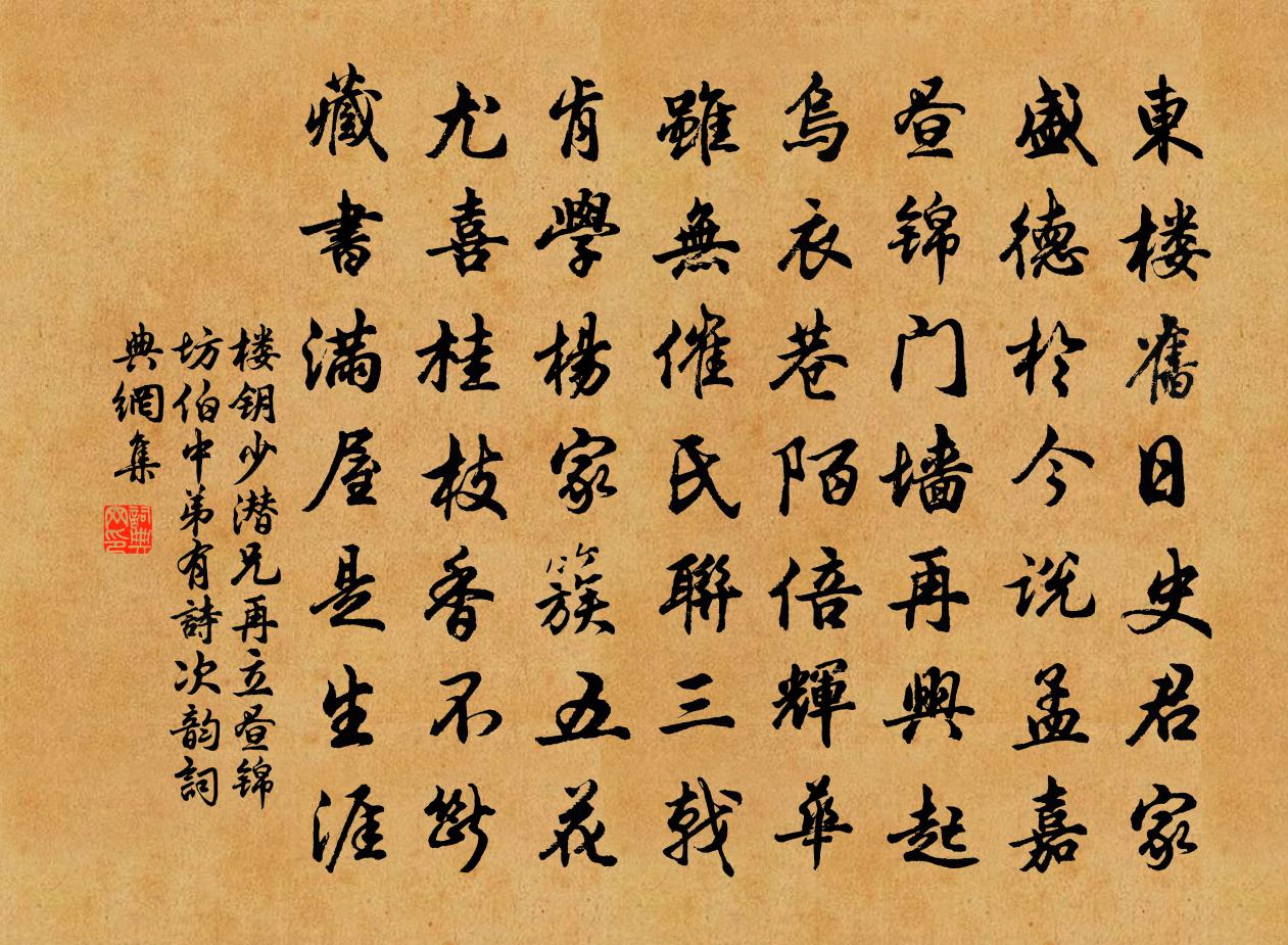 詩詞名句歷史字典書法欣賞書法字典國語詞典說文解字康熙字典古漢語字典標 題 作 者 詩 句 少潛兄再立晝錦坊伯中弟有詩次韻作者:樓鑰 朝代:宋代原文東樓舊日史君家,盛德於今說孟嘉。晝錦門牆再興起,烏衣巷陌倍輝華。雖無催氏聯三戟,肯學楊家簇五花。尤喜桂枝香不斷,藏書滿屋是生涯。詩詞問答問:《少潛兄再立晝錦坊伯中弟有詩次韻》的作者是誰?答:樓鑰問:該詩寫於哪個朝代?答:宋代書法欣賞少潛兄再立晝錦坊伯中弟有詩次韻書法作品詩詞推薦和此陽先生感興詩二十首劉黻〔宋代〕交遊重金石,里巷毋泛尋。胸中抱明鏡,妍醜不相侵。熱交但以貌,冷交惟其心。勢利易苟合,道義難力任。詠春挽席夫人二首吳芾〔宋代〕猗歟陶母世稱賢,生子還持輔佐權。政府舊曾迎象服,成都重見擁戎旃。佳城閉處千車集,華屋生來五福全。終始庚子八月八日再游東山寺韓縝〔宋代〕蜀師當日戍黃金,此地由來險阻深。漾水東流自紆直,泰山北望正嶔崯。涼風肅物初秋意,膏澤愆期旦書陰。同是薊丘覽古贈盧居士藏用七首。田光先生陳子昂〔唐代〕自古皆有死,徇義良獨稀。奈何燕太子,尚使田生疑。伏劍誠已矣,感我涕沾衣。萬安道中書事德三首楊萬里〔宋代〕攜家滿路蹈春華,兒女欣欣不憶家。騎吏也忘行役苦,一人人插一枝花。邊城寓題薛能〔唐代〕孤蹇復飄零,天涯若墮螢。東風吹痼疾,暖日極青冥。蠶市歸農醉,漁舟釣客醒。論邦苦不早,只此負王庭。送錢國博解成都漕節詳刑湖右度正〔宋代〕坐於黃卷得新功,學海波中號老龍。雅以明經空四海,何曾屈膝拜三公。漢庭耿耿千回夢,蜀道依依一節東。帷幄西江月張掄〔宋代〕一夢浮生未覺,三冬短晷堪驚。天高誰解挽長繩。系住流年光景。須信陰陽有定,非關歲月無情。若教心地湛然清二月十六日夜獨酌思歸四首方回〔宋代〕樓前春水欲生蛙,樓上無眠夜憶家。官道靴鳴知有雨,故溪船去好移花。耆年極荷神只借,直性難禁世俗嘩。便可表臣檢校東皋雨中有懷詩以促歸李處權〔宋代〕旅泊愁春雨,春寒更北風。雲山方秀髮,煙樹卻冥濛。念我攜家客,逢君足谷翁。胡為在窮谷,正渴一尊同。禪人寫真請贊十二首釋曇華〔宋代〕江上青山千萬疊,水邊茅屋兩三間。朝來無限扁舟過,何似渠儂把釣竿。冬至展墓偶成杜范〔宋代〕至日沖寒掃墓墟,悽然一拜一欷噓。蓼莪恨與雲無際,常棣愁催雪滿裾。誤落世塵驚日月,謾牽吏鞅廢詩書。回頭頌十六首釋慧暉〔宋代〕不傳之傳句,先賢也不傳。佛祖未出興,早是有付傳。不妙之妙句古聖也難宣。黃頭碧眼老,如何及言宣。不真之青玉案王千秋〔宋代〕鳴鼉欲引魚龍戲。先自作、長江擂。頭管一聲天外起。群仙俱上,有人殊麗。認得分明是。欲相問勞來無計。但隔好事近鄭獬〔宋代〕把酒對江梅,花小未禁風力。何計不教零落,為青春留得。故人莫問在天涯,尊前苦相憶。好把素香收取,寄江南喜晴范成大〔宋代〕窗間梅熟落蒂,牆下筍成出林。連雨不知春去,一晴方覺夏深。鷓鴣天李之儀〔宋代〕收盡微風不見江。分明天水共澄光。由來好處輸閒地,堪嘆人生有底忙。心既遠,味偏長。須知粗布勝無裳。從今無雙秦觀〔宋代〕尚書有女名無雙,蛾眉如畫學新妝。伊家仙客最明俊,舅母唯只呼王郎。尚書往日先曾許,數載暌違今復遇。聞說玩殘花楊發〔唐代〕十日濃芳一歲程,東風初急眼偏明。低枝似泥幽人醉,莫道無情似有情。臨江仙王哲〔元代〕八卦分明鋪擺定,二人各四陽陰。中間玄妙細搜尋。若能知此味,便是得真金。恬淡隱藏清與淨,甜甘卻顯佳音。名句推薦雨雪雰雰,益之以霢霂。佚名《信南山》 圖未就之功,不如保已成之業洪應明《菜根譚·概論》 人有不及,可以情恕。房玄齡《晉書·列傳·第六章》 凍臉有痕皆是血,酸心無恨亦成灰。曹雪芹《詠紅梅花得“梅”字》 守節自誓,親誨之學。歐陽修《畫地學書》 春風來不遠,只在屋東頭。于謙《除夜太原寒甚》 肯救人坑坎中,便是活菩薩王永彬《圍爐夜話·第二八則》 千磨萬擊還堅勁,任爾東西南北風。鄭燮《竹石》 長江悲已滯,萬里念將歸。王勃《山中》 誤落塵網中,一去三十年。陶淵明《歸園田居·其一》