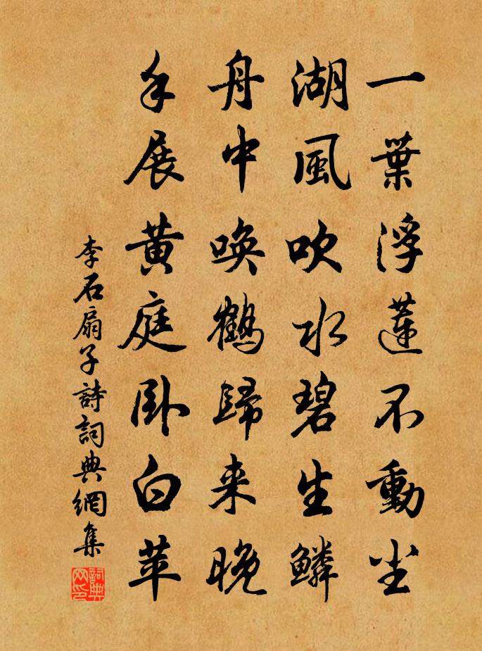 詩詞名句歷史字典書法欣賞書法字典國語詞典說文解字康熙字典古漢語字典標 題 作 者 詩 句 扇子詩作者:李石 朝代:宋代扇子詩原文一葉浮蓮不動塵,湖風吹水碧生鱗。舟中喚鶴歸來晚,手展黃庭臥白苹。詩詞問答問:扇子詩的作者是誰?答:李石問:扇子詩寫於哪個朝代?答:宋代李石扇子詩書法欣賞扇子詩書法作品詩詞推薦聞雁齊己〔唐代〕瀟湘浦暖全迷鶴,邏逤川寒只有雕。誰向孤舟憶兄弟,坐看連雁度橫橋。再至西都歐陽修〔宋代〕伊川不到十年間,魚鳥今應怪我還。浪得浮名銷壯節,羞將白髮見青山。野花向客開如笑,芳草留人意自閒。卻到送白處士游峨嵋齊己〔唐代〕閒身誰道是羈游,西指峨嵋碧頂頭。琴鶴幾程隨客棹,風霜何處宿龍湫。尋僧石磴臨天井,劚藥秋崖倒瀑流。莫為次韻劉君鼎見贈二首方回〔宋代〕厭聞世態已如聾,舊雨人來久絕蹤。自笑雲萍無定止,不圖針芥有奇逢。侯門列鼎三牲奉,田舍巾車一鹿容。試問讀白耷山人詩查慎行〔清代〕人謂狂生本不狂,漆身吞炭事何常?亂余賓客搜亡命,赦後英雄恥故鄉。寶劍塵封三尺水,麻鞵寒踏九州霜。隨身阮郎歸晏幾道〔宋代〕晚妝長趁景陽鍾。雙蛾著意濃。舞腰浮動綠雲濃。櫻桃半點紅。憐美景,惜芳容。沈思暗記中。春寒簾幕幾重重。題釣台邵亢〔宋代〕子陵毛台下山層毛層,奇峰毛壯氣橫雲毛生。處士溪邊水泚泚,碧波明月涵天清。老松偃蹇傲世色,綠竹瀟灑吟風暮春泛西湖次口號韻呈程待制十首陳造〔宋代〕詩到雙峰自一家,紛綸仙卉雜天葩。幾時共載西湖去,千紙看公寫物華。李監宅二首(一作李鹽鐵)杜甫〔唐代〕尚覺王孫貴,豪家意頗濃。屏開金孔雀,褥隱繡芙蓉。且食雙魚美,誰看異味重。門闌多喜色,女婿近乘龍。華館循梅路口四首劉克莊〔宋代〕導吏倉忙乞調兵,未應機動遣鷗驚。傳聞老子腳踏車至,慚愧偷兒讓路行。飲中八仙歌杜甫〔唐代〕知章騎馬似乘船,眼花落井水底眠。汝陽三斗始朝天,道逢麴車口流涎,恨不移封向酒泉。左相日興費萬錢,飲如次韻何茂恭詠玉簪三絕喻良能〔宋代〕金谷墜樓人已遠,樓前首飾尚堪尋。誰家玉面雪肌女,淡掃蛾眉方稱簪。偈頌五十一首釋道沖〔宋代〕五日風,十日雨。君聖臣賢,歌謠滿路。雜曲歌辭。古別離李益〔唐代〕雙劍欲別風悽然,雌沉水底雄上天。江回漢轉兩不見,雲交雨合知何年。古來萬事皆由命,何用臨岐苦涕漣。端午夫人閣羅公升〔宋代〕黃金角黍照盤明,秋月弓灣鬥彩贏。應是君王方右武,內家仙子亦知兵。以右軍書數種贈邱十四黃庭堅〔宋代〕邱郎花氣如春景晴,風暄百果草木生。眼如霜鶻齒玉冰,擁花環坐愛花明。松花泛硯摹真行,字身藏穎秀勁清,問謫後再書一絕盧肇〔唐代〕崆峒道士誤燒丹,赤鼠黃牙幾許難。墜墮閻浮南斗下,不知何事犯星官。鷓鴣天(靖州江通判塤生日)魏了翁〔宋代〕日上午頭度歲辰。黃鐘吹龠煦乾坤。弦歌堂上三稱壽,風月亭前又見君。人似舊,景長新。明朝六桂侍雙椿。蠻邦梁三朝雅樂歌 需雅 六沈約〔南北朝〕膳夫奉職獻芳滋。不麛不夭鹹以時。調甘適苦別澠淄。其德不爽受福厘。於焉逸豫永無期。代鳩婦言歐陽修〔宋代〕斑然錦翼花簇簇,雄雌相隨樂不足。抱雛出卵翅羽成,豈料一朝還反目。人言嫁雞逐雞飛,安知嫁鳩被鳩逐。古來名句推薦裊裊兮秋風,洞庭波兮木葉下。屈原《九歌·湘夫人》 回看射鵰處,千里暮雲平。王維《觀獵》 用下敬上,謂之貴貴;用上敬下,謂之尊賢。貴貴、尊賢,其義一也。孟子《孟子·萬章章句下·第三節》 柳外斜陽,水邊歸鳥,隴上吹喬木。辛棄疾《念奴嬌·登建康賞心亭呈史致道留守》 亂碧萋萋,雨後江天曉。梅堯臣《蘇幕遮·草》 不忍覆余觴,臨風淚數行納蘭性德《菩薩蠻·催花未歇花奴鼓》 路出大梁城,關河開曉晴。謝榛《渡黃河》 中庭月色正清明,無數楊花過無影。張先《木蘭花·乙卯吳興寒食》 記得綠羅裙,處處憐芳草。賀鑄《綠羅裙·東風柳陌長》 庭前時有東風入,楊柳千條盡向西。劉方平《代春怨》