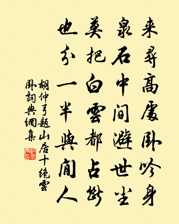 詩詞名句歷史字典書法欣賞書法字典國語詞典說文解字康熙字典古漢語字典標 題 作 者 詩 句 題山居十絕雲臥作者:胡仲弓 朝代:宋代題山居十絕雲臥原文來尋高處臥吟身,泉石中間避世塵。莫把白雲都占斷,也分一半與閒人。詩詞問答問:題山居十絕雲臥的作者是誰?答:胡仲弓問:題山居十絕雲臥寫於哪個朝代?答:宋代胡仲弓題山居十絕雲臥書法欣賞題山居十絕雲臥書法作品詩詞推薦閒趣陸游〔宋代〕堅閉門來又過冬,一裘且復擁龍鍾。不辭陋巷如漿冷,自愛新醅似粥醲。迎婦橋邊燈煜煜,賽神林外鼓冬冬。豈惟贈裴十迪王維〔唐代〕風景日夕佳,與君賦新詩。澹然望遠空,如意方支頤。春風動百草,蘭蕙生我籬。曖曖日暖閨,田家來致詞。欣欣丙申二月既望仲退再來山中意行談舊送別悵望徐端〔宋代〕夢中幾度尋安道,也似當年泛剡回。可是山中緣未斷,又從雲外寄詩來。次韻邵公濟尋梅三首郭印〔宋代〕天與幽姿自不同,凌寒獨秀雪霜中。山茶未許方高潔,故使千花立下風。有感司空圖〔唐代〕燈影看須黑,牆陰惜草青。歲闌悲物我,同是冒霜螢。釋秘演詩集序歐陽修〔宋代〕予少以進士游京師,因得盡交當世之賢豪。然猶以謂國家臣一四海,休兵革,養息天下以無事者四十年,而智謀雄送滎陽魏主簿歐陽修〔宋代〕卓犖東都子,姓名聞十年。窮冬雪塞空,千里至我門。子足未及閾,我衣驚倒顛。仆童相視疑,寮吏或不然。俛首孔明廟柏袁說友〔宋代〕陵邱冉冉菸草新,叢祠寂寂君與臣。千年不死一庭柏,八陣猶餘三峽春。昔人已化遼東鶴,古往今來事如昨。當年吳下同年會詩胡元功〔宋代〕佳辰勝集不相違,慨念同年會遇稀。獨有二天均覆蔭,歸來三徑幸棲依。詩篇酒盞論時事,山色湖光映夕暉。自愧次韻程帥游習池三首陳造〔宋代〕青編勳業笑談追,千載生賢瑞聖時。竹帛會書河似帶,封疆不止漢為池。玄譚日屬王平子,妙語心輕謝客兒。來歲閒臥有所思二首白居易〔唐代〕向夕搴簾臥枕琴,微涼入戶起開襟。偶因明月清風夜,忽想遷臣逐客心。何處投荒初恐懼?誰人繞澤正悲吟?始知頌古五十三首釋文禮〔宋代〕天地同根物一體,大夫曾舉向南泉。庭前指出花如夜,幾個親曾到檻前。留題水北楊郎中園亭二首邵雍〔宋代〕洛下誰家不買居,買居還得似君無。風光一片非塵世,景物四時成畫圖。後圃花奇同閬苑,前軒峰好類蓬壺。人生壽周益公李商叟〔宋代〕昨夜微雲概太清,銀河映帶壽星明。祥開碧落中元節,人頌昇平上相生。天上異恩尊帝傅,洛陽好事寫耆英。長身送張校書季霞賈島〔唐代〕從京去容州,馬在船上多。容州幾千里,直傍青天涯。掌記試校書,未稱高詞華。義往不可屈,出家如入家。城市受詔修書述懷感事三十韻劉筠〔宋代〕良弼論思暇,英才視草余。西清承密旨,東觀類群書。左氏先經日,征南發例初。編年終顯德,歷帝自凡蘧。一覽春行賀鑄〔宋代〕風俗喜嘉辰,行樂東城春。人歌芍藥章,馬度楊柳津。田畝久枯渴,麥芒棲暗塵。焦心戴白叟,日望西郊雲。桂水五千里四首楊維楨〔元代〕桂水五千里,春來波浪深。地消青青瘴,花髮乳蕉林。桂水五千里,瀟湘雨氣空。衡山七十二,望見女英峰。桂水病中王銍〔宋代〕遙夜支頤坐,春醪負十分。碧煙沈宿靄,清月入微雲。真妄怯多病,翔潛喜不聞。秋韃人樂處,十載愴離群。雁翅夾作孔武仲〔宋代〕川險固可畏,順風胡不行。維舟雁翅浦,安此水一泓。宗愨萬里意,謝安江海情,子何獨惴惴,不慕天地鵬。傳聞名句推薦坐到三更盡,歸仍萬里賒。戎昱《桂州臘夜》 黃昏寒立更披襟,露浥清香悅道心。司空圖《白菊雜書四首》 中夜四五嘆,常為大國憂。李白《經亂離後天恩流夜郎憶舊遊書懷贈江夏韋太守良宰》 烽火城西百尺樓,黃昏獨上海風秋。王昌齡《從軍行七首》 回首天涯,一抹斜陽,數點寒鴉。張可久《折桂令·九日》 淮水東邊舊時月,夜深還過女牆來。劉禹錫《金陵五題·石頭城》 誠者自成也,而道自道也。子思《中庸·第二十五章》 天下大勢,分久必合,合久必分。羅貫中《三國演義·第一回》 吃不了兜著走曹雪芹《紅樓夢·第二十三回》 雨濕花房,風斜燕子,池閣晝長春晚。呂渭老《選冠子·雨濕花房》