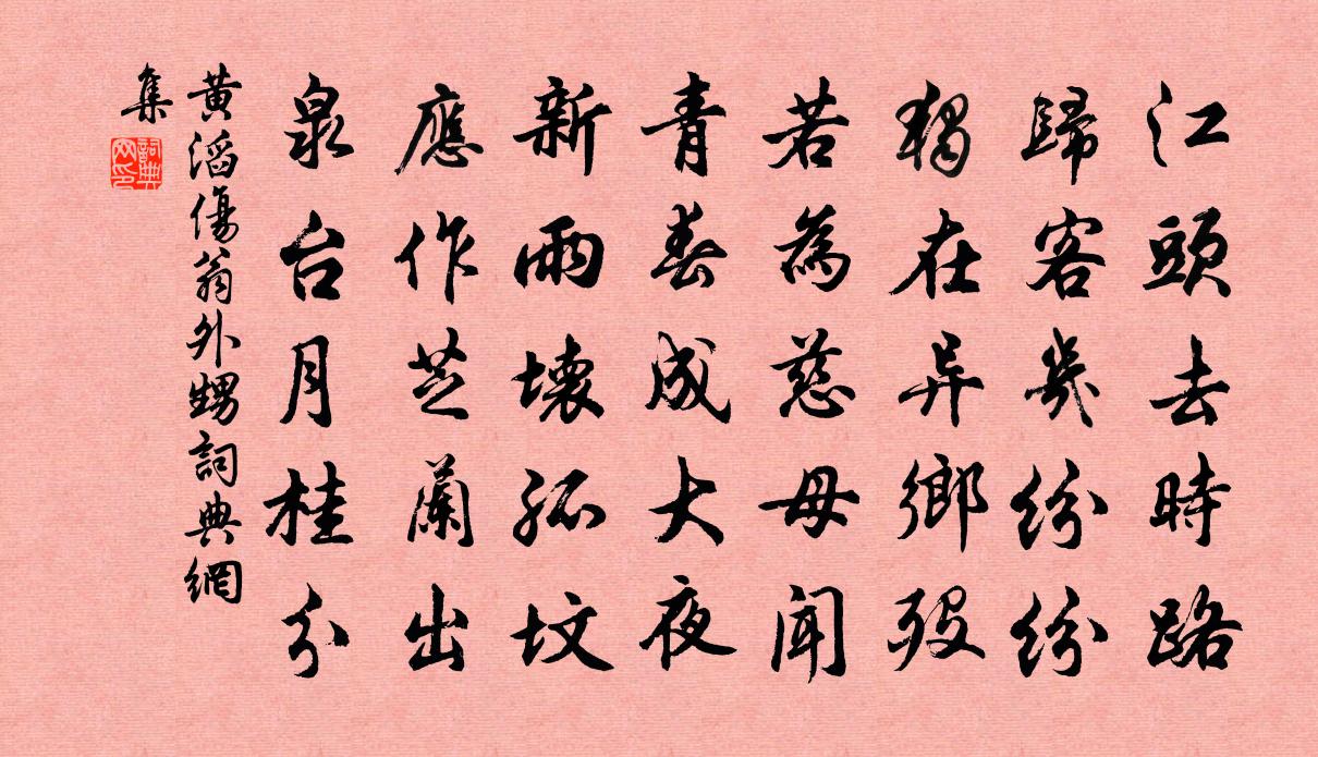 詩詞名句歷史字典書法欣賞書法字典國語詞典說文解字康熙字典古漢語字典標 題 作 者 詩 句 傷翁外甥作者:黃滔 朝代:唐代傷翁外甥原文江頭去時路,歸客幾紛紛。獨在異鄉歿,若為慈母聞。青春成大夜,新雨壞孤墳。應作芝蘭出,泉台月桂分。詩詞問答問:傷翁外甥的作者是誰?答:黃滔問:傷翁外甥寫於哪個朝代?答:唐代問:傷翁外甥是什麼體裁?答:五律黃滔傷翁外甥書法欣賞傷翁外甥書法作品注釋全唐詩:卷704-67詩詞推薦題前歙令楚君雪梅圖方回〔宋代〕洛雪一丈凍獨鼾,誰其排闥驚袁安。千載神交兩賢令,寄意愛此英姿寒。馬縮龍埋萬木折,胸次陽和骨立鐵。紈袴山中哭復齋高翥〔宋代〕封章字少納忠多,袖疏前陳無奈何。但得中天行日月,不愁平地起風波。台官論罪終投筆,山賊聞名亦倒戈。惆悵偈頌一百五十首釋心月〔宋代〕山遙海闊古蘭若,月白風清老比丘。萬象森羅總賓客,相逢莫不小低頭。高樓夜彈箏常建〔唐代〕高樓百餘尺,直上江水平。明月照人苦,開簾彈玉箏。山高猿狖急,天靜鴻雁鳴。曲度猶未終,東峰霞半生。真娘墓王禹偁〔宋代〕女命在於色,士命在於才。無色無才者,未死如應灰。虎丘真娘墓,止是空土堆。香魂與膩骨,銷散隨黃埃。何事婦女之孝二十首北宮女林同〔宋代〕妾身期不嫁,至老養雙親。何意趙威后,殷勤問使人。送知府王大夫李新〔宋代〕平生和氣滿襟春,往事飛鳧自在身。風伯已驅天上霧,觀書仍起漢濱人。一鞭草色吟青嶂,幾刻花陰夢紫宸。從此嘆發落白居易〔唐代〕多病多愁心自知,行年未老發先衰。隨梳落去何須惜,不落終須變作絲。次申屠子迪韻王冕〔元代〕紅塵車馬事紛紛,高眼何曾有見聞?竹屋夜深時聽雨,石床秋冷不生雲。歸來每愛陶彭澤,漂泊誰憐鄭廣文?門徑林容州別墅劉克莊〔宋代〕出郭五里強,治地十畝寬。奇峰面朝挹,高阜背屈蟠。忽獻若神授,久閟由天慳。茲焉卜壽宮,朱堊浮林端。使君北樓送客歸上都白居易〔唐代〕憑高眺遠一淒淒,卻下朱欄即解攜。京路人歸天直北,江樓客散日平西。長津欲度回船尾,殘酒重傾簇馬蹄。不獨頌古十九首釋慧暉〔宋代〕一人道不落,一人道不昧。夜來一陣狂風生,浪打石頭如粉碎。和陶淵明歸田園居六詩陳造〔宋代〕一室類蜂房,為食來窮山。僅救飢火煎,跋履恐雕年。平生丘壑念,回首魚脫淵。鄉居何許家,菰茭滿中田。有兒游天竺靈隱三絕胡仲弓〔宋代〕冷泉亭角坐移時,試看孤峰飛不飛。峰自不飛人自醉,暮鴉棲了更忘歸。鷓鴣天室人降日以此奉寄魏初〔元代〕去歲今辰卻到家,今年相望又天涯。一春心事閒無處,兩鬢秋霜細有華。山接水,水明霞。滿林殘照見歸鴉。何時牧牛兒張耒〔宋代〕牧牛兒,遠陂牧。遠陂牧牛芳草綠,兒怒掉鞭牛不觸。澗邊古柳南風清,麥深蔽日野田平。烏犍礪角逐春行,老牸坐睡依韻和持國梅堯臣〔宋代〕坐久既生倦,漸看冠佩斜。鐘聲傳紫禁,烏影轉西華。竊印後當致,觸屏前未嘉。不為疏慢意,何用北窗夸。次韻魯堯卿病起陳棣〔宋代〕河陽桃李未成陰,已覺栽培用意深。病起暫同中酒味,詩來還有惜花心。養全浩氣虹千丈,瘦減清標玉一尋。春待句釋延壽〔宋代〕步步寒華結,言言徹底冰。夏夜起坐南亭達曉不復寐陸游〔宋代〕風露青冥近九秋,脫巾扶杖冷颼飀。曲闌影外巴山月,畫角聲中楚塞愁。巢燕並棲高棟穩,潛魚時躍小池幽。悠然名句推薦津橋春水浸紅霞,煙柳風絲拂岸斜。雍陶《天津橋望春》 伊川桃李正芳新,寒食山中酒復春。宋之問《寒食還陸渾別業》 用人物,須明求。儻不問,即為偷。李毓秀《弟子規·謹》 牆裡鞦韆牆外道。牆外行人,牆裡佳人笑。蘇軾《蝶戀花·春景》 玉勒雕鞍遊冶處,樓高不見章台路。歐陽修《蝶戀花·庭院深深深幾許》 江畔何人初見月?江月何年初照人?張若虛《春江花月夜》 忠臣挾難進之術,吐逆耳之言陳壽《三國志·魏書·辛毗楊阜高堂隆傳》 何日功成名遂了,還鄉,醉笑陪公三萬場。蘇軾《南鄉子·和楊元素時移守密州》 威宜自嚴而寬,先寬後嚴者人怨其酷。洪應明《菜根譚·概論》 夜深斜搭鞦韆索,樓閣朦朧煙雨中。韓偓《夜深 / 寒食夜》