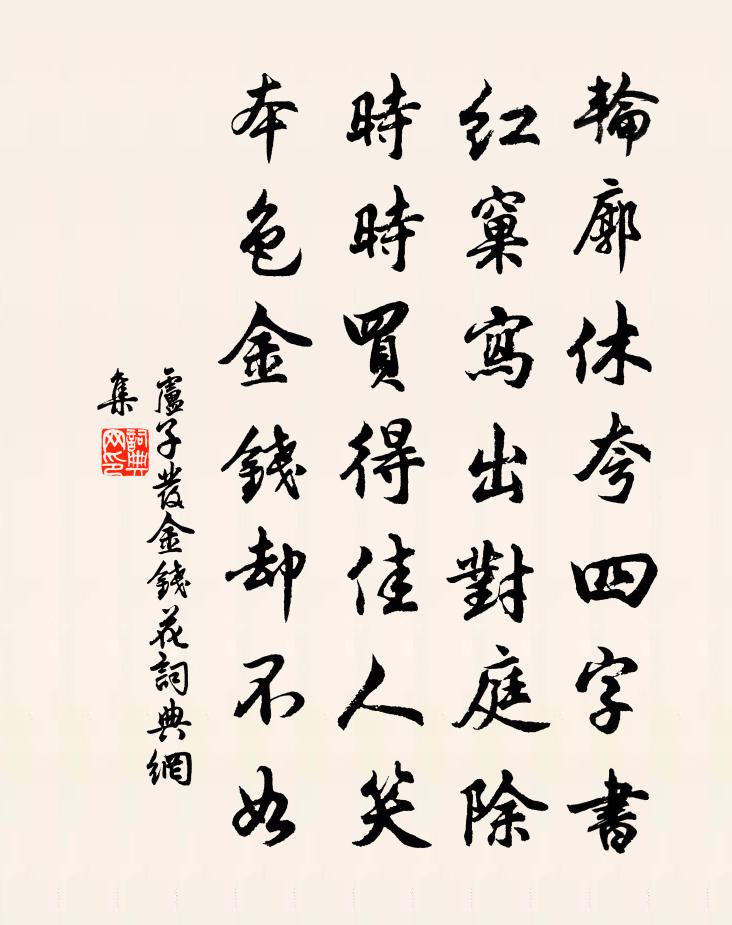 詩詞名句歷史字典書法欣賞書法字典國語詞典說文解字康熙字典古漢語字典標 題 作 者 詩 句 金錢花作者:盧子發 朝代:唐代金錢花原文輪廓休夸四字書,紅窠寫出對庭除。時時買得佳人笑,本色金錢卻不如。詩詞問答問:金錢花的作者是誰?答:盧子發問:金錢花寫於哪個朝代?答:唐代問:金錢花是什麼體裁?答:七絕盧子發金錢花書法欣賞金錢花書法作品注釋全唐詩:卷770-40詩詞推薦漁父/漁歌子陸游〔宋代〕石帆山下雨空濛。三扇香新翠箬篷。苹葉綠,蓼花紅。回首功名一夢中。過家黃庭堅〔宋代〕絡緯聲轉急,田車寒不運。兒時手種柳,上與雲雨近。舍傍舊傭保,少換老欲盡。宰木郁蒼蒼,田園變畦畛。招延菩薩蠻(戊辰重陽)郭應祥〔宋代〕分宜七里逢重九。籬根無菊尊無酒。蕭颯鬢如蓬。不禁吹帽風。插花開口笑。未分輸年少。明歲定王台。傳杯不放凝香齋曾鞏〔宋代〕每覺西齋景最幽,不知官是古諸侯。一尊風月身無事,千里耕桑歲有秋。雲水醒心鳴好鳥,玉沙清耳漱寒流。沉煙鶴謠八首白玉蟾〔宋代〕鶴兮鶴兮瑤池兮,若有控以御兮,杳不可詰兮。寄吳黔山人釋智圓〔宋代〕鳥外自長往,人間過幾年。狂吟輕歲月,高趣狎神仙。醉臥雲蒸榻,漁歸雪滿船。相思未相識,終夜夢林泉。周亞夫徐鈞〔宋代〕削平吳楚大功成,一旦生疑觸怒霆。自是君王多任刻,非關許負相書靈。鴛鴦湖棹歌 之四朱彝尊〔清代〕寶帶河連錦帶斜,精嚴寺古黯金沙。牆陰一徑遊人少,開遍年年梓樹花。送唐別駕赴郢州皇甫冉〔唐代〕莫嘆辭家遠,方看佐郡榮。長林通楚塞,高嶺見秦城。雪向嶢關下,人從郢路迎。翩翩駿馬去,自是少年行。梅釋行海〔宋代〕玉門關外雜塵埃,白帝城邊對酒杯。今日孤山尤可惜,已無和靖在時梅。武林書事九首方回〔宋代〕蘭闍蘭闍一彈指,高鼻人人俱喜歡。北客近知郎罷語,南人許拜乞銀官。遣興袁枚〔清代〕愛好由來下筆難,一詩千改始心安。阿婆還似初笄女,頭未梳成不許看。絕句六十四首張伯端〔宋代〕陰符寶字逾三百,道德靈文止五千。今古上仙無限數,盡於此處達真詮。霧李覯〔宋代〕光明人所好,幽暗此何為。樹在豀無影,禽來鶻未知。愛花留潤與,避日卷陰移。底事偏相惱,天涯欲望時。蘇幕遮 誡道人相爭王處一〔元代〕出家兒,須決斷。自己搜尋,不論他人短。性命休令塵惹絆。謹謹修持,獨把頑心煉。養沖和,神不亂。點滴靈砂夜宿天池,月下聞雷,次早知山下大雨王守仁〔明代〕昨夜月明峰頂宿,隱隱雷聲翻山麓。曉來卻問冊下人,風雨三更卷茅屋。詠史上王昭君陳普〔宋代〕呼韓骨冷復雕陶,夜夜穹廬朔月高。為問琵琶弦底話,得無一語訴腥臊。枕上陸游〔宋代〕窗紙蕭蕭印月痕,數聲新雁過江村。孤愁不與夢俱斷,羸老豈知身尚存?世事萬端歸蠹簡,秋風百感集清樽。荷鋤示強甫劉克莊〔宋代〕昔受浮丘伯密傳,駸駸轅固伏生年。試橫牧笛花間飲,勝著朝冠柏下眠。天上錦袍曾奪得,山中石硯又磨穿。生來戊戌入都別友人譚嗣同〔清代〕家國兩愁絕,人天一粲然。只余心獨在,看汝更千年。世界幾痕夢,微塵萬座蓮。後來憑弔意,分付此山川。名句推薦傷心莫語,記那日旗亭,水嬉散盡,中酒阻風去。納蘭性德《摸魚兒·午日雨眺》 少事長,賤事貴,不肖事賢,是天下之通義也。荀子《荀子·仲尼》 玉人垂釣理纖鉤。月明池閣夜來秋。吳文英《浣溪沙·秋情》 一寸相思千萬緒。人間沒個安排處。李冠《蝶戀花·春暮》 刻薄不賺錢,忠厚不折本。馮夢龍《醒世恆言·卷三》 不畏浮雲遮望眼,只緣身在最高層王安石《登飛來峰》 青林翠竹,四時俱備。陶弘景《答謝中書書》 山中也有千年樹,世上難逢百歲人。佚名《增廣賢文·上集》 我亦且如常日醉,莫教弦管作離聲。歐陽修《別滁》 別來半歲音書絕,一寸離腸千萬結。韋莊《應天長·別來半歲音書絕》