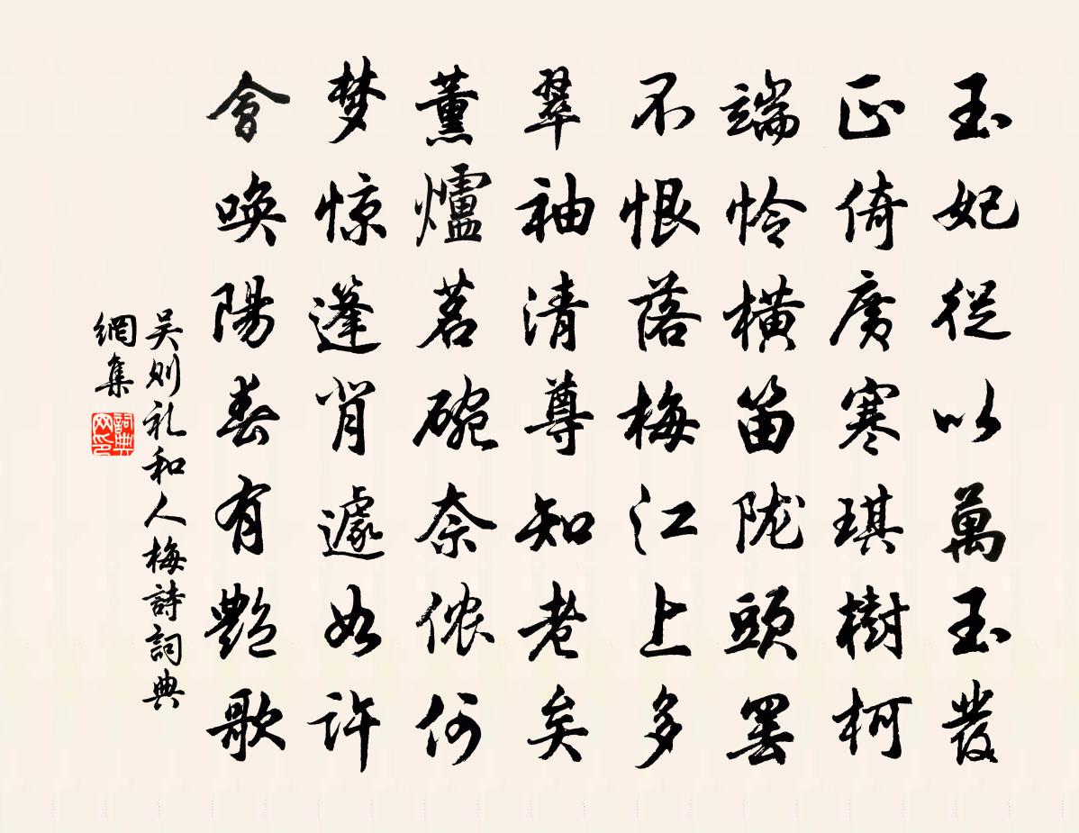 詩詞名句歷史字典書法欣賞書法字典國語詞典說文解字康熙字典古漢語字典標 題 作 者 詩 句 和人梅詩作者:吳則禮 朝代:宋代和人梅詩原文玉妃從以萬玉發,正倚廣寒琪樹柯。端憐橫笛隴頭罷,不恨落梅江上多。翠袖清尊知老矣,薰爐茗碗奈儂何。夢驚篷背遽如許,會喚陽春有艷歌。詩詞問答問:和人梅詩的作者是誰?答:吳則禮問:和人梅詩寫於哪個朝代?答:宋代吳則禮和人梅詩書法欣賞和人梅詩書法作品詩詞推薦定交詩二首效鮑明遠體呈晁無咎黃庭堅〔宋代〕建鼓求亡子,原非入耳歌。除去綠綺塵,水深山峨峨。滿堂悅秦聲,君獨用此何。平分感秋節,空闊湛金波。定夜句尹棟〔宋代〕白苹影蘸無痕水, * 香催未了詩。群花盛開二首何澹〔宋代〕榮觀新移閬苑栽,芳叢炫晝錦花開。誰知妙手參元化,頃刻青紅照玉杯。登環翠樓牟融〔唐代〕山中地僻好藏修,寂寂幽居架小樓。雲樹四圍當戶暝,煙嵐一帶隔簾浮。舉杯對月邀詩興,撫景令人豁醉眸。我亦採桑子馬鈺〔元代〕行屍走骨貪名利,分定剛圖。不念身軀。皮與骷髏作殯居。勸人割斷攀援索,跳出紅爐。整頓元初,有個山侗著力小說引子羅燁〔宋代〕靜坐閒窗對短檠,曾將往事廣搜尋。也題流水高山句,也賦陽春白雪吟。世上是非難入耳,人間名利不關心。編成讀光明經捨身品鄭剛中〔宋代〕摩訶薩埵真奇特,虎口捐知資福德。卻有同時畏避人,後來亦自成彌勒。挽潛齋王樞相王柏〔宋代〕總角思先友,同宗麗澤傳。典刑諸老盡,文獻舊家全。交道從公晚,知音去我先。淵源誰與遡,愁絕伯牙弦。菩薩蠻·月華如水籠香砌孫光憲〔唐代〕月華如水籠香砌,金鐶碎撼門初閉。寒影墮高檐,鉤垂一面簾。碧煙輕裊裊,紅戰燈花笑。即此是高唐,掩屏秋夢長乾曲南朝民歌〔南北朝〕逆浪故相邀,菱舟不怕遙妾家揚子住,便弄廣陵潮。立春帖子太上皇后閣周必大〔宋代〕白玉重鐫冊,黃金再鑄章。宮中饒樂事,大典對春陽。絕句呂岩〔唐代〕捉得金晶固命基,日魂東畔月華西。於中煉就長生藥,服了還同天地齊。莫怪瑤池訊息稀,只緣塵事隔天機。若人往回臨安口號八首蘇泂〔宋代〕道傍舉首揖髯陳,領得秋塘句法新。歸飯客樓隨取別,隔橋相見兩詩人。政府生日十首曹勛〔宋代〕朝回寶勒照金狨,彩服熙熙笑語中。隔坐屏風未為貴,袞衣真是黑頭公。保聖院陳舜俞〔宋代〕門深鎖蒼苔,地靈育嘉樹。寂然煙雲宅,不接市朝路。苟能灰心居,即是古樂處。挽姚景春牟巘五〔宋代〕昔在仙都世,人稱善士門。丘山嘆華屋,風雨長孤根。鶴瘦空餘影,鴻冥更斷魂。植齋書萬卷,喜有外孫存。百字令 贈通庵李道純〔元代〕太初一點,本靈明、元自至純無親。執著些兒千里遠,悟得只消時霎。方寸中虛,纖塵不立,何用調庚甲。承當得初晴方回〔宋代〕雨與花無怨,何其氣候乖。寒於春不便,晴以晚為佳。帆落北風舫,窗明西日齋。意行適鄰圃,可免污吾鞋。和興化趙令君二首劉克莊〔宋代〕落筆昔傳九天上,誅茅今老萬山中。殷勤封內種花令,物色畦間拾穗翁。道是單傳曾雪立,元來一字恥雷同。語君春事陳杰〔宋代〕陽坡春事已全動,陰谷余寒容未收。花雨一番成蝶夢,柳風十日看鶯流。名句推薦救寒莫如重裘,止謗莫如自修。司馬光《資治通鑑·魏紀五》 迸籜分苦節,輕筠抱虛心。柳宗元《巽公院五詠·苦竹橋》 就解佩旗亭,故人相遇。吳文英《掃花游·西湖寒食》 法令至行,公平無私劉向《戰國策·秦一·衛鞅亡魏入秦》 夜寒微透薄羅裳,無限思量。秦觀《畫堂春·春情》 對秋深,離恨苦,數夜滿庭風雨。孫光憲《更漏子·對秋深》 今日清明節,園林勝事偏。賈島《清明日園林寄友人》 一晌凝情無語,手捻梅花何處。王之道《如夢令·一晌凝情無語》 客思吟商還怯。怨歌長、瓊壺暗缺。周密《玉京秋·煙水闊》 吹燈窗更明,月照一天雪。袁枚《十二月十五夜》