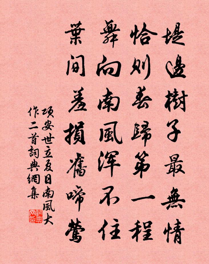 詩詞名句歷史字典書法欣賞書法字典國語詞典說文解字康熙字典古漢語字典標 題 作 者 詩 句 立夏日南風大作二首作者:項安世 朝代:宋代立夏日南風大作二首原文堤邊樹子最無情,恰則春歸第一程。舞向南風渾不住,葉間羞損舊啼鶯。詩詞問答問:立夏日南風大作二首的作者是誰?答:項安世問:立夏日南風大作二首寫於哪個朝代?答:宋代項安世立夏日南風大作二首書法欣賞立夏日南風大作二首書法作品詩詞推薦頌古九首釋思岳〔宋代〕時清休唱太平歌,大冶紅罏著一毛。試向其中撮灰燼,亘天紅焰已周遭。水(一作韓喜詩)韓溉〔唐代〕方圓不定性空求,東注滄溟早晚休。高截碧塘長耿耿,遠飛青嶂更悠悠。瀟湘月浸千年色,夢澤煙含萬古愁。別有謝公輓詞三首歐陽修〔宋代〕樂事與良辰,平生愛洛濱。泉台一閉夜,蒿里不知春。翰墨猶新澤,圖書已素塵。堪憐寢門哭,猶有舊時賓。和張民朝謁建隆寺二次用寫望試筆韻梅堯臣〔宋代〕躍馬侵星去,啼鴉未出巢。春裘風易裂,從騎鐙相敲。紅日雙行柳,黃金一抹梢。乾坤功力大,默誦易中爻。除夜自石湖歸苕溪 其七姜夔〔宋代〕笠澤茫茫雁影微,玉峰重疊護雲衣。長橋寂寞春寒放,只有詩人一舸歸。點絳唇·紅杏飄香蘇軾〔宋代〕紅杏飄香,柳含煙翠拖輕縷。水邊朱戶。盡卷黃昏雨。燭影搖風,一枕傷春緒。歸不去。鳳樓何處。芳草迷歸路。偈頌一百三十六首釋惟一〔宋代〕和暖上元天氣,是處笙歌動地。瑞岩無可設施,隨分放燈一二。壽曾主管陳亮〔宋代〕豫章此夕誕賢良,非霧非煙繞畫堂。正是庭蘭爭秀髮,更當隴麥弄輕黃。一杯為壽滄溟窄,萬口同詞日月長。朝晚夏日山居好十首舒岳祥〔宋代〕夏日山居好,還思童冠時。汗流修舉業,浴罷間題詩。邊事廷紳奏,朝除邸報馳。槐花時節近,新說合新知。寄里中諸友賞菊二首姜特立〔宋代〕問訊故園今若何,不堪歸計尚蹉跎。只應許下千叢菊,今歲雨勻花更多。蘇幕遮 白告友人王哲〔元代〕正青春,紅貌聚。若肯回頭,這下分明覷。願得回頭心早悟。與道為鄰、也處逍遙所。善緣來,惡緣去。搜見真容再賦流觴亭秦觀〔宋代〕仙山游觀甲寰瀛,不比人間自雨亭。歌斷瑤池雲杳杳,酒行金谷水泠泠。珠簾卷雨驚秋近,羅襪凌波笑客醒。月下田園樂賀鑄〔宋代〕昔我未去國,幽棲淇上村。分辭俠少事,喜與農老言。農老孰追從,四鄰皆世婚。機中工織婦,籍上成丁孫。青駒偈六十九首釋道寧〔宋代〕行腳高士,撥草瞻風。未透目前關,難明心地印。黃家莊林逋〔宋代〕黃家莊畔一維舟,總是沿流好宿頭。野興幾多尋竹徑,風情些小上茶樓。遙村雨暗鳴寒犢,淺漵沙平下晚鷗。更有秋風謠張耒〔宋代〕秋風起,秋雲高。連山草木如波濤,大江盪潏魚龍逃。羲和奔忙日車逸,八柱傾側恐不牢。柯山老人揜蓬茅,畏寒游山七絕訾家洲張釜〔宋代〕訾洲風物柳州文,開□□□□夢魂。老去一西裝酬望眼,淡煙衰草連村。再游南華有祖師衣缽曾豐〔宋代〕西方達磨問歸程,衣缽都留作麽生。正道眼空嫌長物,如何更帶履同行。乾荷葉劉秉忠〔元代〕乾荷葉,色蒼蒼,老柄風搖盪,喊了清香。越添黃。都因昨夜一場霜,寂寞在秋江上。華岳下題西王母廟李商隱〔唐代〕神仙有分豈關情,八馬虛隨落日行。莫恨名姬中夜沒,君王猶自不長生。名句推薦禍福將至,善必先知之;不善,必先知之。故至誠如神。子思《中庸·第二十四章》 兒童漫相憶,行路豈知難。元好問《倪莊中秋》 守分安命,順時聽天。朱柏廬《朱子家訓·全文》 人之生不能無群荀子《荀子·富國》 春遊之盛,西湖未能過也。姜夔《琵琶仙·雙槳來時》 春風不相識,何事入羅幃。李白《春思》 籬落疏疏一徑深,樹頭花落未成陰。楊萬里《宿新市徐公店》 雁引愁心去,山銜好月來。李白《與夏十二登岳陽樓》 好面譽人者,亦好背而毀之。莊子《莊子·雜篇·盜跖》 千金縱買相如賦,脈脈此情誰訴。辛棄疾《摸魚兒·更能消幾番風雨》