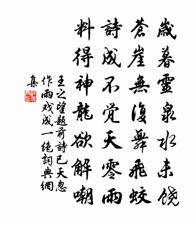 詩詞名句歷史字典書法欣賞書法字典國語詞典說文解字康熙字典古漢語字典標 題 作 者 詩 句 題前詩已天忽作雨戲成一絕作者:王之望 朝代:宋代題前詩已天忽作雨戲成一絕原文歲暮靈泉水未饒,蒼崖無復舞飛蛟。詩成不覺天零雨,料得神龍欲解嘲。詩詞問答問:題前詩已天忽作雨戲成一絕的作者是誰?答:王之望問:題前詩已天忽作雨戲成一絕寫於哪個朝代?答:宋代王之望題前詩已天忽作雨戲成一絕書法欣賞題前詩已天忽作雨戲成一絕書法作品詩詞推薦游玄真觀李中〔唐代〕閒吟遊古觀,靜慮相神仙。上景非難度,陰功不易全。醮壇松作蓋,丹井蘚成錢。浩浩紅塵里,誰來叩自然。醉落魄/一斛珠晏幾道〔宋代〕休休莫莫。離多還是因緣惡。有情無奈思量著。月夜佳期,近寫青箋約。心心口口長恨昨。分飛容易當時錯。後期次乞米韻楊萬里〔宋代〕魯公尚有粥為食,盧老今無僧作鄰。文字借令真可煮,吾曹從古不應貧。詩腸幸自無煙火,句眼何愁著點塵。俗子梅四首劉鑒〔宋代〕除香除影賦梅花,方許詩中擅作家。怕俗似嫌羔作酒,高人頗稱雪煎茶。參橫屋角霜初人,人倚闌乾月欲斜。夜冷滿江紅侯置〔宋代〕困頓春眠,無情思、夢魂飄泊。檐外雨、霏霏冉冉,乍睛還落。山黛四圍頻入眼,柳絲一縷低縈閣。念沈郎、多感壽興國守李秩〔宋代〕縹緲黃堂擁瑞煙,神光照社記當年。風雲慶會千齡際,萸菊佳辰六日前。盪節已嘗煩出使,輔藩聊復賴於宣。廟堂長安臥病清江〔唐代〕身世足堪悲,空房臥病時。捲簾花雨滴,掃石竹陰移。已覺生如夢,堪嗟壽不知。未能通法性,詎可免支離。戲贈米元章二首黃庭堅〔宋代〕我有玄暉古印章,印刓不忍與諸郎。虎兒筆力能江鼎,教字玄暉繼阿章。蘐草趙蕃〔宋代〕伯兮當日意,蘐也直雲忘。豈是名茲草,真將種北堂。能叢又能幹,非絳復非黃。開處陰當合,看時晝閱長。賦園中所有十首蘇轍〔宋代〕南園地性惡,雙柏不得長。蓬麻春始生,今已滿一丈。柏生嗟幾年,失意自棲愴。有子壓枝低,已老非少壯。尤柏夢井元稹〔唐代〕夢上高高原,原上有深井。登高意枯渴,願見深泉冷。裴迴繞井顧,自照泉中影。沉浮落井瓶,井上無懸綆。念此贈內白居易〔唐代〕漠漠暗苔新雨地,微微涼露欲秋天。莫對月明思往事,損君顏色減君年。永王東巡歌·其二李白〔唐代〕三川北虜亂如麻,四海南奔似永嘉。但用東山謝安石,為君談笑淨胡沙。題金陵王冕〔元代〕賞心亭前春草花,賞心亭下柳生芽。收功漫說韓擒虎,亡國豈由張麗華。江山萬古足登覽,豪傑幾人過嘆嗟。野老朱明洞天陳元晉〔宋代〕南來大艑凌空浮,卸帆試略羅浮秋。胸中無機神仙喜,筆底光怪山靈愁。山泉夜作糟床滴,風松閃冉青旗色。招我見蜂采檜花偶作陸游〔宋代〕來禽海棠相續開,輕狂蛺蝶去還來。山蜂卻是有風味,偏采檜花供蜜材。離夜聽琴詩何遜〔南北朝〕別離既有緒。琴瑟反在悲。美人多怨態。亦復慘長眉。道子教授奉祠,諸生率余祖席如意院范成大〔宋代〕暫移三席款雲關,木末闌乾暮紫間。絳帳莫貪江上路,青鞋先試水西山。伯陽有道來重趼,禦寇他年憶解顏。怪我題噴玉泉(泉在壽安山下高百餘尺直瀉潭中)白居易〔唐代〕泉噴聲如玉,潭澄色似空。練垂青嶂上,珠瀉綠盆中。溜滴三秋雨,寒生六月風。何時此岩下,來作濯纓翁。浣溪沙·徐邈能中酒聖蘇軾〔宋代〕徐邈能中酒聖賢,劉伶席地幕青天,潘郎白璧為誰連。無可奈何新白髮,不如歸去舊青山,恨無人借買山錢。名句推薦人生一世,草長一春。佚名《增廣賢文·上集》 舊時茅店社林邊,路轉溪橋忽見。辛棄疾《西江月·夜行黃沙道中》 望長城內外,惟余莽莽;大河上下,頓失滔滔。 * 《沁園春·雪》 十日春寒不出門,不知江柳已搖村。蘇軾《正月二十日往岐亭郡人潘古郭三人送余於女王城東禪莊院》 一看腸一斷,好去莫回頭。白居易《南浦別》 斷送一生憔悴,只銷幾個黃昏。趙令畤《清平樂·春風依舊》 合軍聚眾, 務在激氣孫臏《孫臏兵法·延氣》 不忍登高臨遠,望故鄉渺邈,歸思難收。柳永《八聲甘州·對瀟瀟暮雨灑江天》 馬上逢寒食,愁中屬暮春。宋之問《途中寒食題黃梅臨江驛寄崔融》 勤苦守恆業,始有數月糧。黃燮清《秋日田家雜詠》