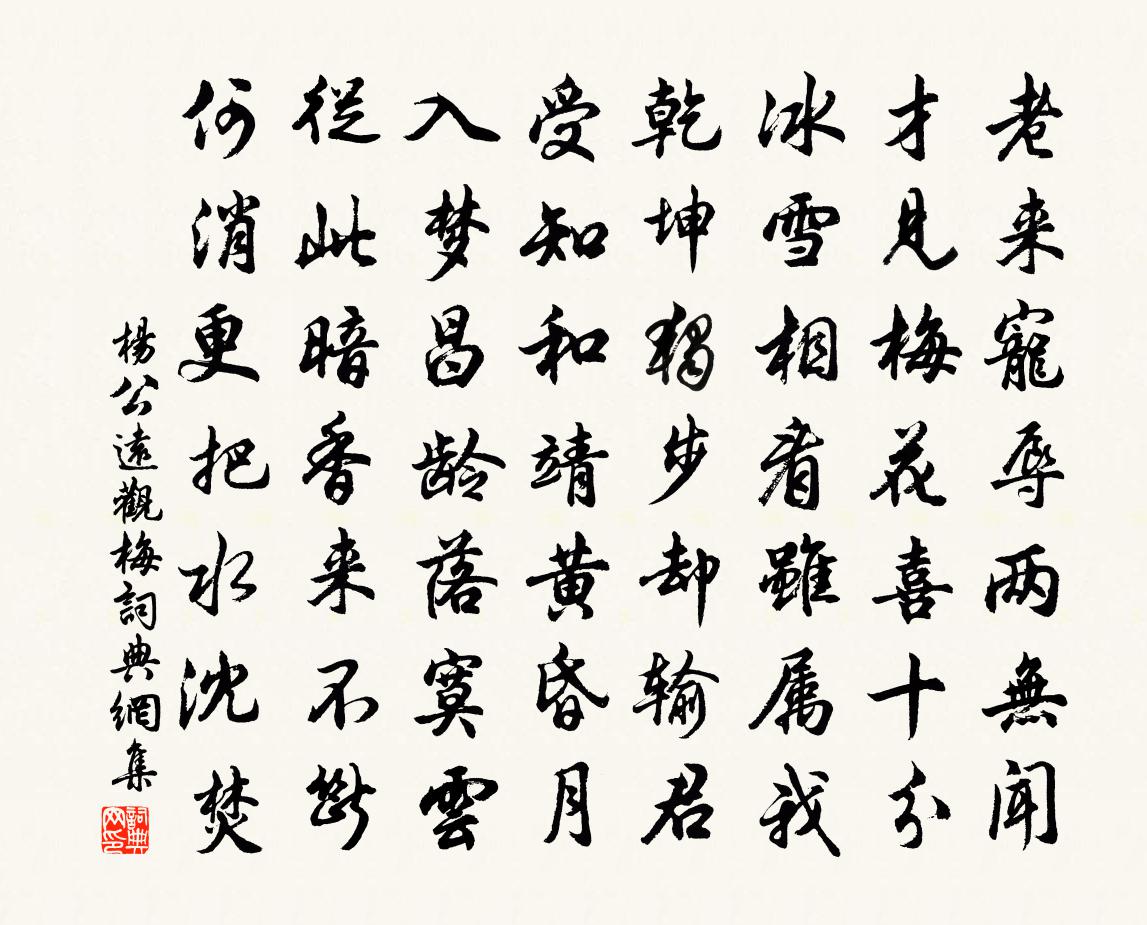 詩詞名句歷史字典書法欣賞書法字典國語詞典說文解字康熙字典古漢語字典標 題 作 者 詩 句 觀梅作者:楊公遠 朝代:宋代觀梅原文老來寵辱兩無聞,才見梅花喜十分。冰雪相看雖屬我,乾坤獨步卻輸君。受知和靖黃昏月,入夢昌齡落寞雲。從此暗香來不斷,何消更把水沈焚。詩詞問答問:觀梅的作者是誰?答:楊公遠問:觀梅寫於哪個朝代?答:宋代楊公遠觀梅書法欣賞觀梅書法作品詩詞推薦送蕭尚書致仕歸廬陵徐鉉〔唐代〕江海分飛二十春,重論前事不堪聞。主憂臣辱誰非我,曲突徙薪唯有君。金紫滿身皆外物,雪霜垂領便離群。鶴歸南海使院對菊懷丁卯別墅許渾〔唐代〕何處曾移菊,溪橋鶴嶺東。籬疏還有艷,園小亦無叢。日晚秋煙里,星繁曉露中。影搖金澗水,香染玉潭風。罷酒和魯漕喜雨韻吳芾〔宋代〕下車逢好雨,清興一何長。暑退郊原爽,風生院落京。登樓延夜月,繞樹探秋香。況得陪詩社,從容樂歲穰。游南嶽風雪未已決策登山用春風樓韻張栻〔宋代〕人言南山巔,煙雲聳樓觀。俯瞰了坤倪,抑攀接天漢。勇往愧未能,長吟湘水畔。茲來渺遐思,風雪豈中斷。行行張黎州輓詩項安世〔宋代〕萬里沈黎徼,民夷雜戌屯。金錢寬兩稅,水澤潤千門。肅肅猩鼯靜,潭潭壁壘尊。遠猷嗟未究,蕭瑟定安原。東湖湯餅後進翁展墓飲嵩山踏雨泳歸在行相繼張埴〔宋代〕溪橋三日雨輕過,歸影蒼涼雨奈何。詩落邙山松柏後,相看有愧少陵多。和鄭巽坡詠菊並見寄韻二首李曾伯〔宋代〕天涯秋晚見孤芳,華發蕭騷易感傷。對酒未嘗忘北海,因詩惟恐瘦東陽。古心翻得風霜白,冷艷寧隨草木黃。惟屈和浙東童倉使建昌家圃梅花玉雪亭詩三首宋伯仁〔宋代〕雲繞疏籬水繞亭,主人清處著梅清。雖然借得坡翁意,人與梅花更有情。天台清溪釋行海〔宋代〕碧草生芽鳥弄春,短長亭外柳條新。釣船來往清溪上,定有桃花洞裡人。解昭君怨王睿〔唐代〕莫怨工人醜畫身,莫嫌明主遣和親。當時若不嫁胡虜,只是宮中一舞人。七月二十五日登舟傅察〔宋代〕暫來征騎出者闉,卻棹扁舟下小津。颯颯西風如送客,蕭蕭晚雨欲留人。一年蹤跡無停日,千里羈游又遠親。為問謝人惠丹藥齊己〔唐代〕別後聞餐餌,相逢訝道情。肌膚紅色透,髭發黑光生。仙洞誰傳與,松房自煉成。常蒙遠分惠,亦覺骨毛輕。句廖知彰〔宋代〕天匠矜功價不貲,神機刳石漏新暉。富池江上蕩舟游望二首董嗣杲〔宋代〕上江落水渺莽中,入軍遡水曲折通。此鎮巧當兩汊路,每日飽看千帆風。客知鼓棹白日急,人傷對鏡玄發空。荒寒遣憤杜甫〔唐代〕聞道花門將,論功未盡歸。自從收帝里,誰復總戎機。蜂蠆終懷毒,雷霆可震威。莫令鞭血地,再濕漢臣衣。偈頌一百零九首釋可湘〔宋代〕見鞭影而行已非良馬,聽板聲打坐豈是禪流。參須自參,悟須自悟。少林孤坐接神光,更無一句閒言語。應制太清樓觀書寇準〔宋代〕仙禁開書府,神毫紀格言。簡編包舜禹,圍范總乾坤。稽古崇契教,斯文闢聖門。從游觀奧秘,何以報宸恩。秦淮海圖唐寅〔明代〕淮海修真遺麗華,它言道是我言差。金丹不了紅顏別,地下相逢兩面沙。贈古鑒相士姚勉〔宋代〕以古為名便異今,況能有鑒照人心。舊聞古鑒知興替,借與清朝獻六箴。劉氏銅像方信孺〔宋代〕霸業淒涼一炬休,鑄金為像亦狂謀。五湖但說鴟夷子,千古誰知恩赦侯。名句推薦鳥宿池邊樹,僧敲月下門。賈島《題李凝幽居》 若農服田力穡,乃亦有秋。佚名《尚書·商書·盤庚上》 涓涓不壅,終為江河佚名《孔子家語·觀周》 別來半歲音書絕,一寸離腸千萬結。韋莊《應天長·別來半歲音書絕》 死去元知萬事空,但悲不見九州同。陸游《示兒》 淡盪春光寒食天。玉爐瀋水裊殘煙。李清照《浣溪沙·淡盪春光寒食天》 天階夜色涼如水,臥看牽牛織女星。杜牧《秋夕》 從心所欲,不逾矩。孔子弟子《論語·為政篇》 畢竟西湖六月中,風光不與四時同。楊萬里《曉出淨慈寺送林子方》 荷葉五寸荷花嬌,貼波不礙畫船搖;石濤《荷花》