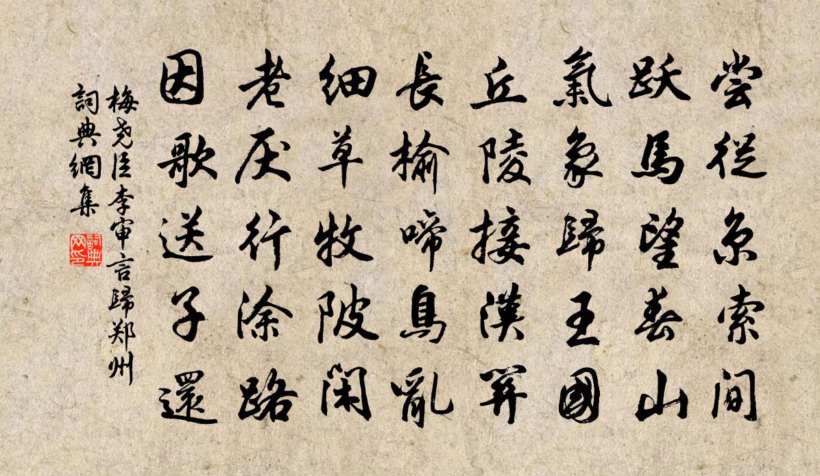 詩詞名句歷史字典書法欣賞書法字典國語詞典說文解字康熙字典古漢語字典標 題 作 者 詩 句 李審言歸鄭州作者:梅堯臣 朝代:宋代李審言歸鄭州原文嘗從京索間,躍馬望春山。氣象歸王國,丘陵接漢關。長榆啼鳥亂,細草牧陂閒。老厭行塗路,因歌送子還。詩詞問答問:李審言歸鄭州的作者是誰?答:梅堯臣問:李審言歸鄭州寫於哪個朝代?答:宋代問:梅堯臣的名句有哪些?答:梅堯臣名句大全梅堯臣李審言歸鄭州書法欣賞李審言歸鄭州書法作品詩詞推薦漁父·漁父笑蘇軾〔宋代〕漁父笑,輕鷗舉。漠漠一江風雨。江邊騎馬是官人,借我孤舟南渡。戲題大年防禦蘆雁黃庭堅〔宋代〕揮毫不作小池塘,蘆荻江村落雁行。雖有珠簾藏翡翠,不忘煙雨罩鴛鴦。上翁嶺曾鞏〔宋代〕放車秋崖望,所得過舊聞。初疑古軸畫,山水秋毫分。時見崖下雨,多從衣上雲。濯足行尚側,心憂踏天文。八荒初冬快晴陪宣卿叔夏遊石頭庵過三生藏窮深極胡寅〔宋代〕凍雨籠山秀木冰,斜陽側鏡遠峰澄。罷妝群玉褰雲障,寶髻珠花幾萬層。新樓詩二十首水寺李紳〔唐代〕煙波野寺經過處,水國蒼茫夢想中。雲散浦間江月迥,日曛洲渚海潮通。坐看魚鳥沈浮遠,靜見樓台上下同。聞道費征君舊居張蠙〔唐代〕浮世拋身外,棲蹤入九華。遺篇補樂府,舊籍隸仙家。池靜龜升樹,庭荒鶴隱花。古來天子命,還少到煙霞。醉中步月湖上陸游〔宋代〕閏余時節早,天氣已淒冷。悠哉曳杖行,樂此清夜永。霜風鎪病骨,林月寫孤影。新詩得復忘,薄酒吹易醒。浮生毗山之居不皆竹也而其所尚友獨在竹遂擅此山牟巘五〔宋代〕山人猶未出山時,風月雲煙總為詩。笑問年來間何闊,此盟應有此君知。句劉接〔宋代〕湛湛直通龍渡水,虢虢傍過鹿頭山。贈送行六子陳造〔宋代〕引身漂然不繫舟,呂梁灩澦皆安流。江湖萬頃浮一鷗,此心元世常休休。吳山楚水紀所由,湘纍老枚寧匹儔。琢句將至地黃灘楊萬里〔宋代〕未到地黃灘,十里先聞聲。檣竿已震掉,未敢與渠爭。舟人各整篙,有如大敵臨。搴篷試一望,濺雪紛淙琤。乃是丁丑偶書楊簡〔宋代〕物物皆吾體,心心是我思。四時非代謝,萬說不支離。澗水談顏樂,松風詠晳詞。仲尼親許可,實語斷非欺。登採石山上廣濟寺梅堯臣〔宋代〕船從山下過,直上見僧軒。系纜當磯石,緣崖到寺門。短籬遮竹瀁,危路踏松根。卻看滄江底,帆歸煙外昏。久欲乞歸未得一日蒙恩放歸不勝欣喜塗中得十吳芾〔宋代〕淡煙斜日媚郊原,中有人家似輞川。地側忽驚車馬過,三三兩兩竹籬邊。草詞畢遇芍藥初開因詠小謝紅藥當階翻詩…偶成十六韻白居易〔唐代〕罷草紫泥詔,起吟紅藥詩。詞頭封送後,花口拆開時。坐對鉤簾久,行觀步履遲。兩三叢爛熳,十二葉參差。背日又酬曉燈離暗室五首戴叔倫〔唐代〕知疑奸叟謗,閒與情人話。猶是別時燈,不眠同此夜。寒燈揚曉焰,重屋驚春雨。應想遠行人,路逢泥濘阻。燈光春江白居易〔唐代〕炎涼昏曉苦推遷,不覺忠州已二年。閉閣只聽朝暮鼓,上樓空望往來船。鶯聲誘引來花下,草色勾留坐水邊。唯有句周文璞〔宋代〕淡煙疏雨又青山。戲呈鳳凰長老用師文同〔宋代〕七十頭陀會語言,舌根流利口闌珊。羅浮居士最難奈,穩把無弦琴與彈。三代門太公周曇〔唐代〕昌獵關西紂獵東,紂憐崇虎棄非熊。危邦自謂多麟鳳,肯把王綱取釣翁。名句推薦秋花冒綠水,密葉羅青煙。李白《古風·其五十九》 驚起卻回頭,有恨無人省。蘇軾《卜運算元·黃州定慧院寓居作》 眼痛滅燈猶暗坐, 逆風吹浪打船聲。白居易《舟中讀元九詩》 催成清淚,驚殘孤夢,又揀深枝飛去。陸游《鵲橋仙·夜聞杜鵑》 低花樹映小妝樓,春入眉心兩點愁。白居易《春詞》 路漫漫其修遠兮,吾將上下而求索。屈原《離騷》 匹馬南來渡浙河,汴城宮闕遠嵯峨。于謙《岳忠武王祠》 獨往獨來,獨出獨入,孰能礙之?列子及其弟子《列子·力命》 日月忽其不淹兮,春與秋其代序。屈原《離騷》 罪至重而刑至輕,庸人不知惡矣,亂莫大焉。荀子《荀子·正論》