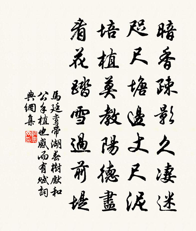 詩詞名句歷史字典書法欣賞書法字典國語詞典說文解字康熙字典古漢語字典標 題 作 者 詩 句 帶湖春樹先和公手植也感而有賦作者:馬廷鸞 朝代:宋代原文暗香疎影久淒迷,咫尺塘邊丈尺泥。培植莫教陽德盡,看花踏雪過前堤。詩詞問答問:《帶湖春樹先和公手植也感而有賦》的作者是誰?答:馬廷鸞問:該詩寫於哪個朝代?答:宋代書法欣賞帶湖春樹先和公手植也感而有賦書法作品詩詞推薦夜警趙濟〔宋代〕滿城警柝喧深夜,半壁青燈動客心。烽火未除眠不得,欲將長劍倚危岑。偶至東堂范成大〔宋代〕岸幘蕭騷雪滿簪,一閒真是直千金。歸來栗里多情話,病後香山少醉吟。久坐 * 焦葉放,閒拖藜杖蘚花深。飢時臨江仙石孝友〔宋代〕一霎狂雲驚雨過,月華恰到簾帷。檻前疊石翠參差。洞房相見處,燈 * 涼時。睡玉眠花愁夜短,匆匆共惜佳期。句諶祜〔宋代〕花閒笑語從雲散,天下英雄豈陸沈。寄贈長安宋澥逸人十韻魏野〔宋代〕家盛翻嘉遁,誰同物外情。徵君為密友,內翰是難兄。靜論儒宗服,狂歌俠少驚。道裝輕紫綬,酒旆勝紅旌。將相次丹元姚先生韻二首蘇軾〔宋代〕不學劉更生,黃金鑄上方。不學房次律,身事問潁陽。王烈亦何人,叔夜未可量。獨見神山開,遽餐石髓香。至道滿江紅侯置〔宋代〕困頓春眠,無情思、夢魂飄泊。檐外雨、霏霏冉冉,乍睛還落。山黛四圍頻入眼,柳絲一縷低縈閣。念沈郎、多感崔九弟欲往南山馬上口號與別王維〔唐代〕城隅一分手,幾日還相見。山中有桂花,莫待花如霰。旅舍書懷寄所知二首羅隱〔唐代〕思量前事不堪尋,牢落余情滿素琴。四海豈無騰躍路,一家長有別離心。道從汩沒甘雌伏,跡恐因循更陸沈。寂寞油紙燈二首賈似道〔宋代〕頭圓腿壯遍身黃,翅滑如油肉帶蒼。牙鉗一對如紅色,此物蟲中是霸王。賀新涼/賀新郎林正大〔宋代〕蘭亭當日事。有崇山、茂林修竹,群賢畢至。湍急清流相映帶,旁引流觴曲水。但暢敘、幽情而已。一詠一觴真足次韻程弟方岳〔宋代〕此腹寧須文字香,漫淹虀瓮半青黃。午窗一枕齁齁睡,世上何人最得忙。酬紹興梁監酒項安世〔宋代〕伯鸞長嘯出東都,來卜龍邱二畝居。千歲仍昆作英文,五噫文采尚周餘。胸中萬卷未得力,堂下一言誰識渠。我亦晨雪渡洑陂鄧深〔宋代〕竹處楊枝學小梅,竹間茅屋白皚皚。撐舟獨擁蓑衣出,堪畫何須待晚來。賀收復秦原諸州詩白敏中〔唐代〕一詔皇城四海頒,醜戎無數束身還。戍樓吹笛人休戰,牧野嘶風馬自閒。河水九盤收數曲,天山千里鎖諸關。西邊贈閭丘宿松李白〔唐代〕阮籍為太守,乘驢上東平。剖竹十日間,一朝風化清。偶來拂衣去,誰測主人情。夫子理宿松,浮雲知古城。掃地劉吏部輓詞樓鑰〔宋代〕誰擾奚山眾,焚林獸已窮。徙薪能遠慮,下瀨得深攻。南嶠肩隨息,中朝論愈公。但知分謗喜,寧肯自論功。紹興以後祀五方帝六十首佚名〔宋代〕練以纁黃,有篚將之。肸鄉斯答,有神昭之。維神於民,實媽貨食。歸德報功,敢怠王國。慢卷綢(雙調)柳永〔宋代〕閒窗燭暗,孤幃夜永,欹枕難成寐。細屈指尋思,舊事前歡,都來未盡,平生深意。到得如今,萬般追悔。空只添八年正月天慶節上清宮行香錫慶院御筵日揚輝夏竦〔宋代〕實籙標嘉節,需雲錫惠筵。烈暉騰愛景,瑞彩擬非煙。焜燿璇霄外,輪囷絳闕前。居歆方屢告,偉兆溢祥編。名句推薦欲渡黃河冰塞川,將登太行雪滿山。李白《行路難·其一》 明眸皓齒誰復見,只有丹青余淚痕。蘇軾《虢國夫人夜遊圖》 酒賤常愁客少,月明多被雲妨。蘇軾《西江月·世事一場大夢》 但使龍城飛將在,不教胡馬度陰山。王昌齡《出塞二首》 龜靈未免刳腸患,馬失應無折足憂。白居易《放言五首·其二》 望處雨收雲斷,憑闌悄悄,目送秋光。柳永《玉蝴蝶·望處雨收雲斷》 里仁為美,擇不處仁,焉得知?孔子弟子《論語·里仁篇》 柳帶搖風漢水濱,平蕪兩岸爭勻。牛希濟《臨江仙·柳帶搖風漢水濱》 貧賤之知不可忘,糟糠之妻不下堂。范曄《後漢書·列傳·伏侯宋蔡馮趙牟韋列傳》 經一失長一智馮夢龍《警世通言·卷三》